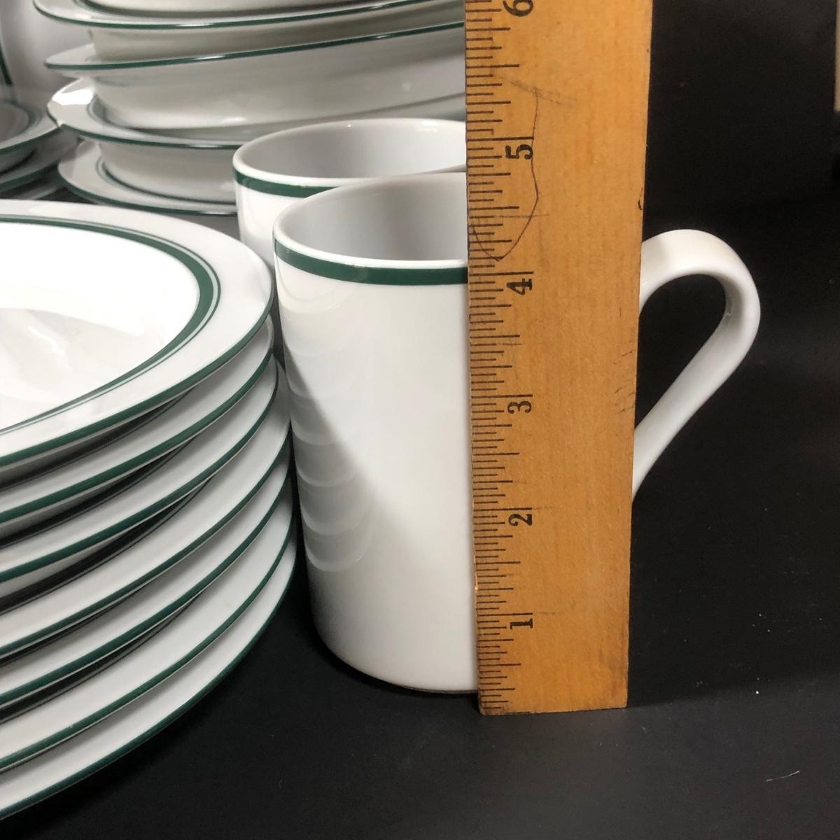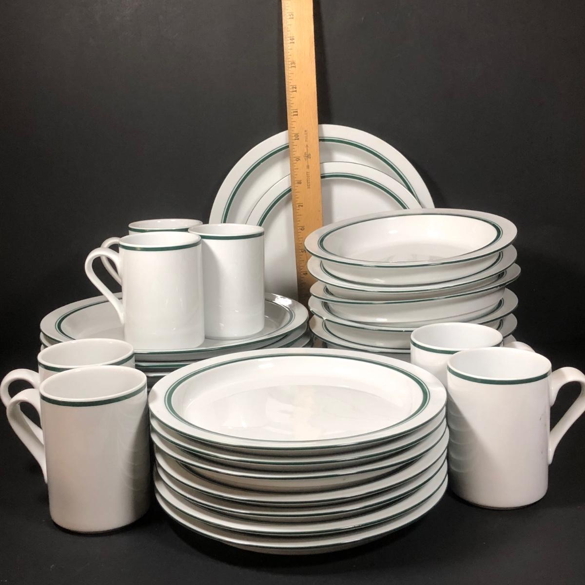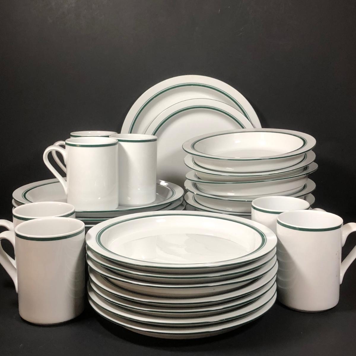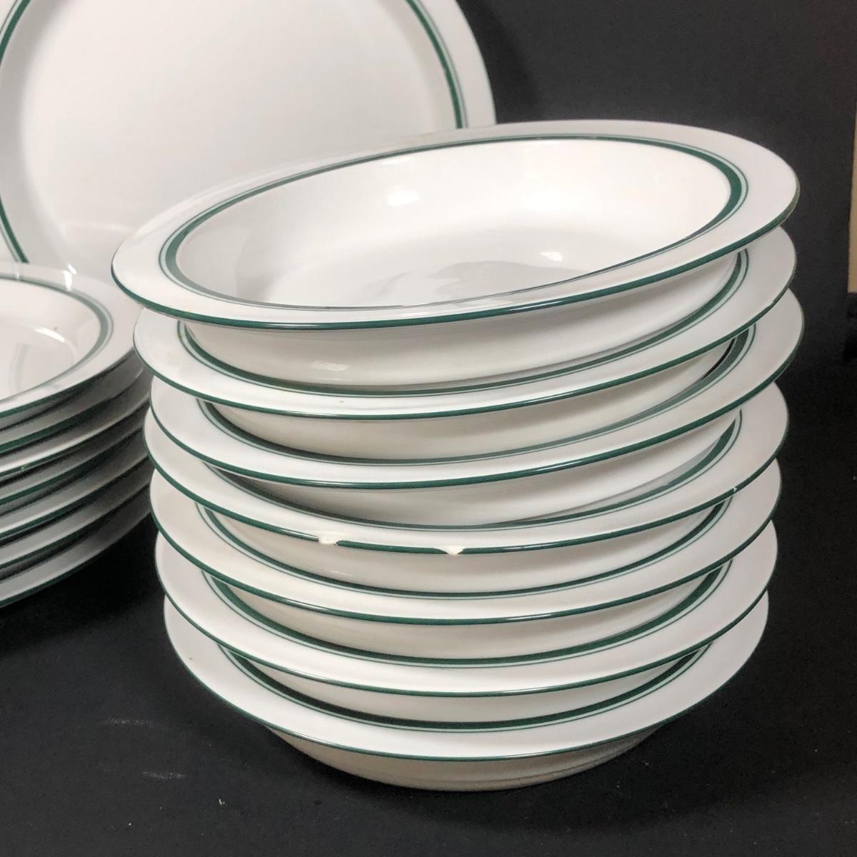 LOT 145K: Dansk Bistro International Green Stripe Plates, Mugs & Bowls