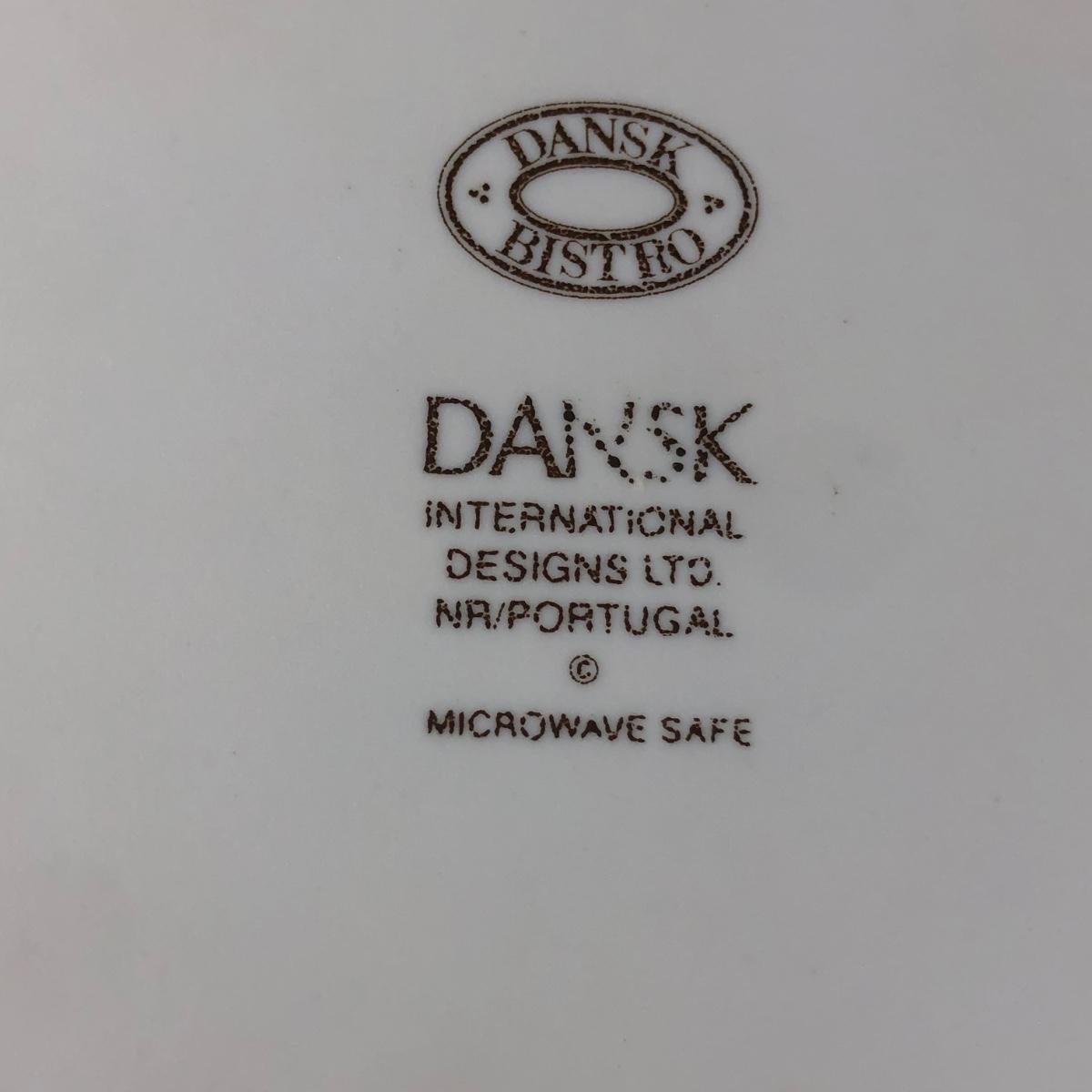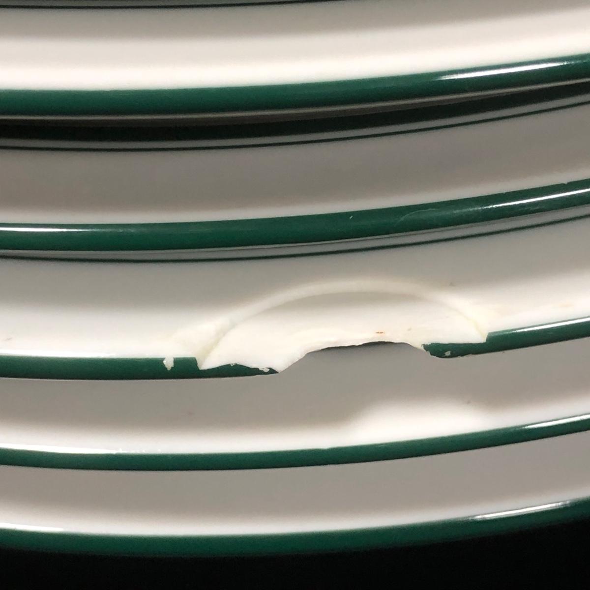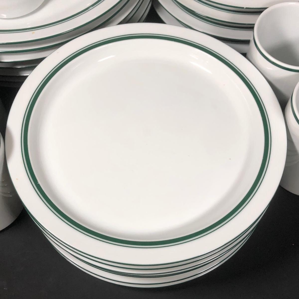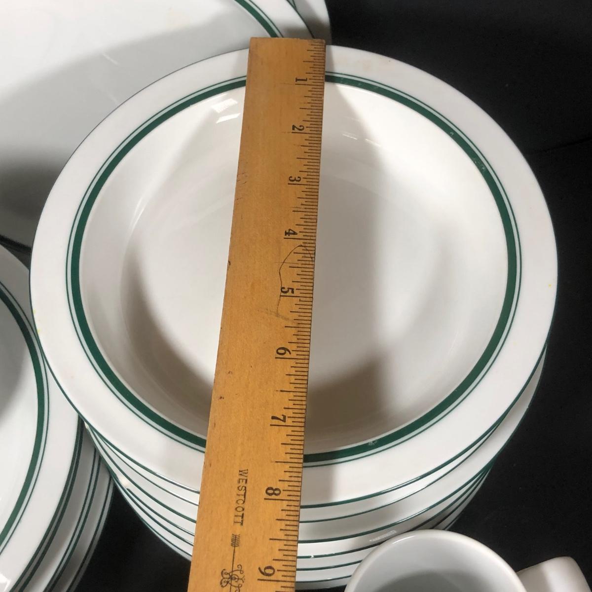 LOT 145K: Dansk Bistro International Green Stripe Plates, Mugs & Bowls