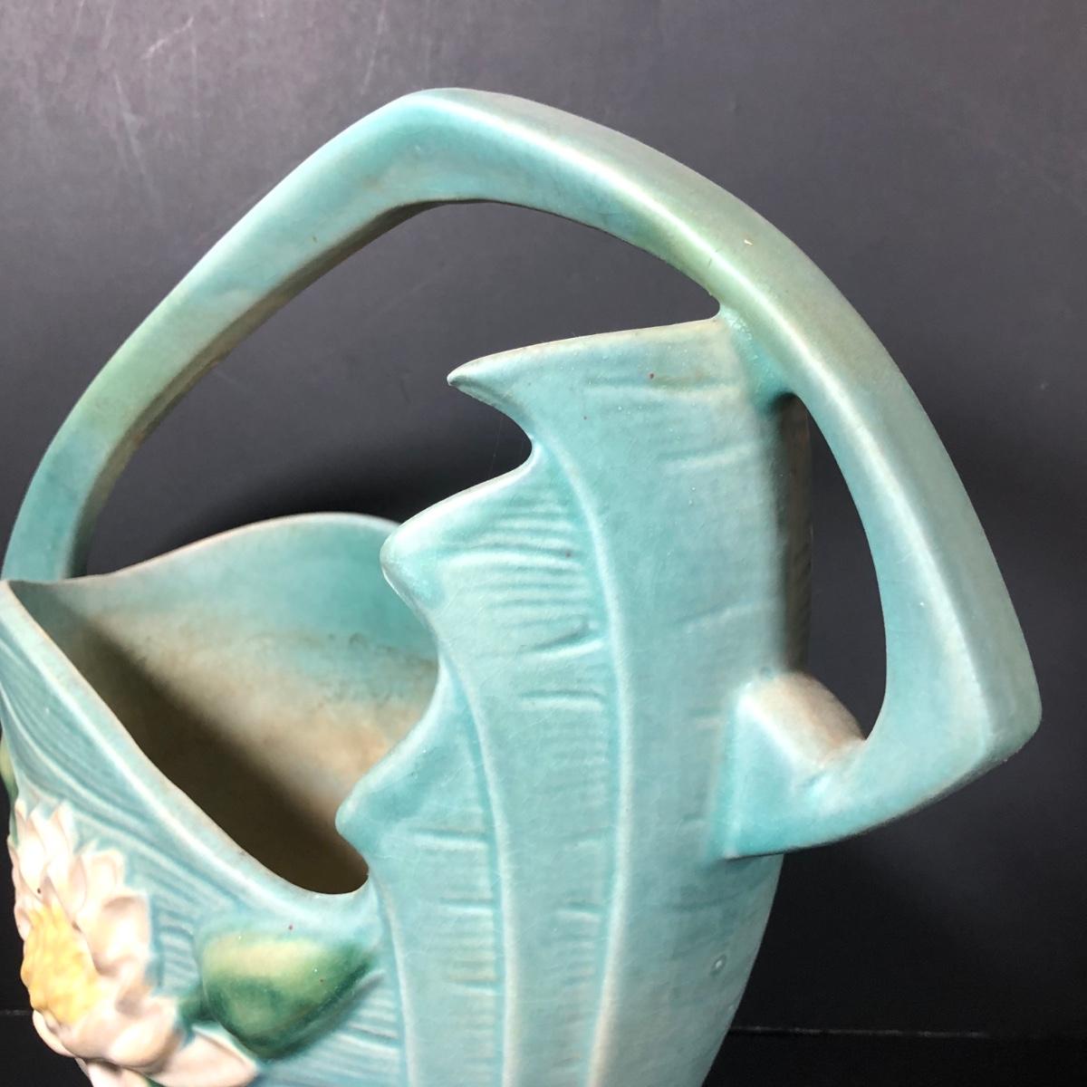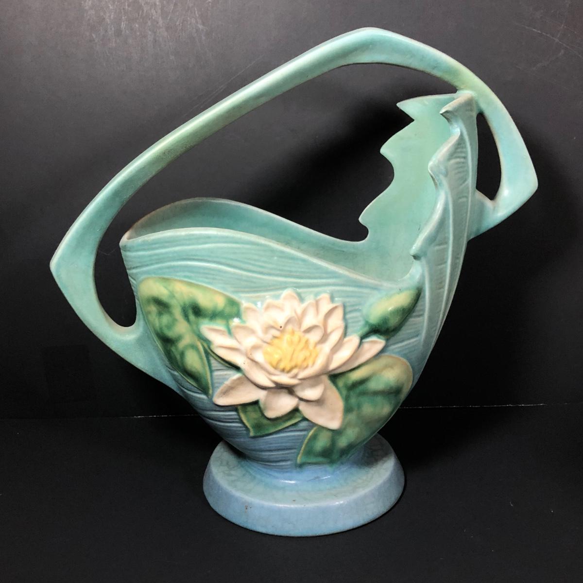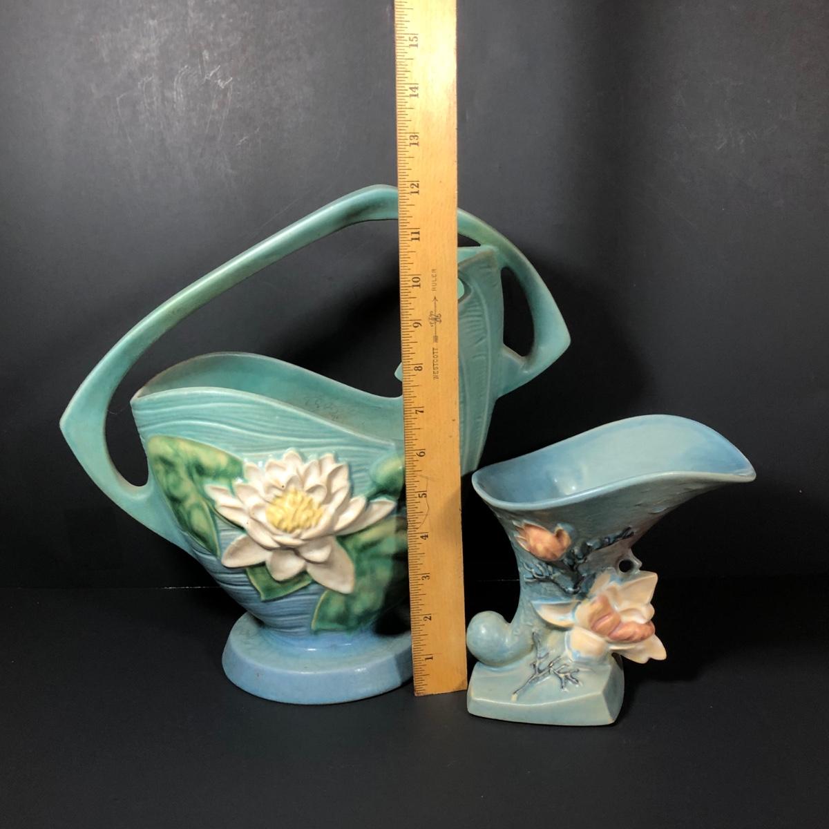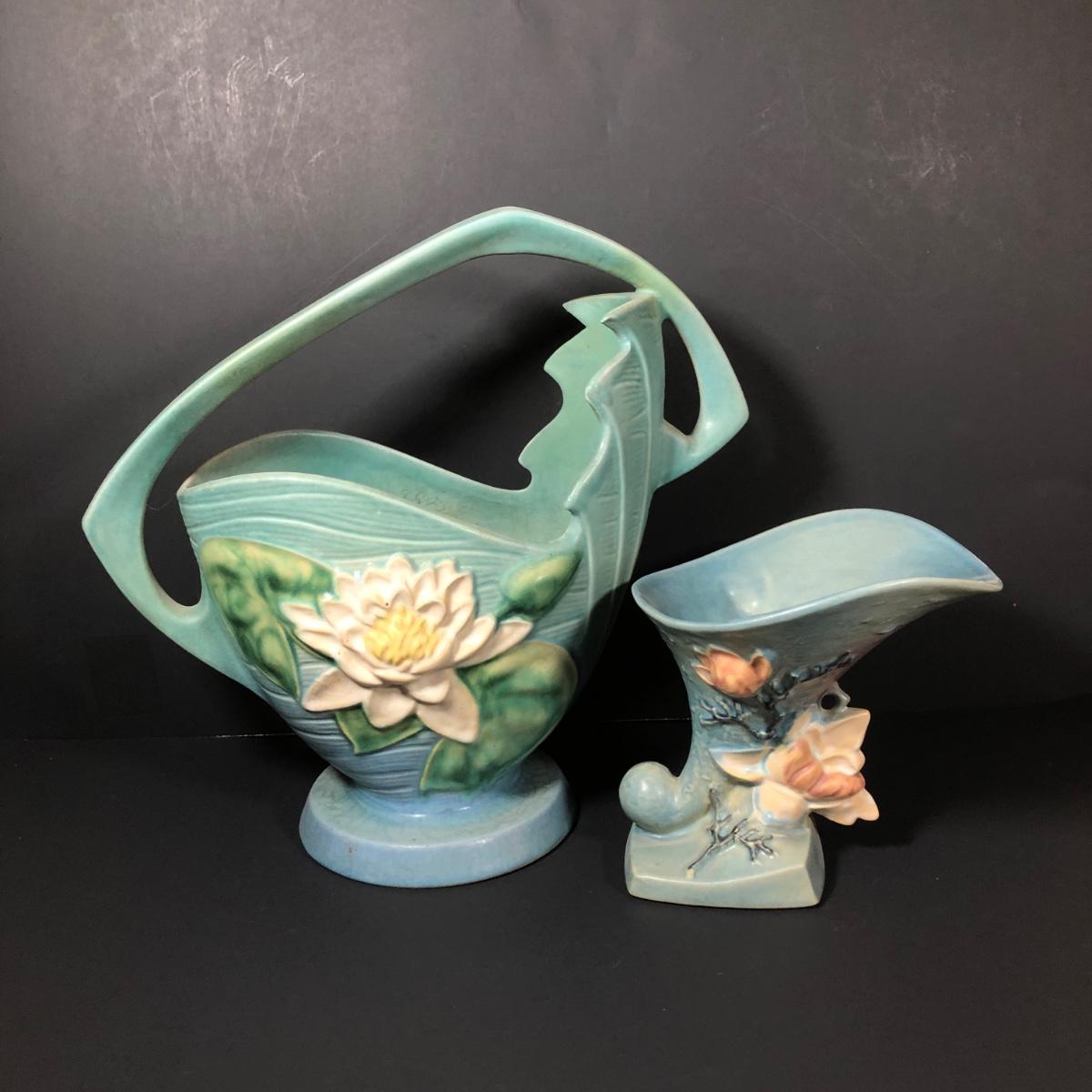 LOT 163F: Vintage Roseville Pottery - 1943 Blue Magnolia (184-6") & Water Lily Handled Basket (382-12")