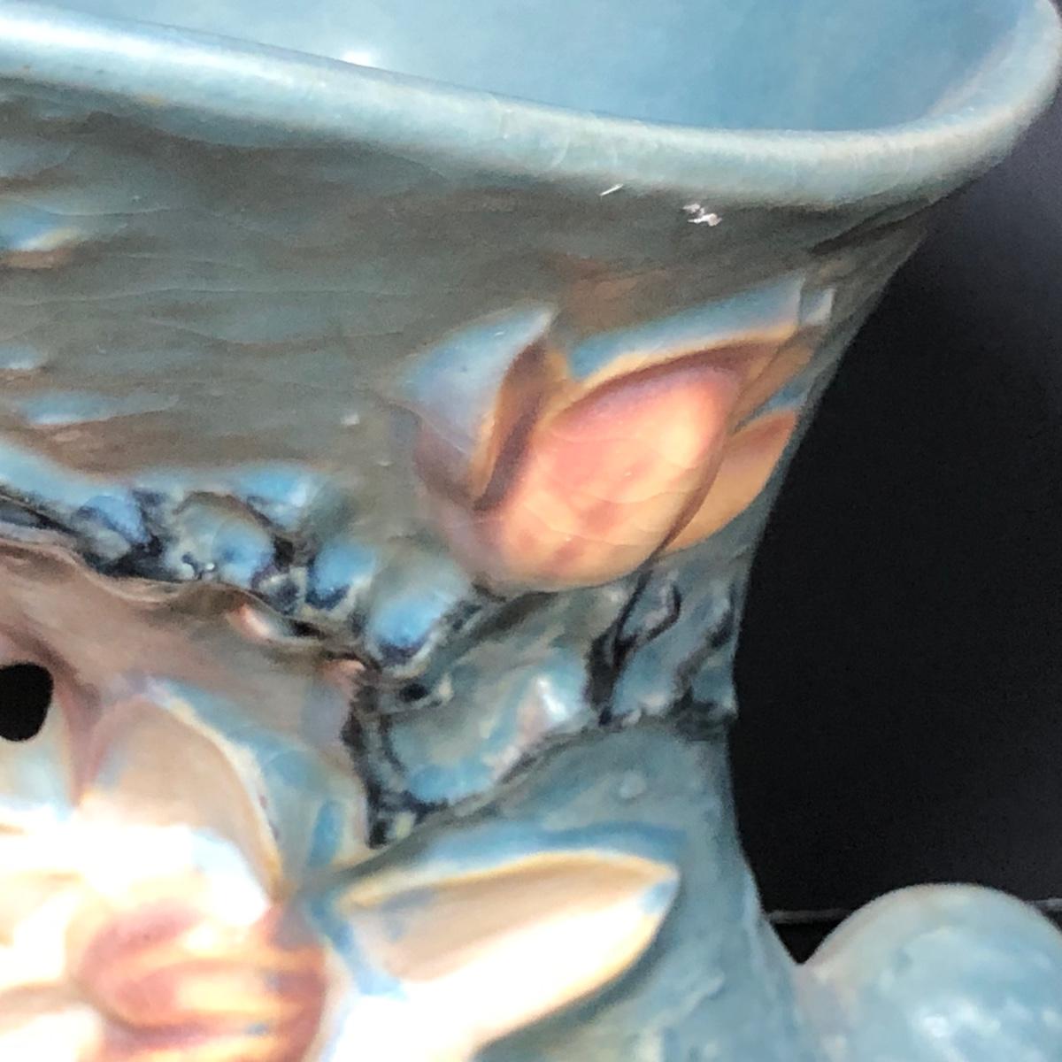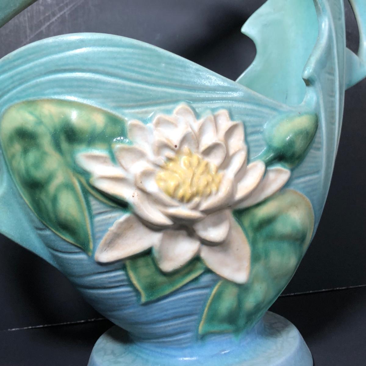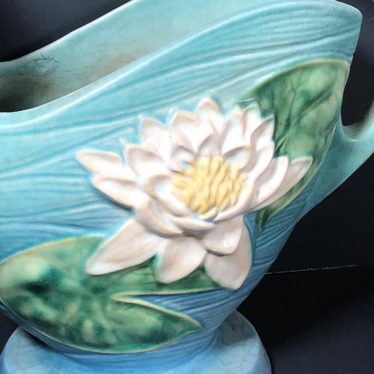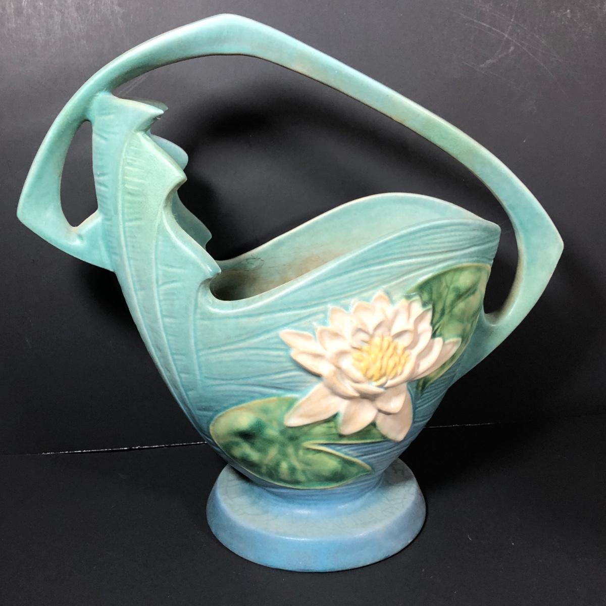 LOT 163F: Vintage Roseville Pottery - 1943 Blue Magnolia (184-6") & Water Lily Handled Basket (382-12")