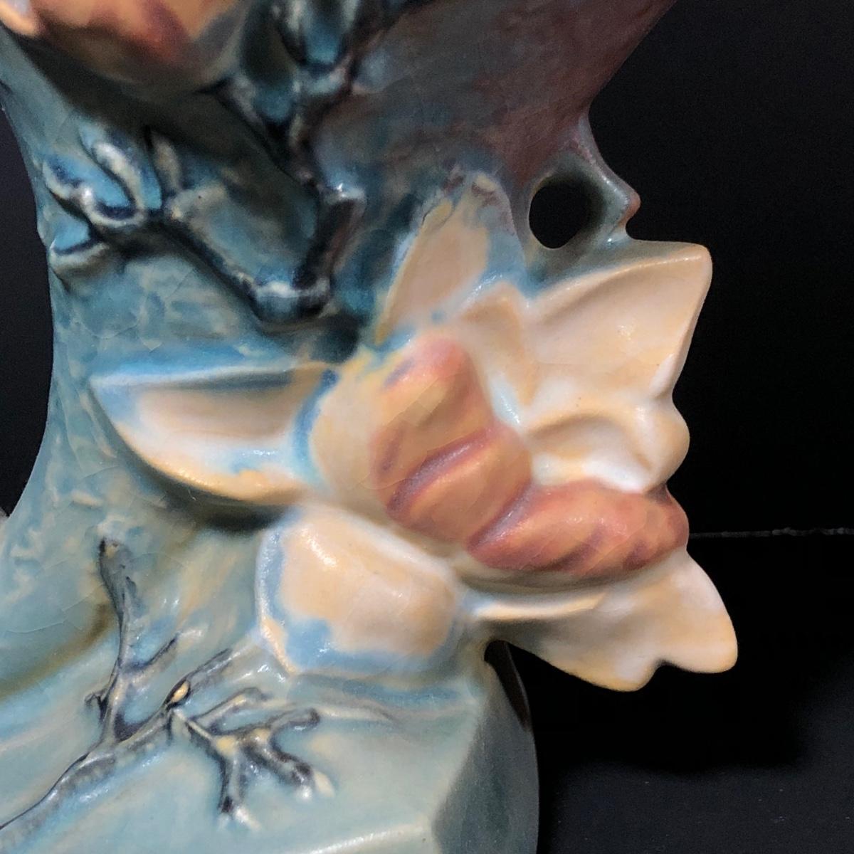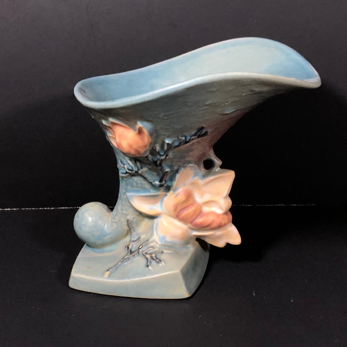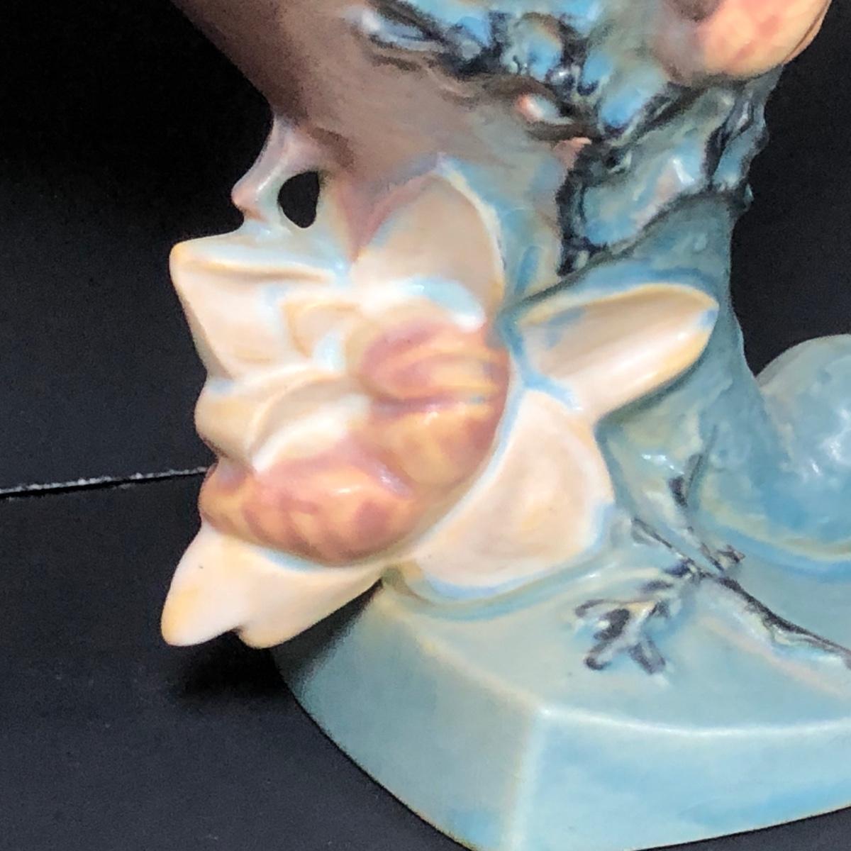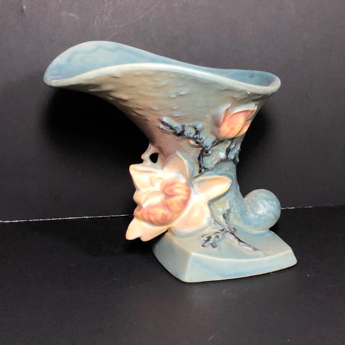 LOT 163F: Vintage Roseville Pottery - 1943 Blue Magnolia (184-6") & Water Lily Handled Basket (382-12")