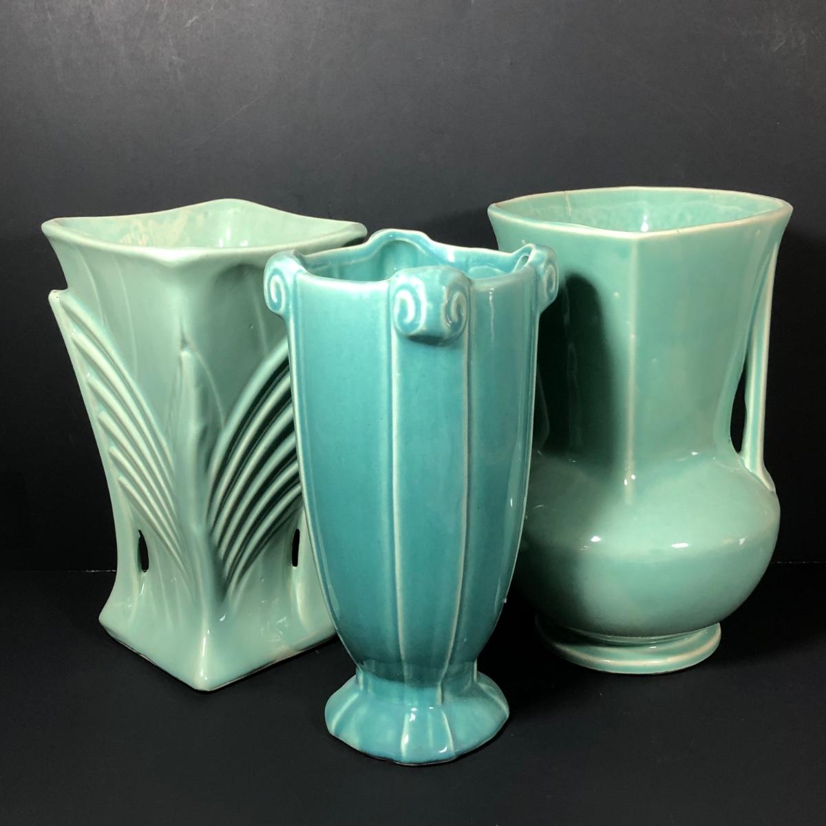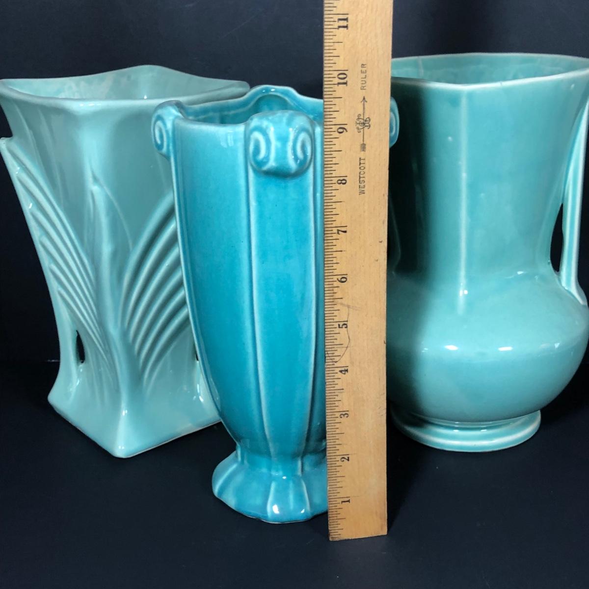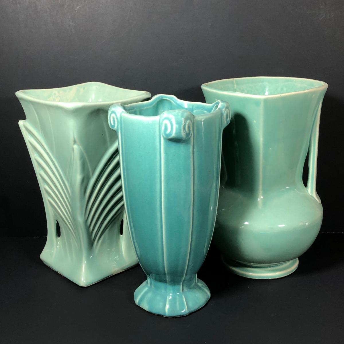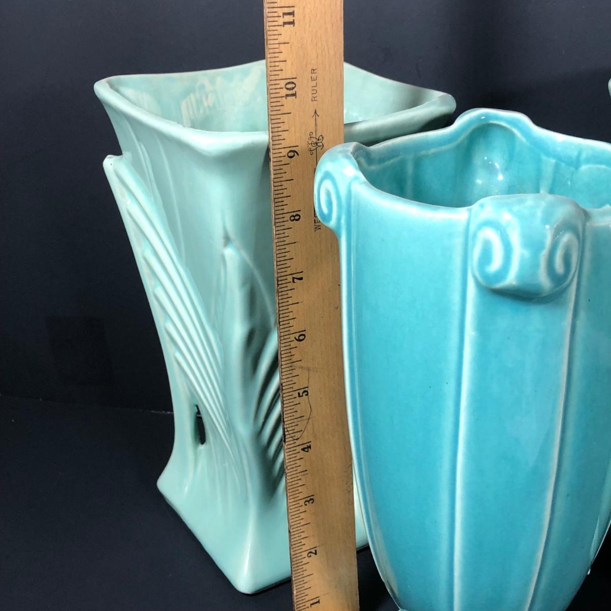 LOT 164F: Vintage McCoy Pottery - 1940s Turquoise Aqua Scroll Vase, Art Deco Vase 270 & Teal Blue Two Handled Square Vase