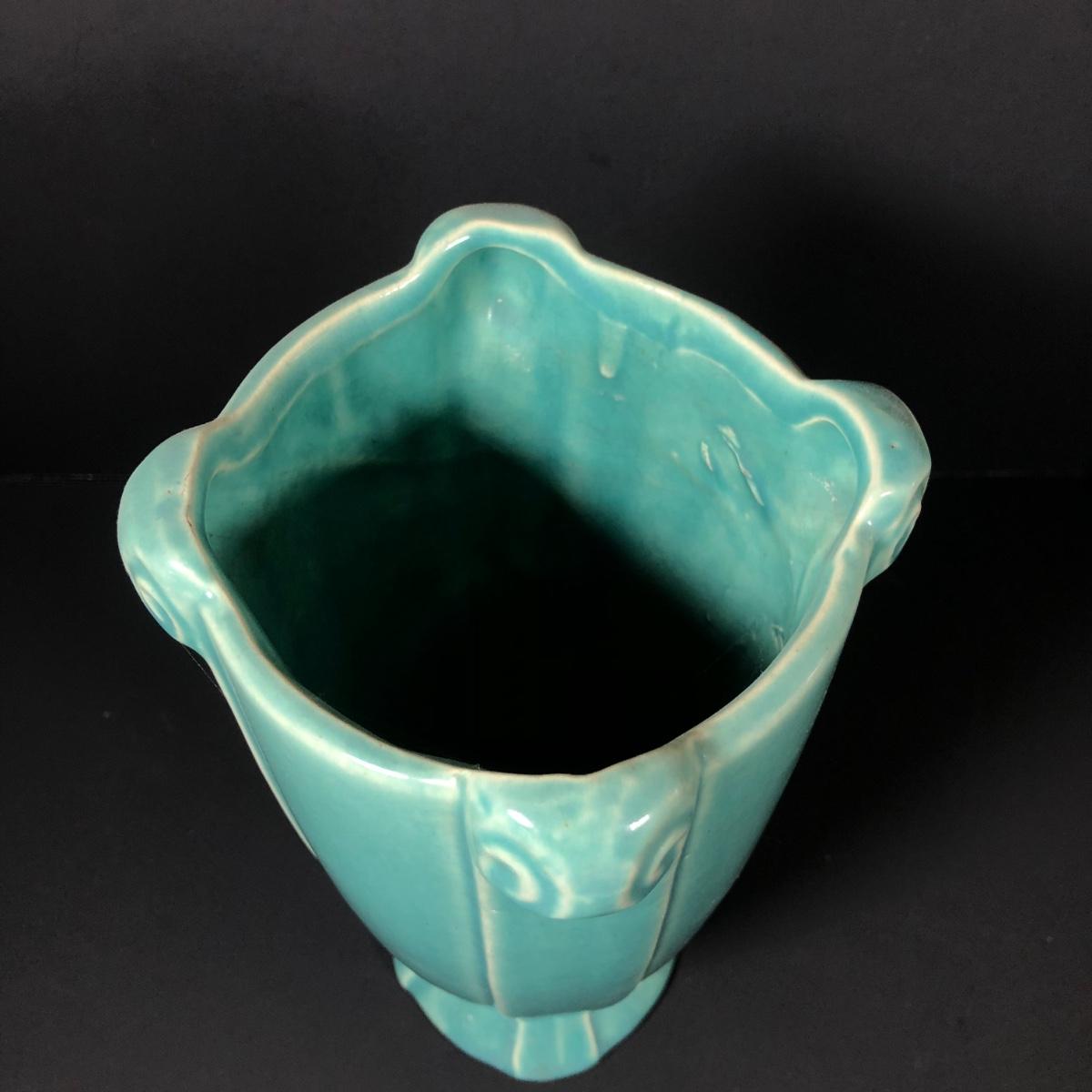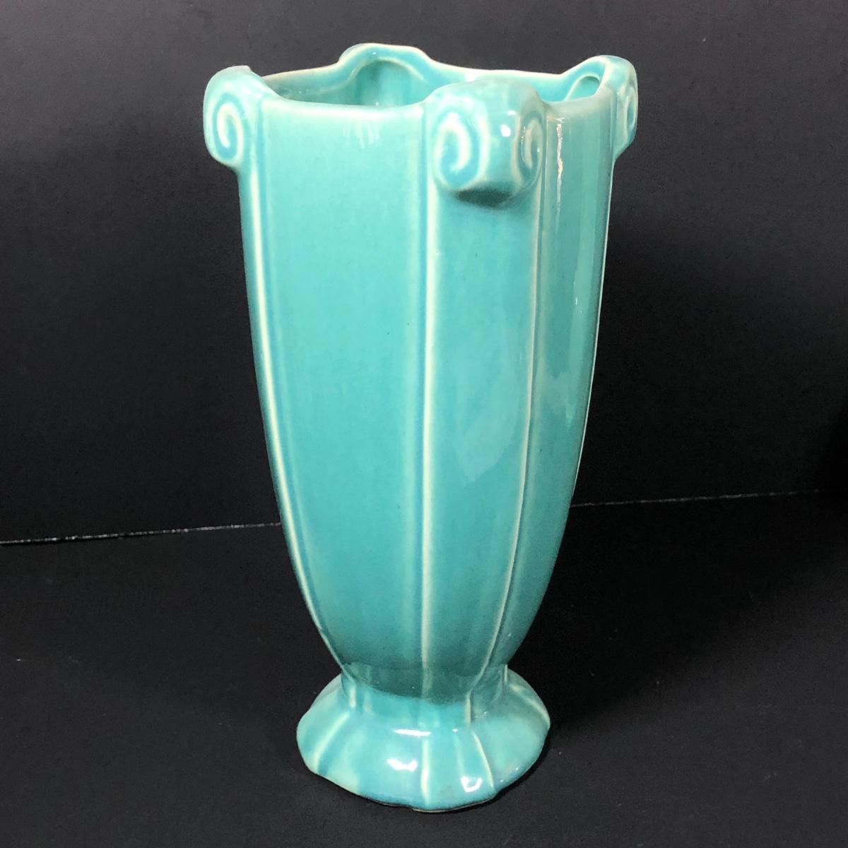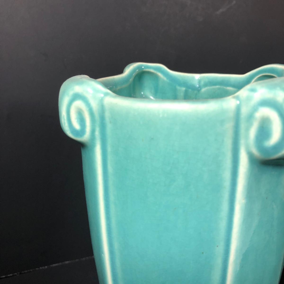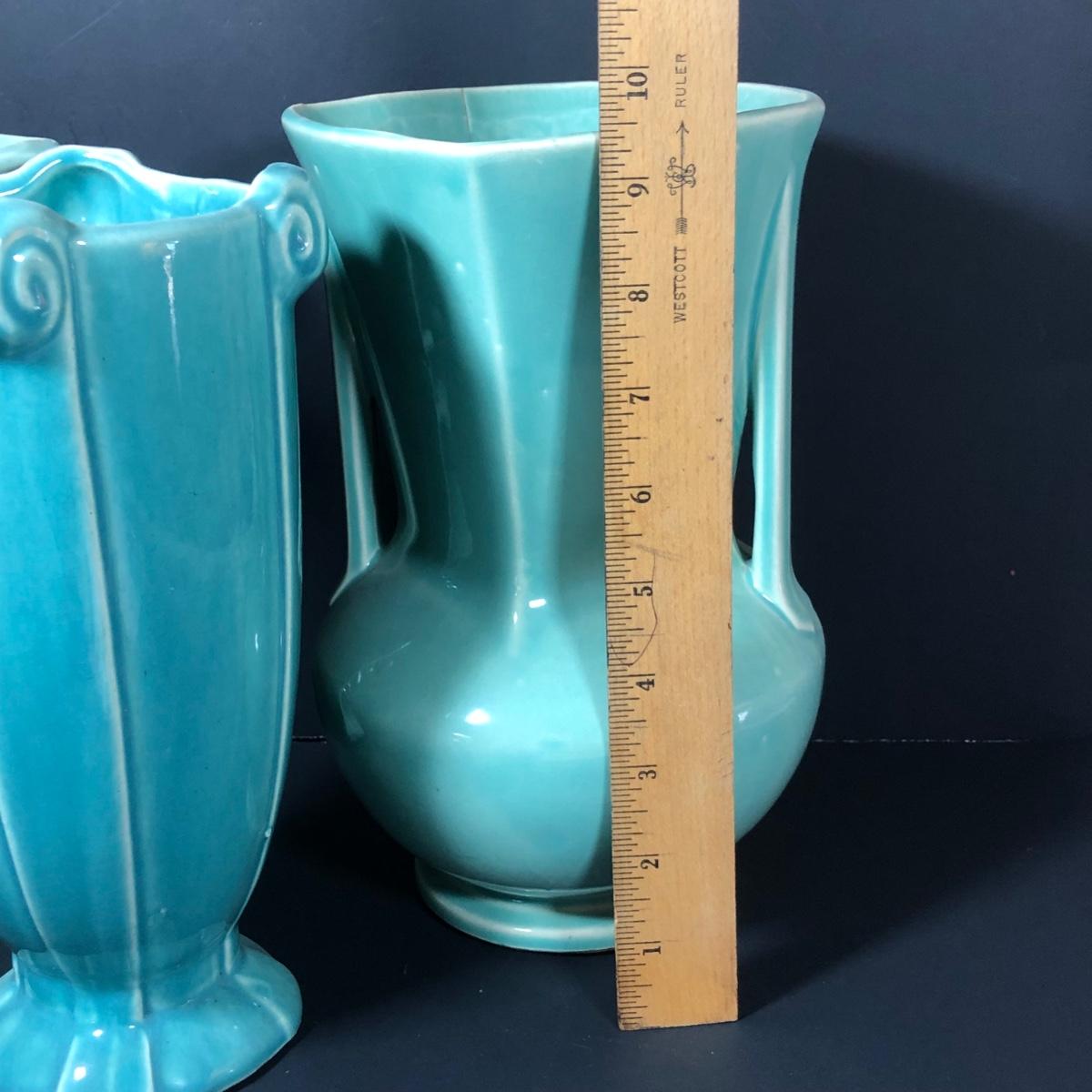 LOT 164F: Vintage McCoy Pottery - 1940s Turquoise Aqua Scroll Vase, Art Deco Vase 270 & Teal Blue Two Handled Square Vase
