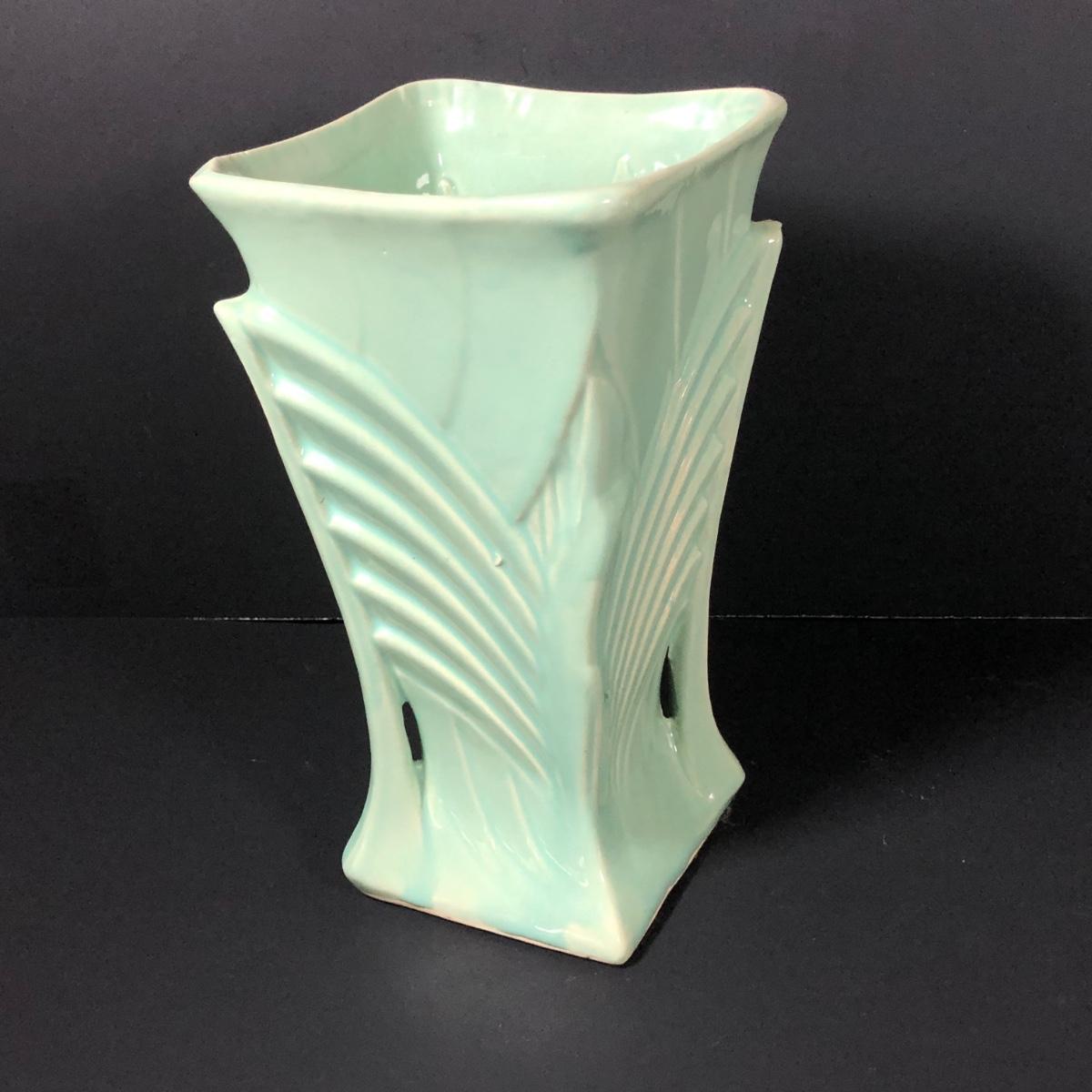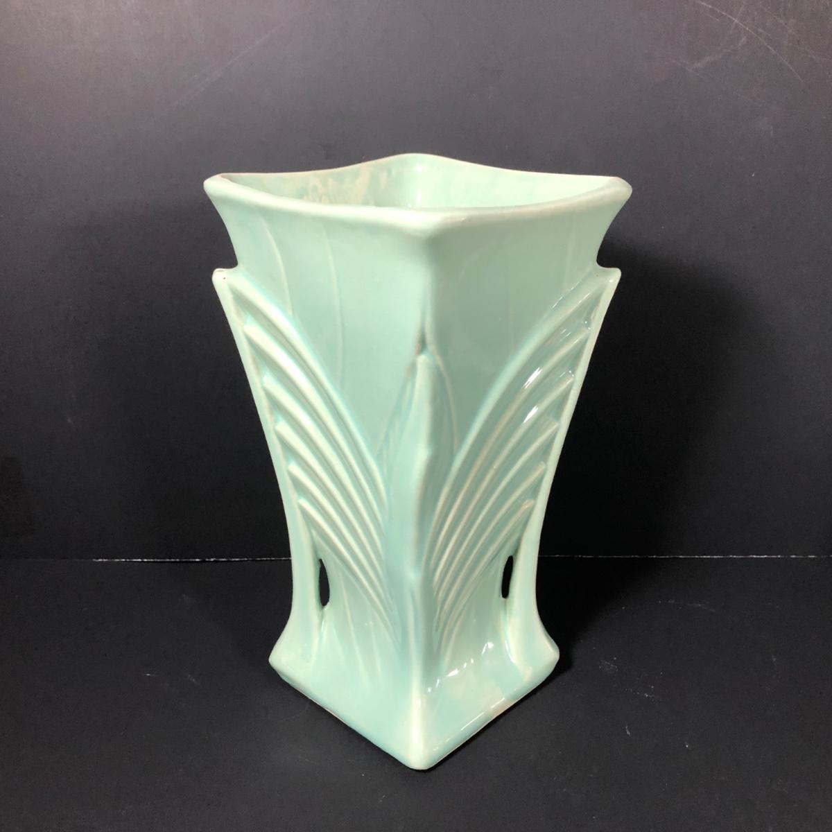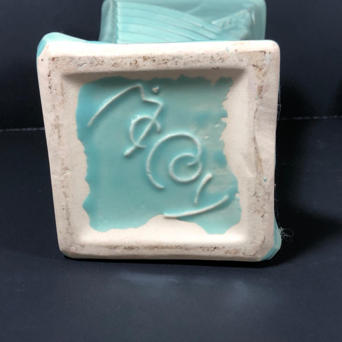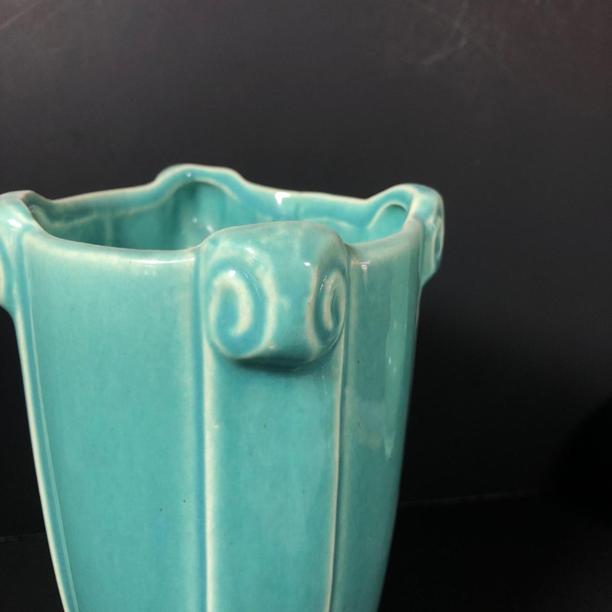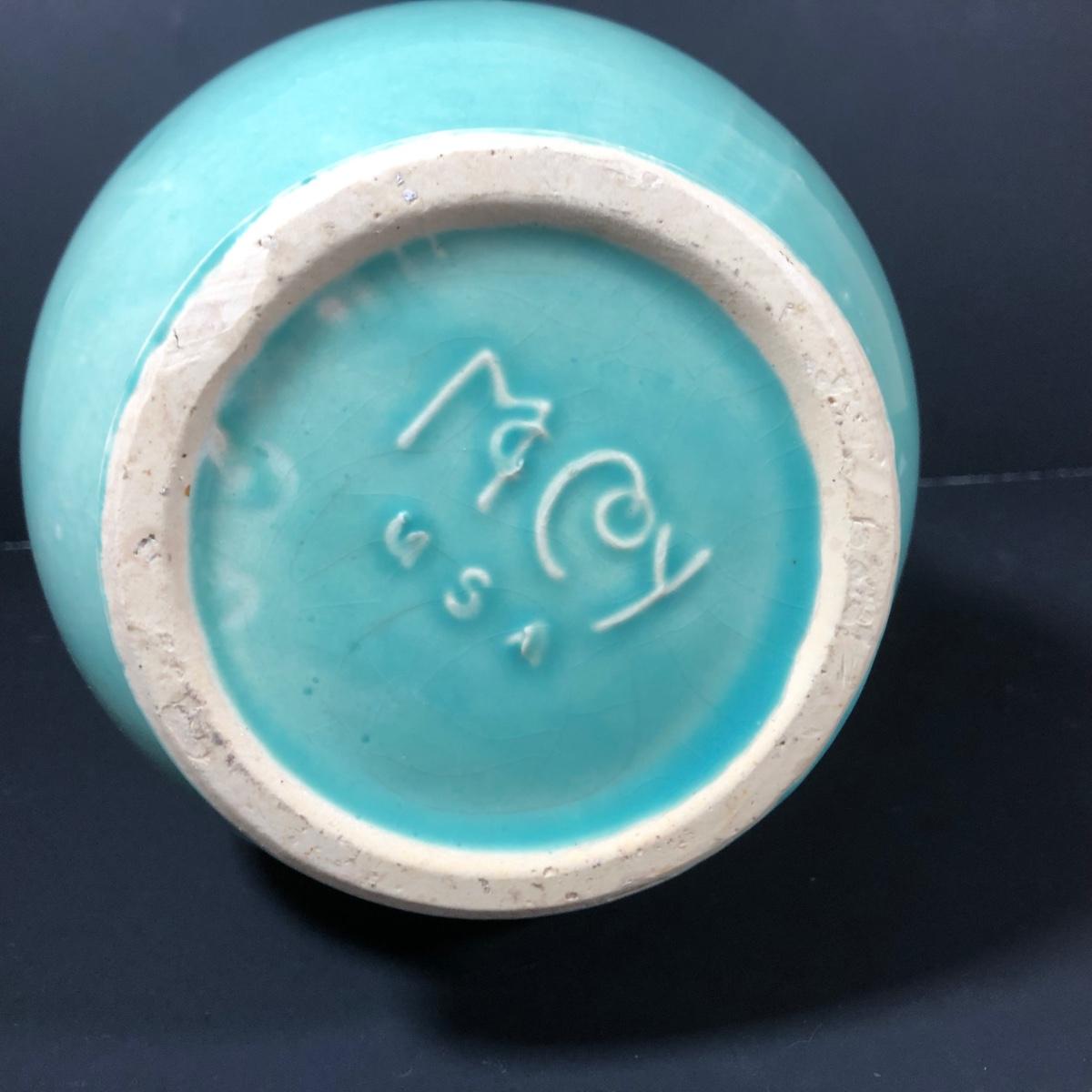 LOT 164F: Vintage McCoy Pottery - 1940s Turquoise Aqua Scroll Vase, Art Deco Vase 270 & Teal Blue Two Handled Square Vase