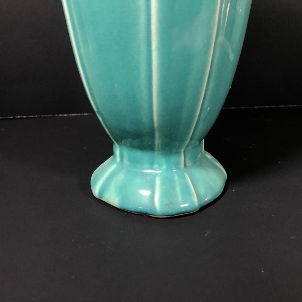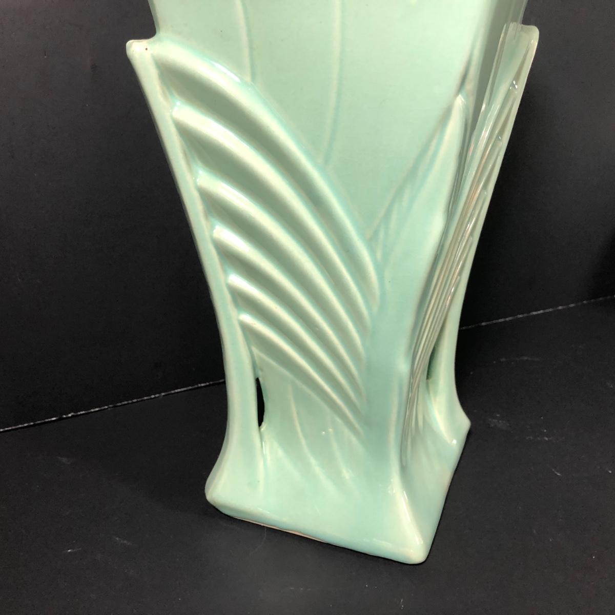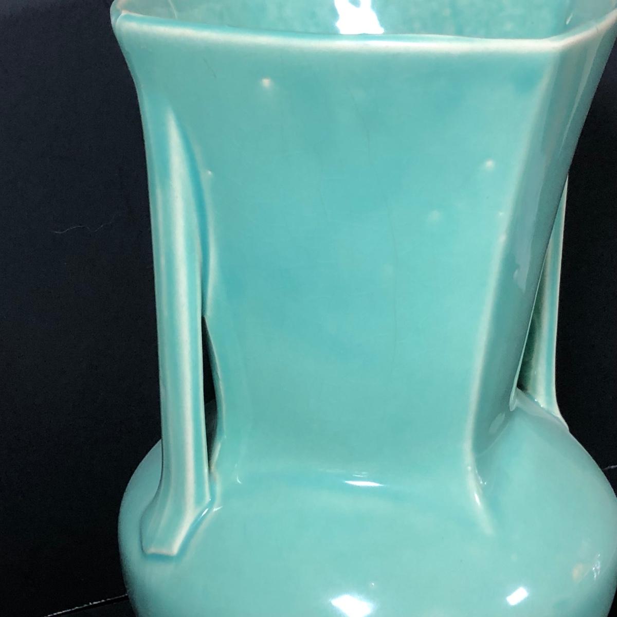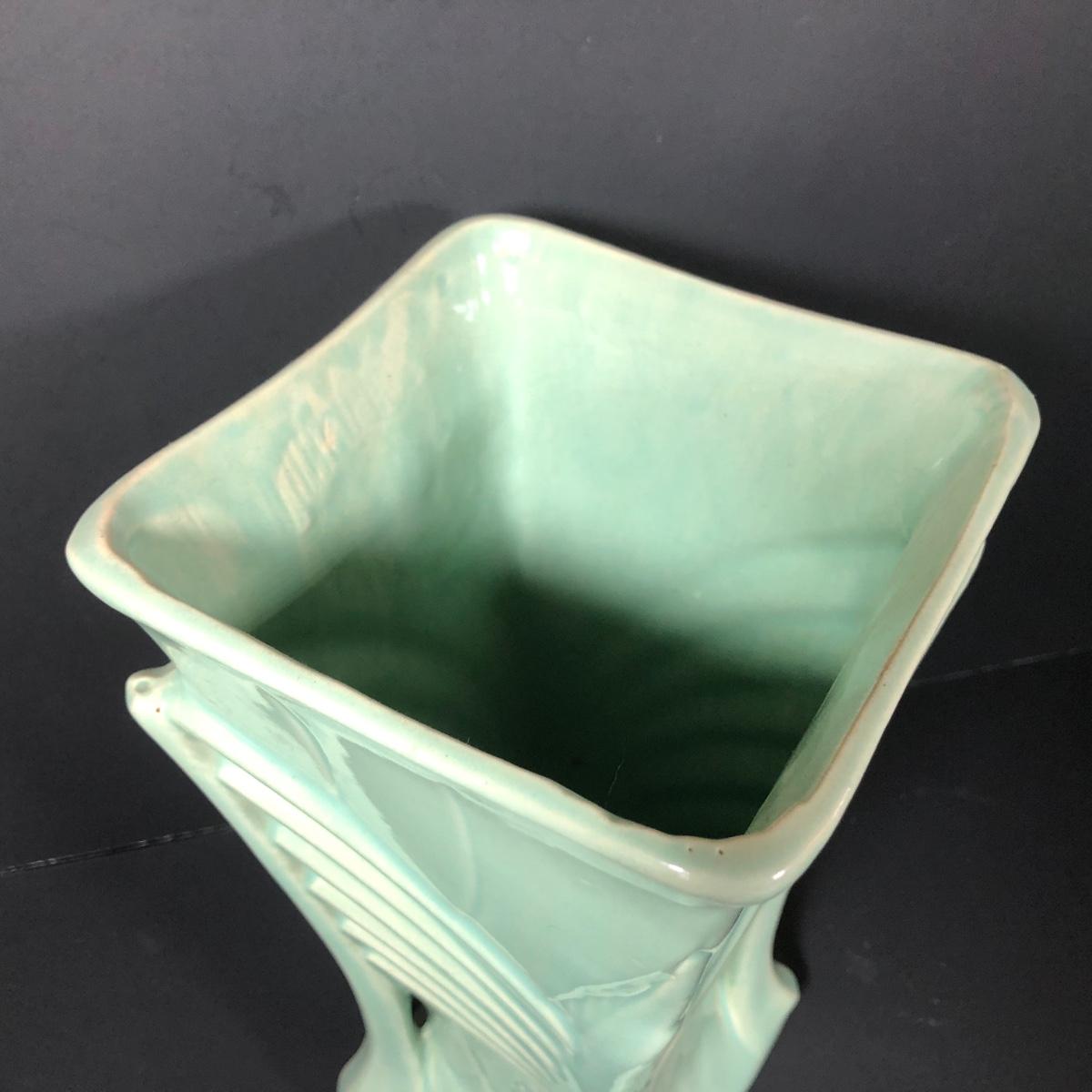 LOT 164F: Vintage McCoy Pottery - 1940s Turquoise Aqua Scroll Vase, Art Deco Vase 270 & Teal Blue Two Handled Square Vase