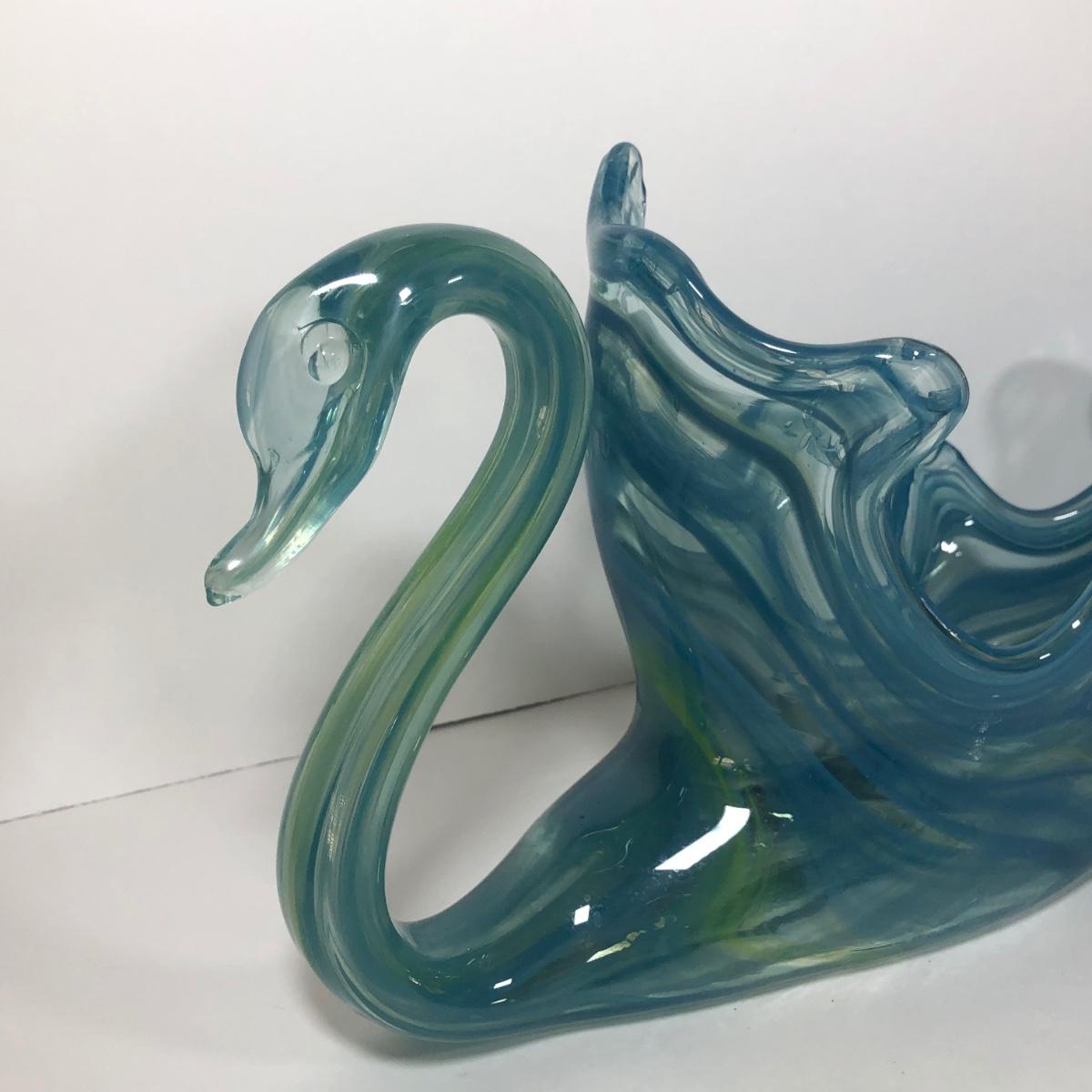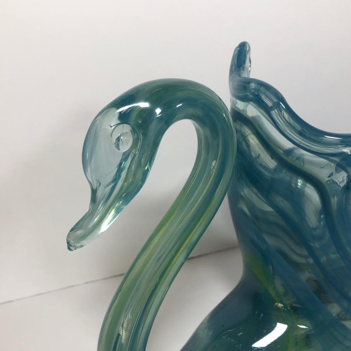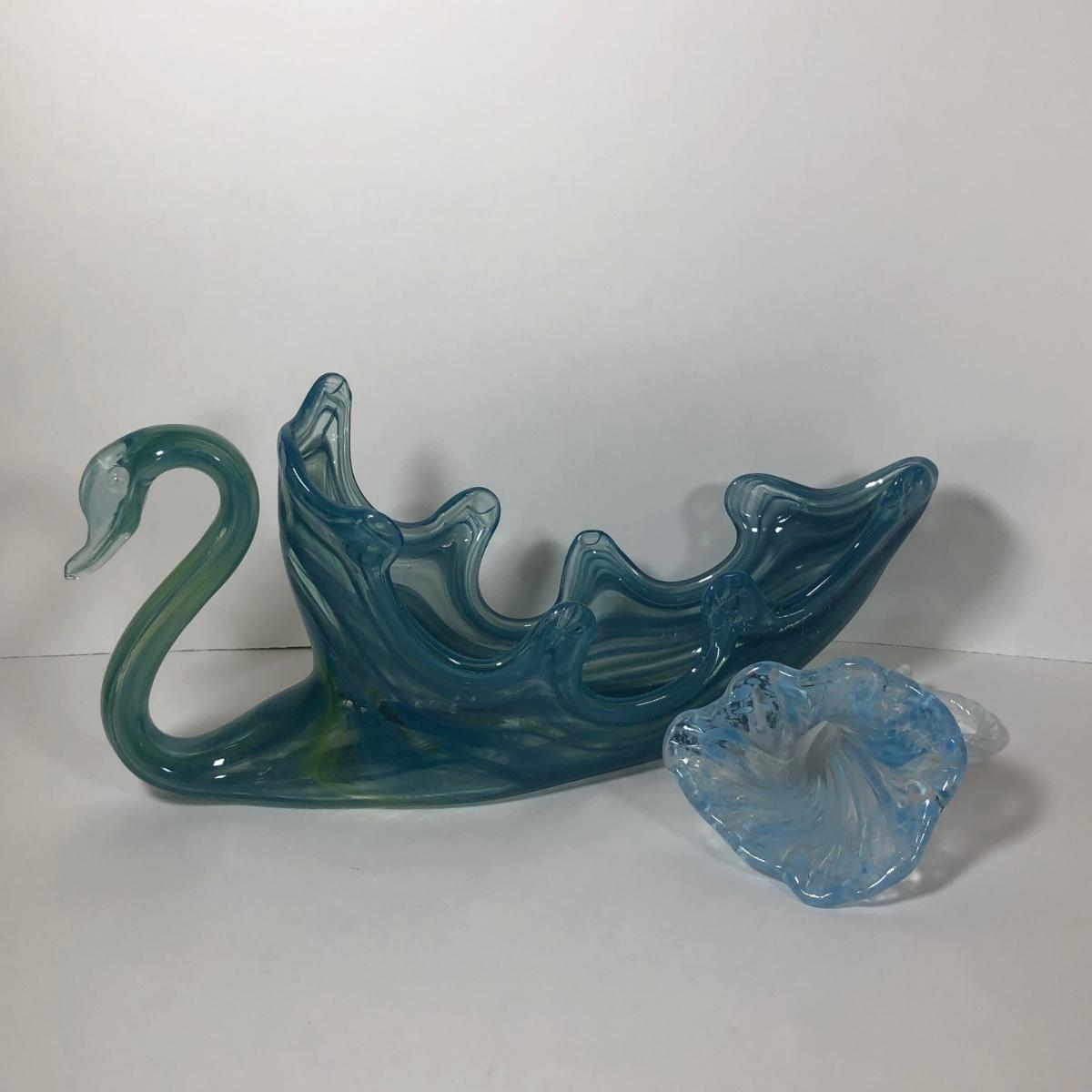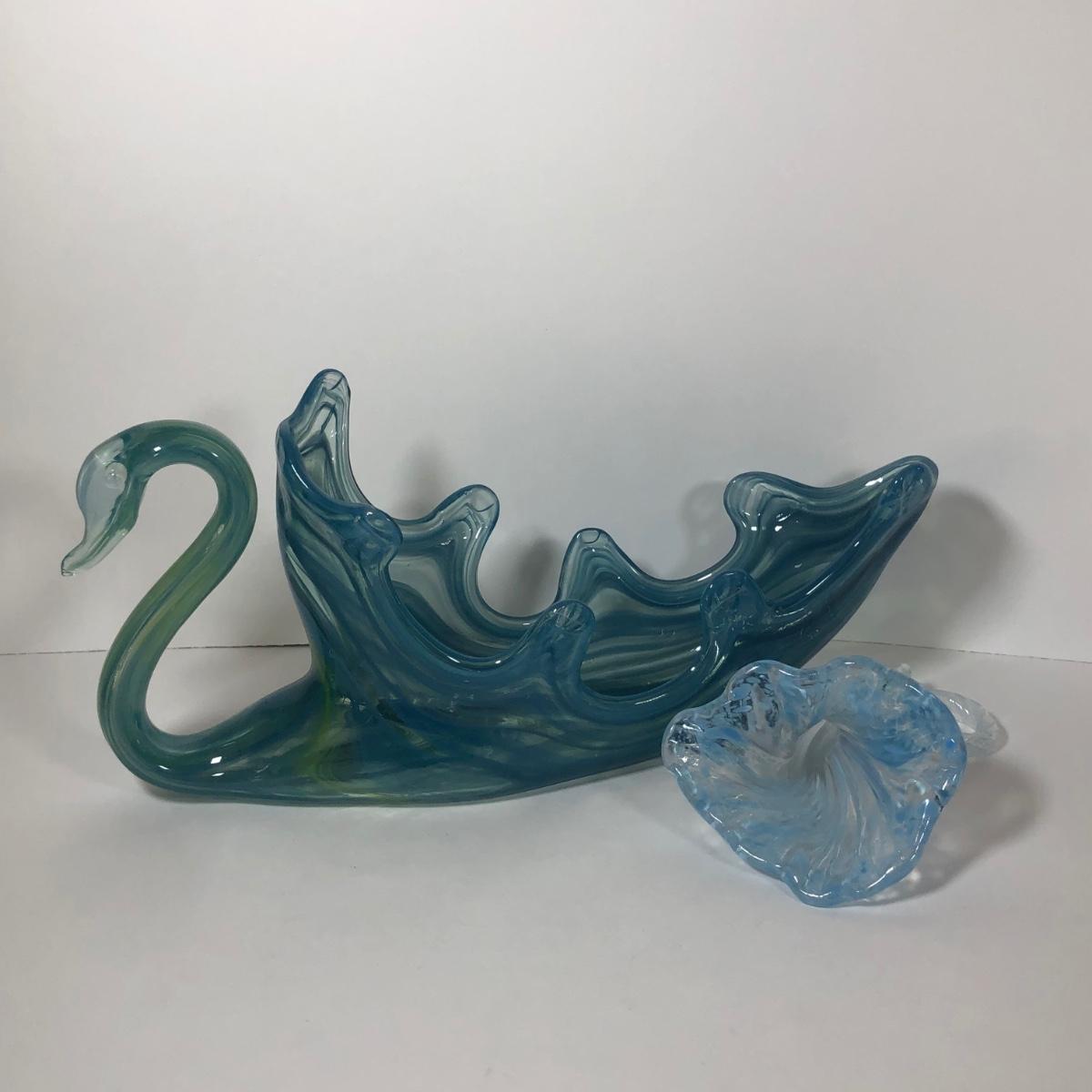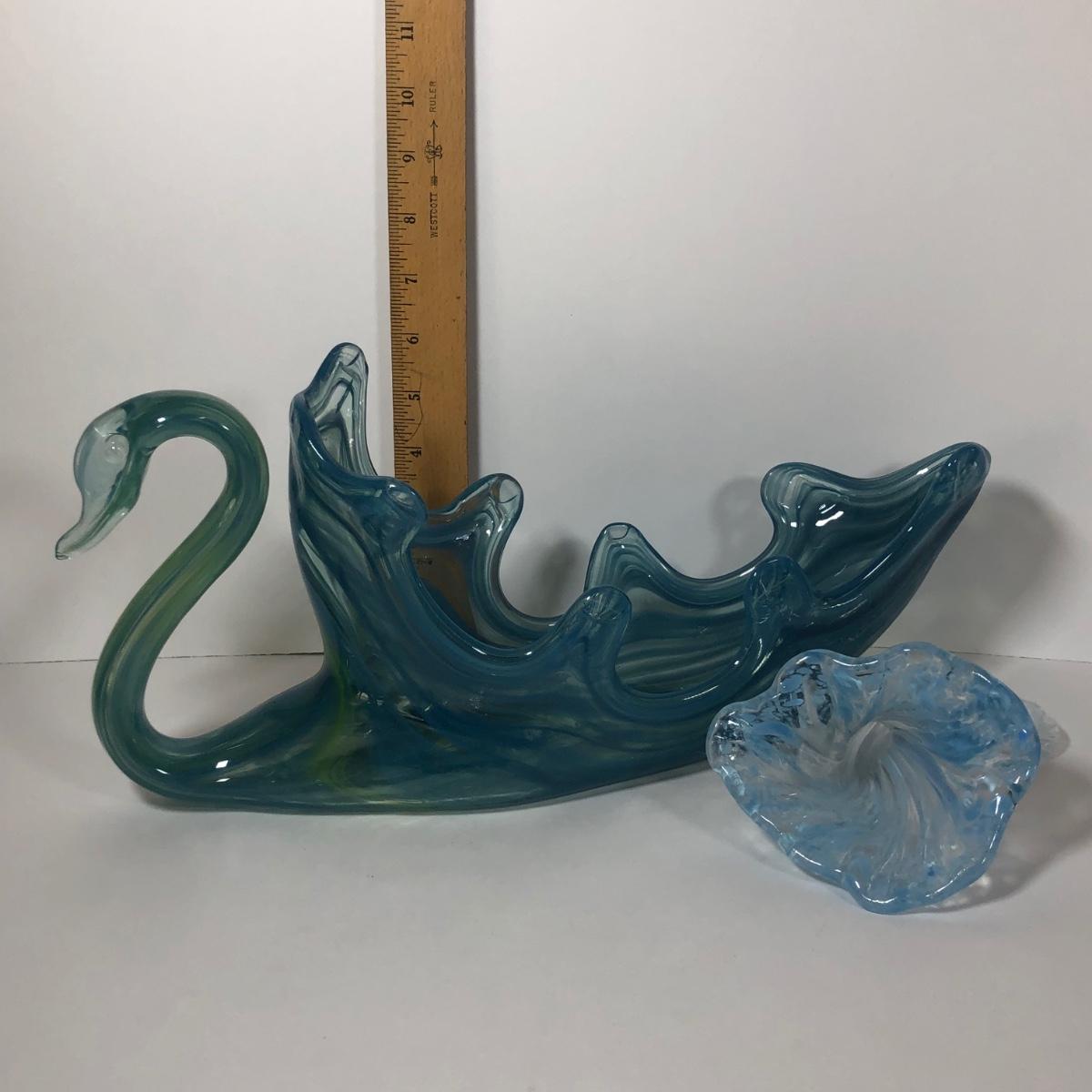 LOT 177F: Mid Century Murano Style Blue & Green Swirl Art Glass Swan & Blue Art Glass Flower