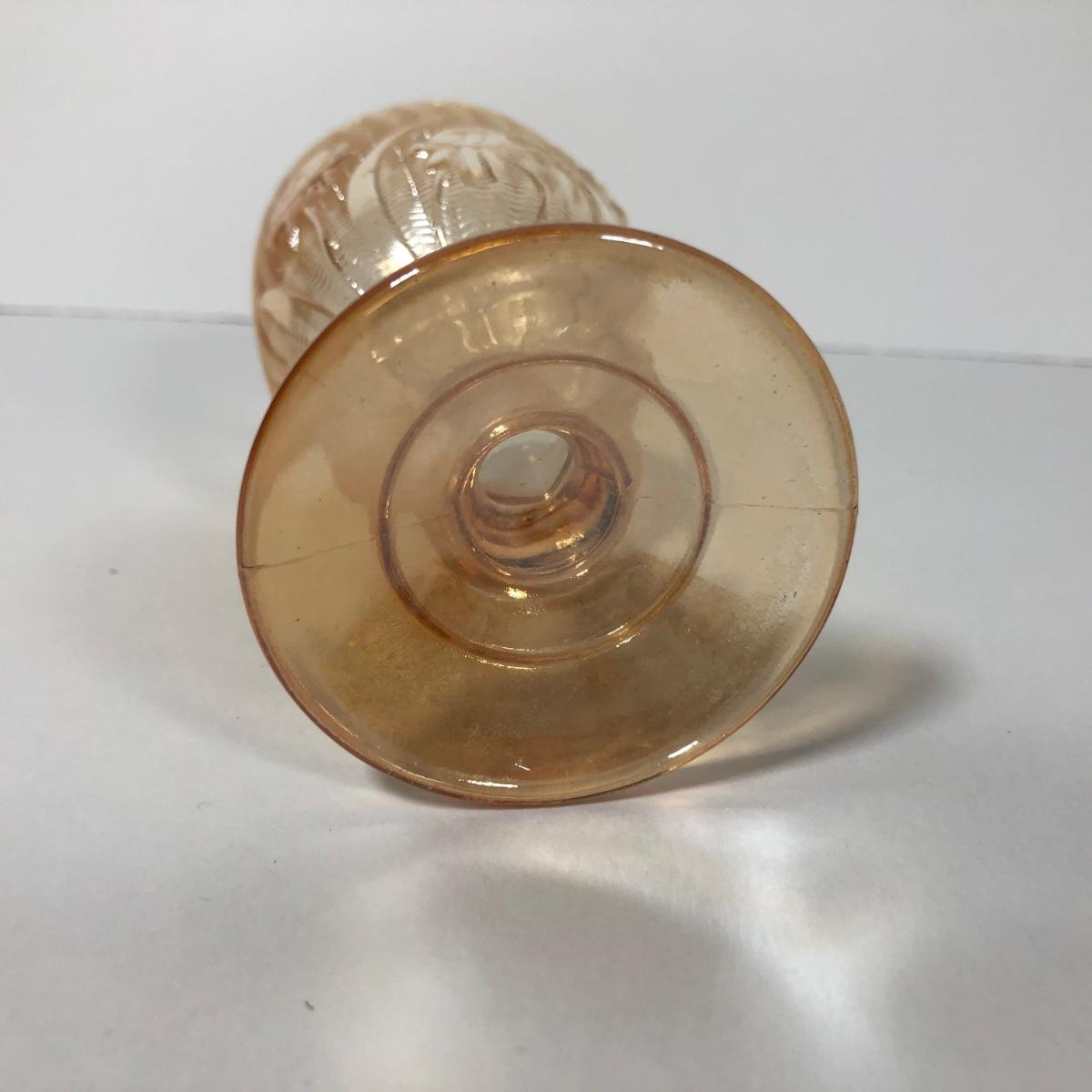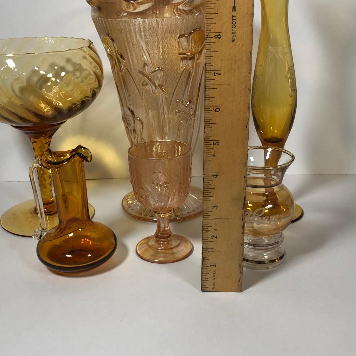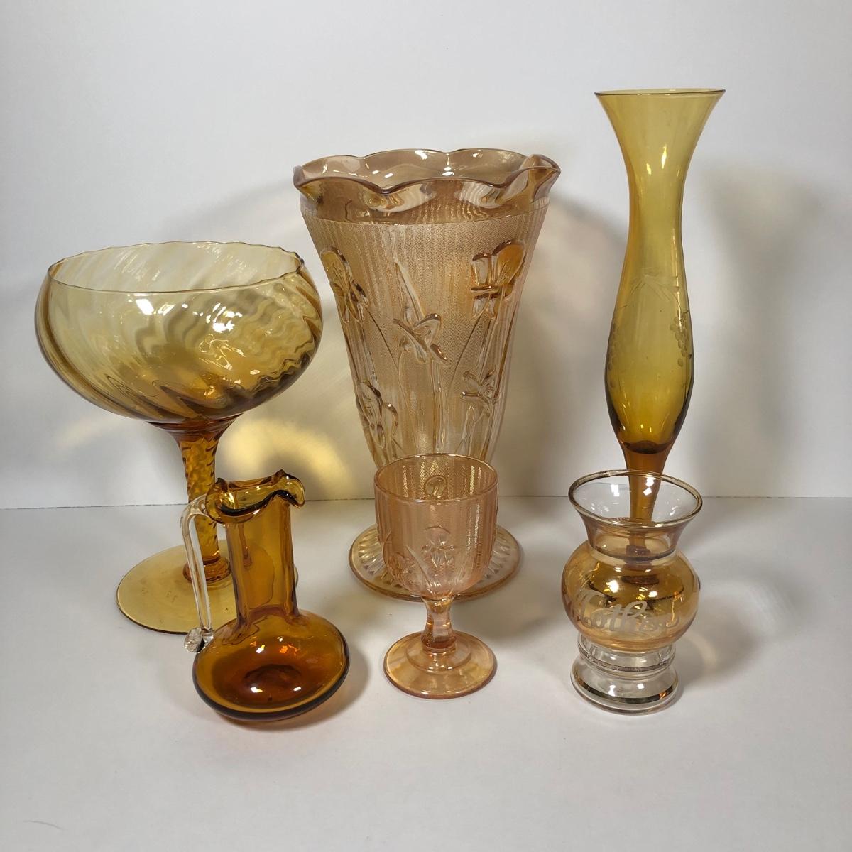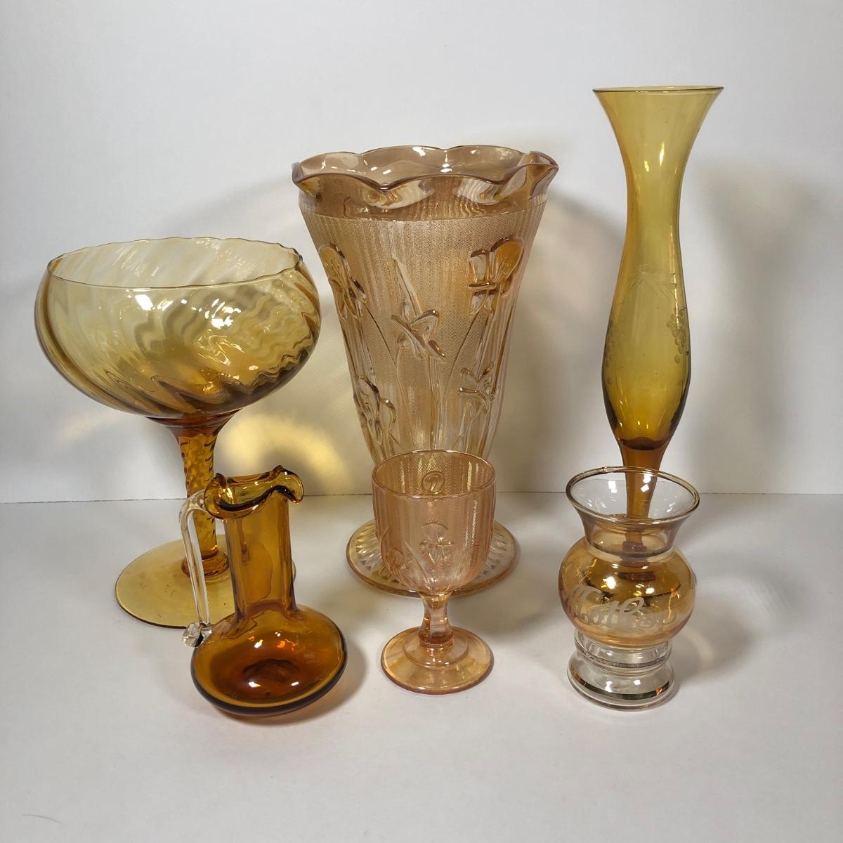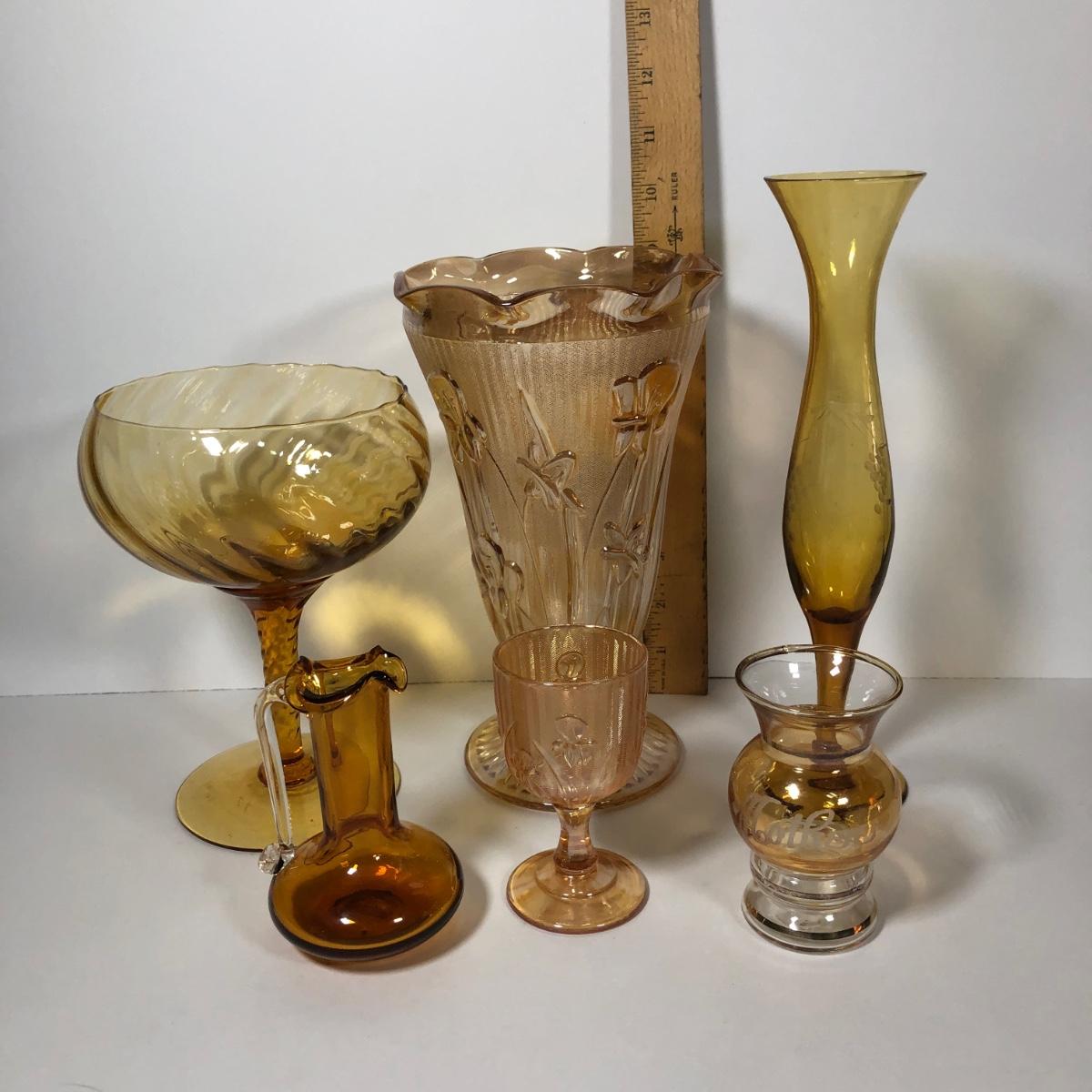 LOT 181F: Amber Art Glass Compote Pedestal Candy Dish, MCM Amber Glass Bud Vase, Carnival Glass Iridescent Vase & Wine Cup & More