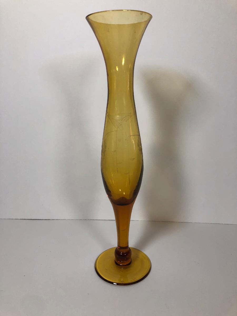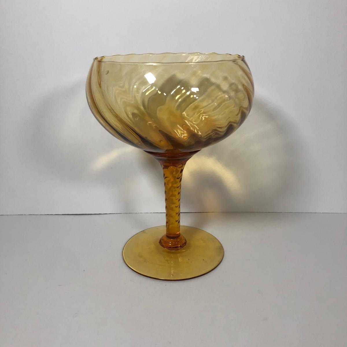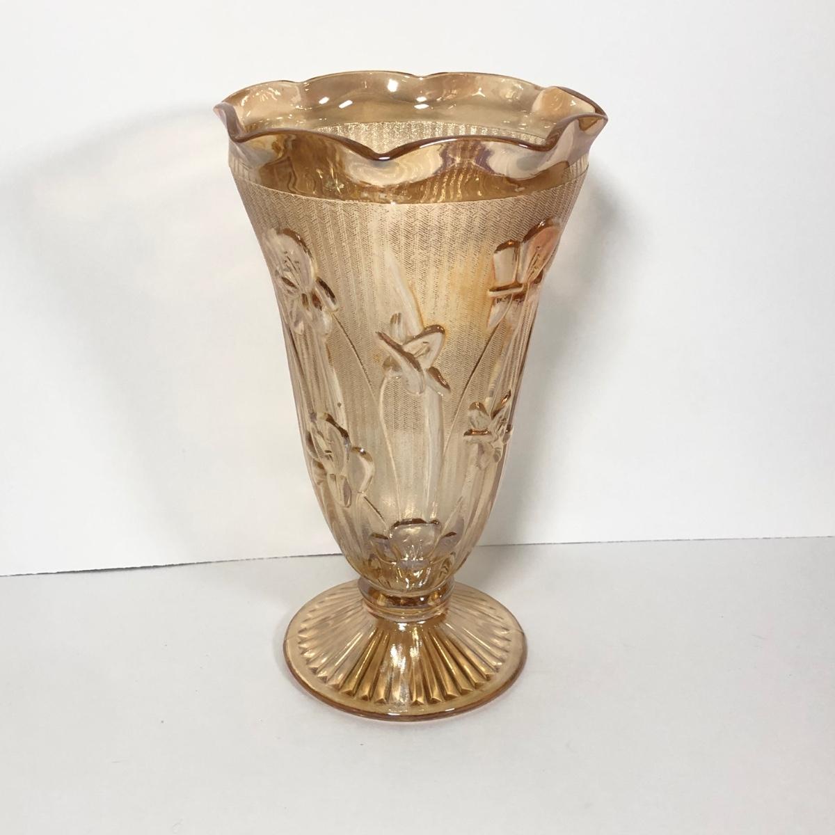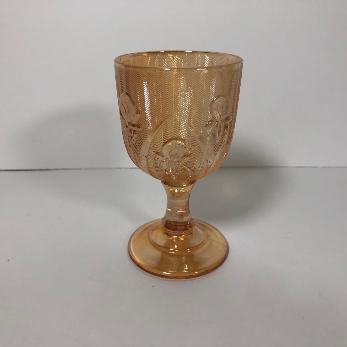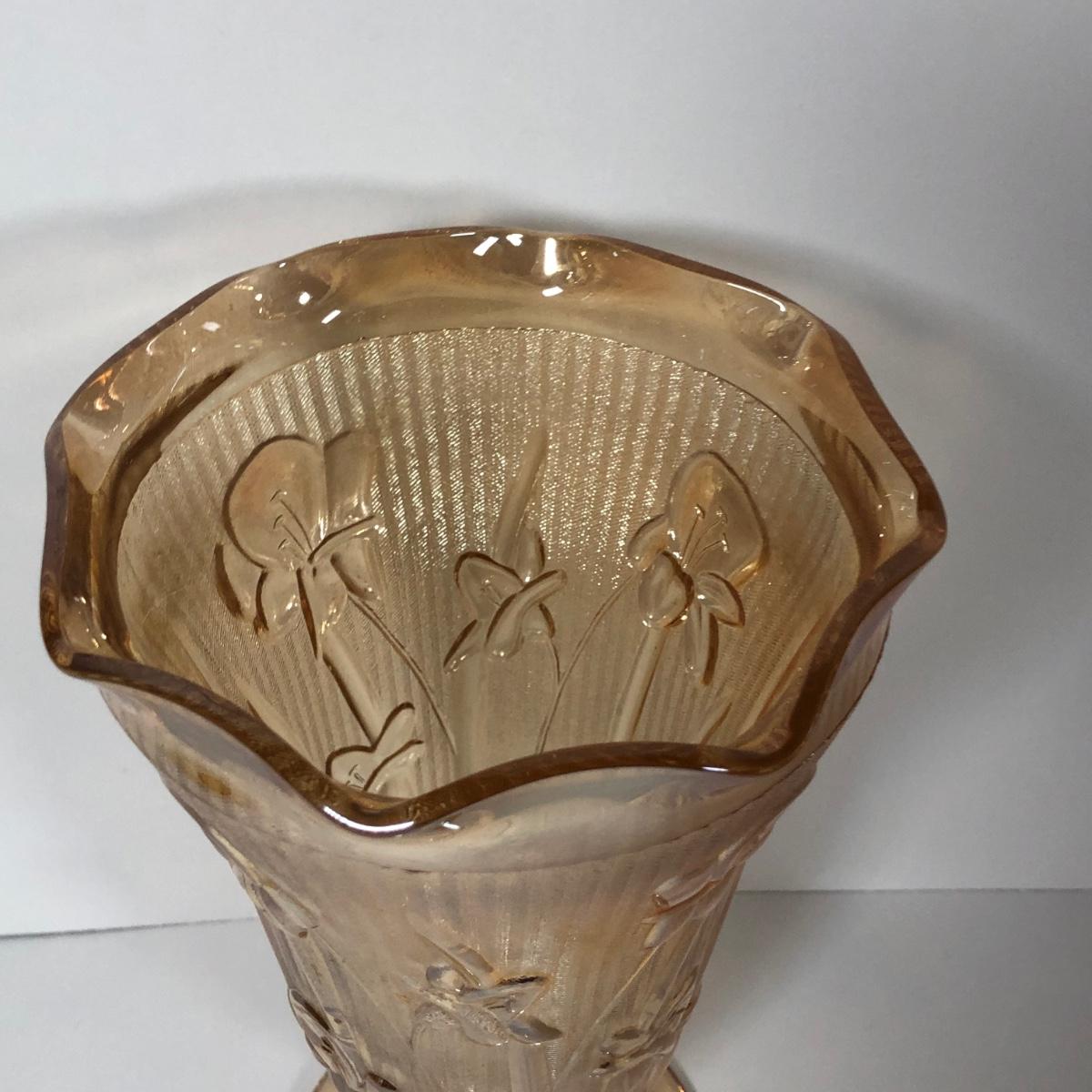 LOT 181F: Amber Art Glass Compote Pedestal Candy Dish, MCM Amber Glass Bud Vase, Carnival Glass Iridescent Vase & Wine Cup & More