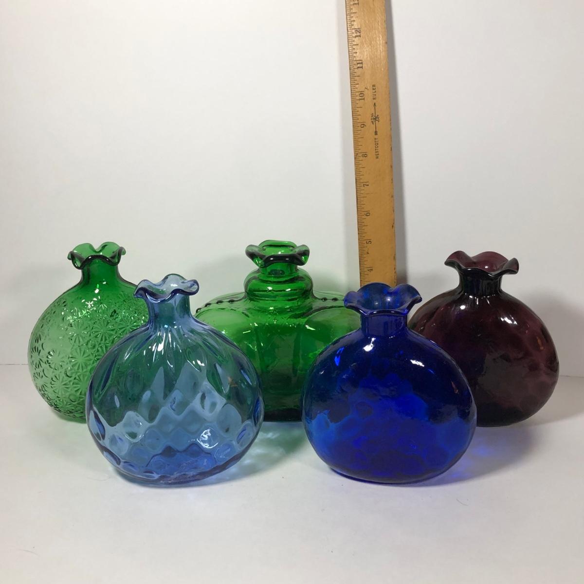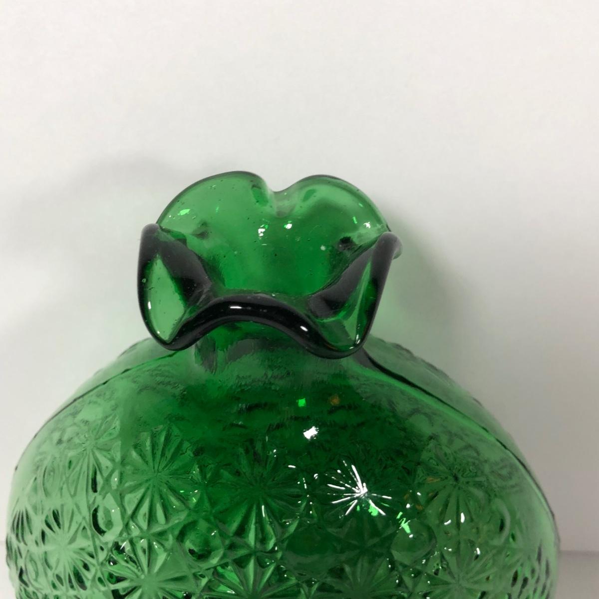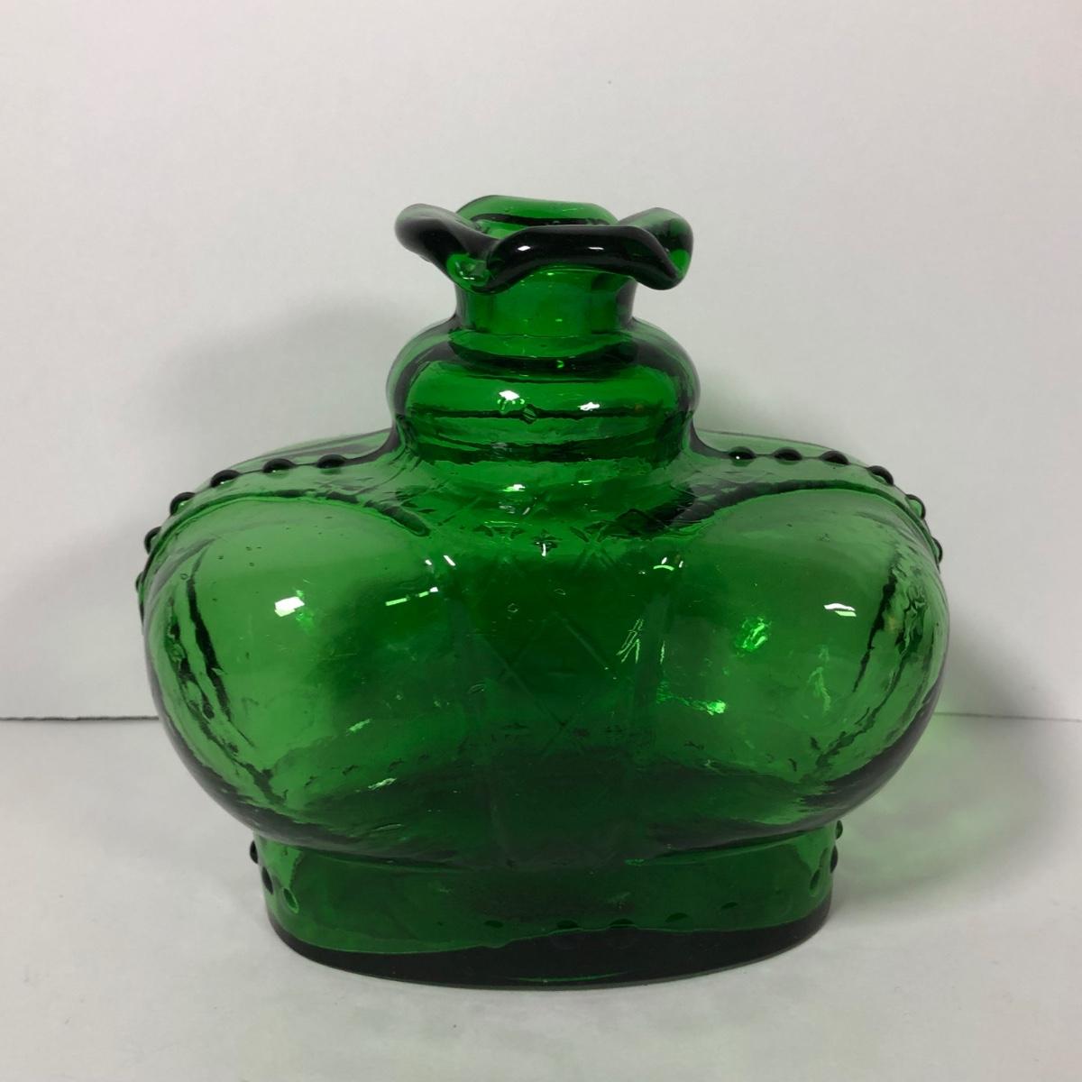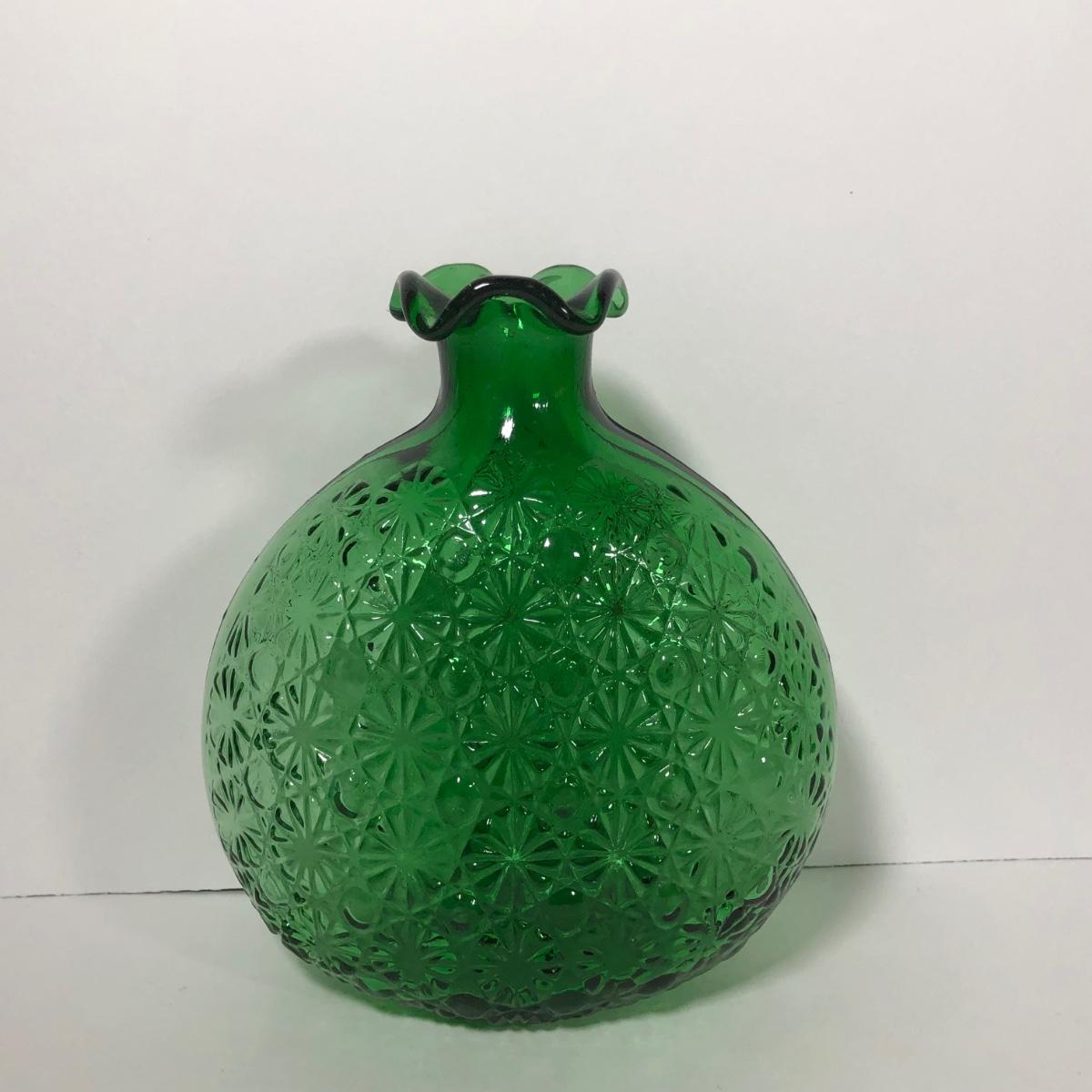 LOT 197F: Vintage Glass Optic Vases, Emerald Green Crown Bottle Vase & Daisy Button Green Glass Vase