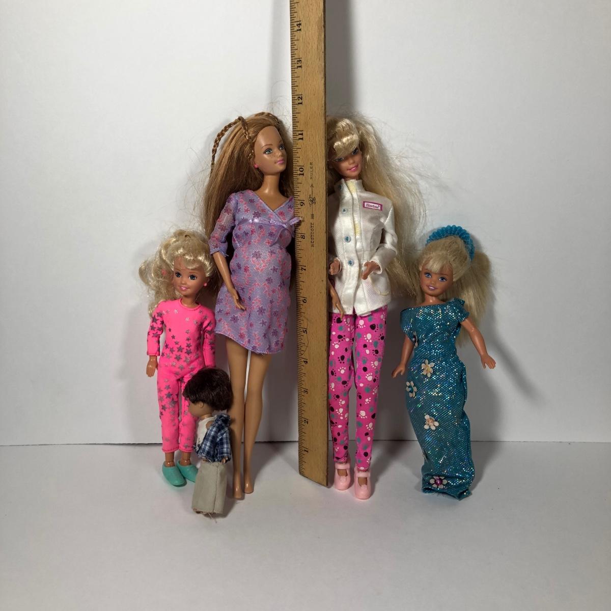 LOT 206K: Retired Pregnant Midge Barbie w/ Magnetic Baby Bump, 1996 Pet Doctor Barbie, 1991 Gymnast Stacie, Vintage Teen Skipper/Stacie & Barbie Happy Family Ryan