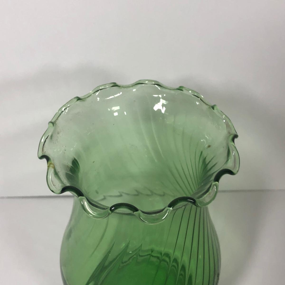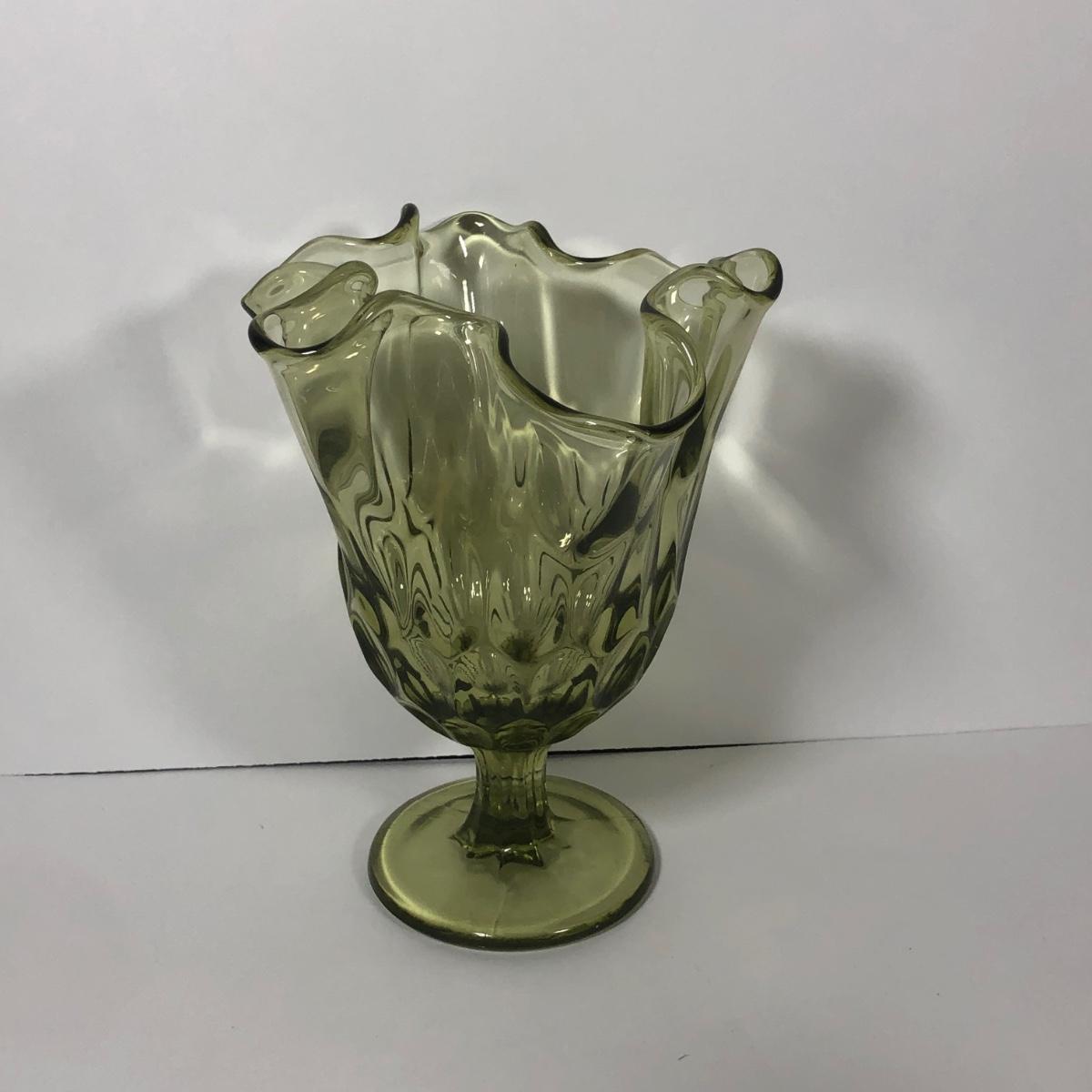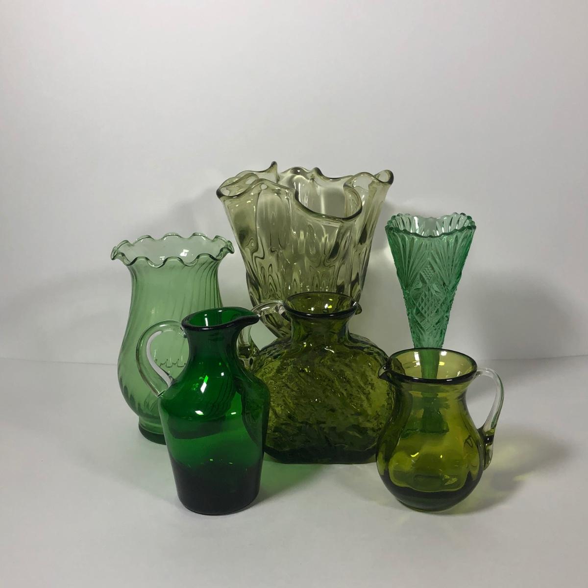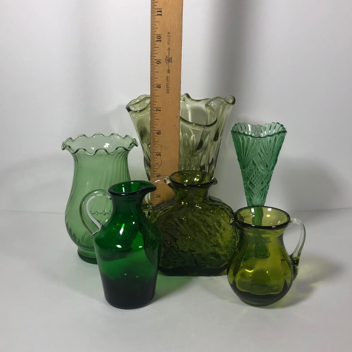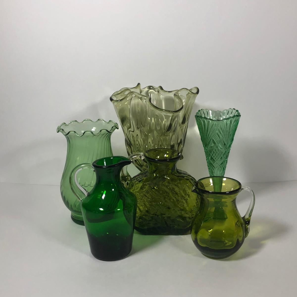 LOT 211K: Fenton Style Colonial Green Thumbprint Hanky Vase, Emerald Depression Glass Ornate Press Cut Pedestal Vase, Rippled Avocado Glass Pitcher, Anchor Hocking Glass Swirl Ruffle Vase & More