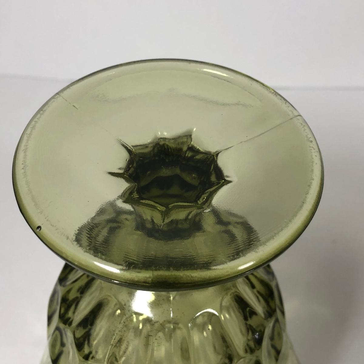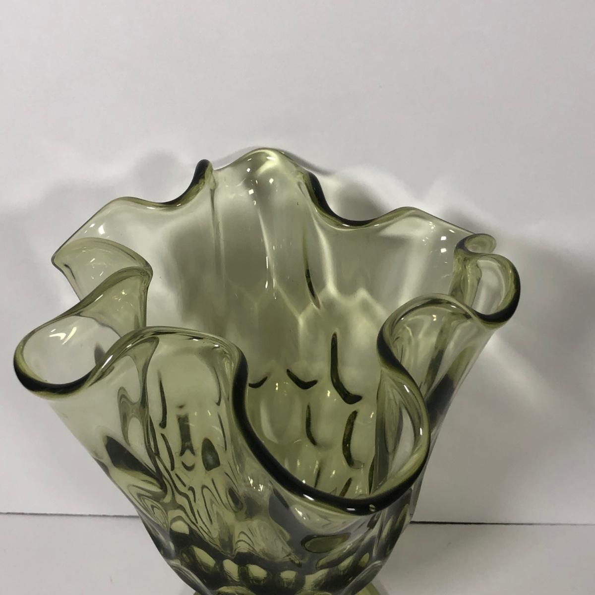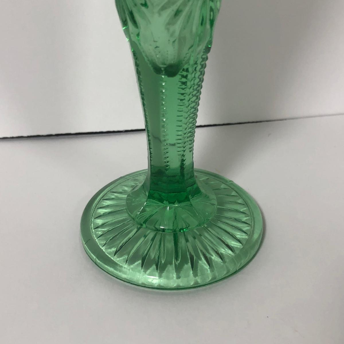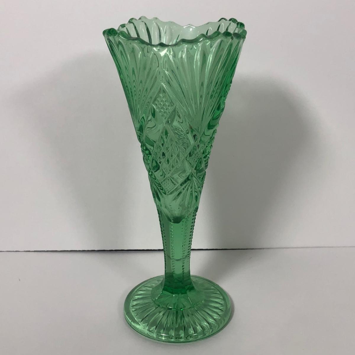 LOT 211K: Fenton Style Colonial Green Thumbprint Hanky Vase, Emerald Depression Glass Ornate Press Cut Pedestal Vase, Rippled Avocado Glass Pitcher, Anchor Hocking Glass Swirl Ruffle Vase & More