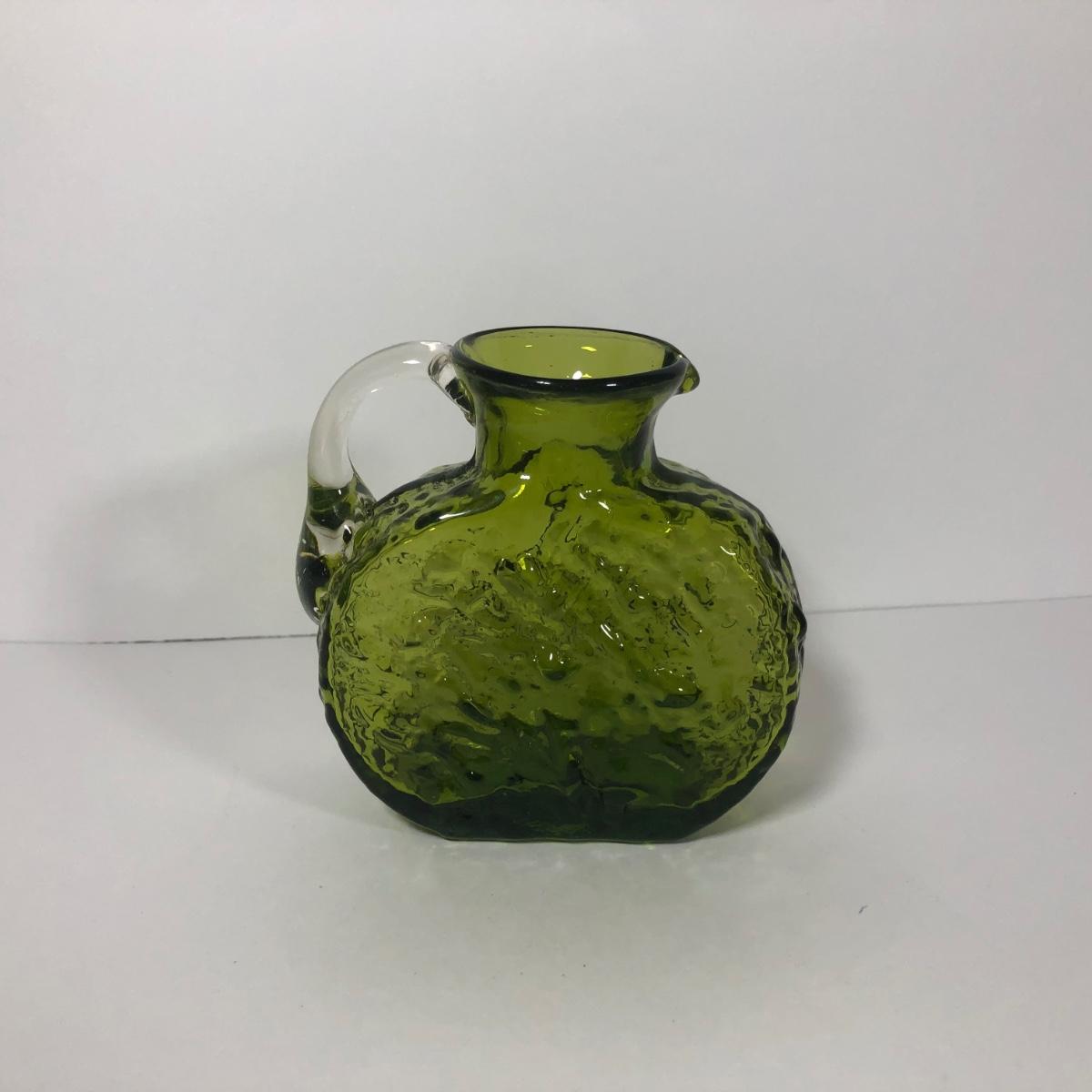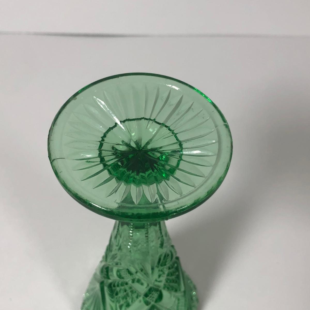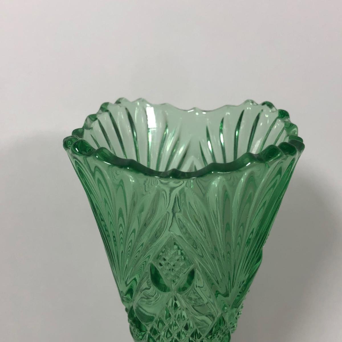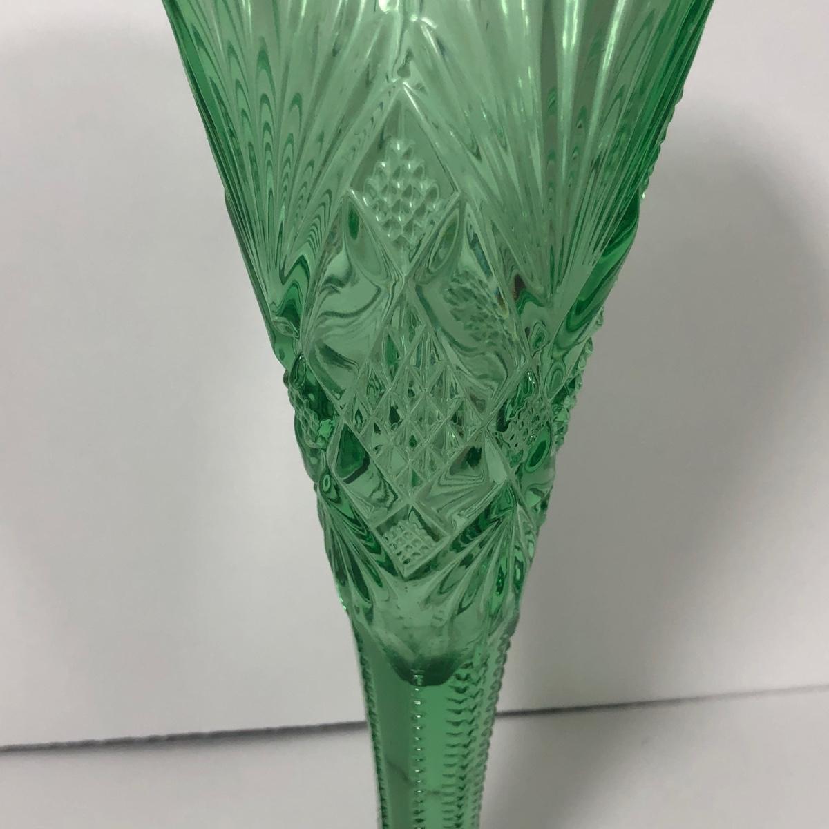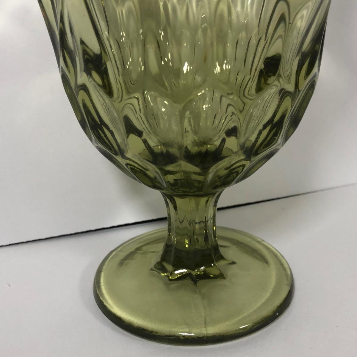 LOT 211K: Fenton Style Colonial Green Thumbprint Hanky Vase, Emerald Depression Glass Ornate Press Cut Pedestal Vase, Rippled Avocado Glass Pitcher, Anchor Hocking Glass Swirl Ruffle Vase & More