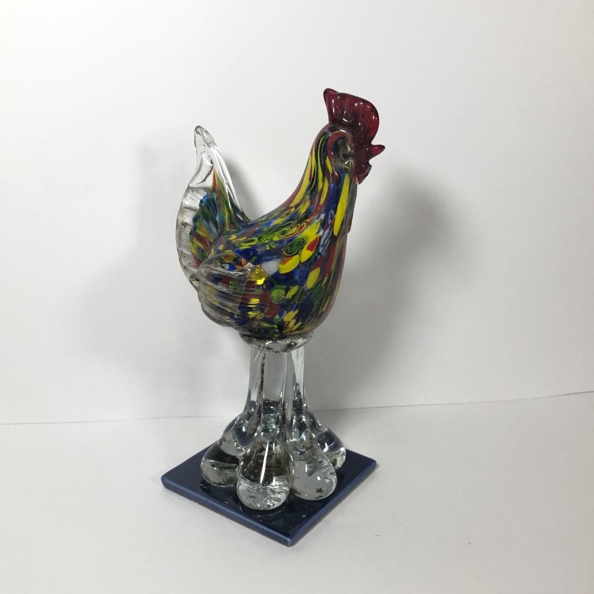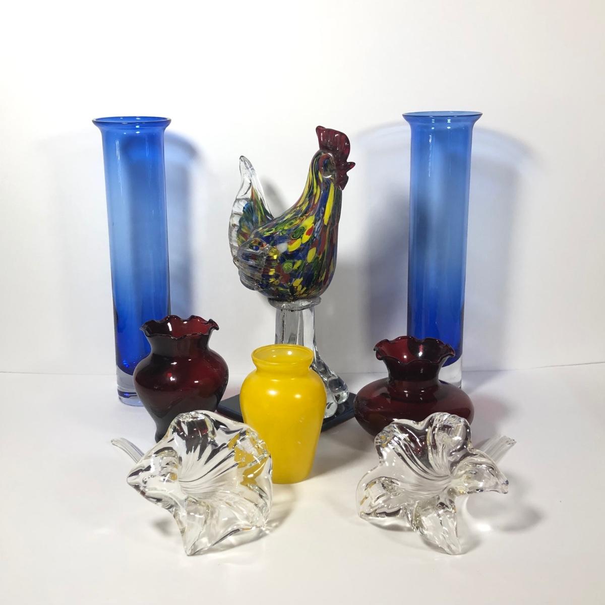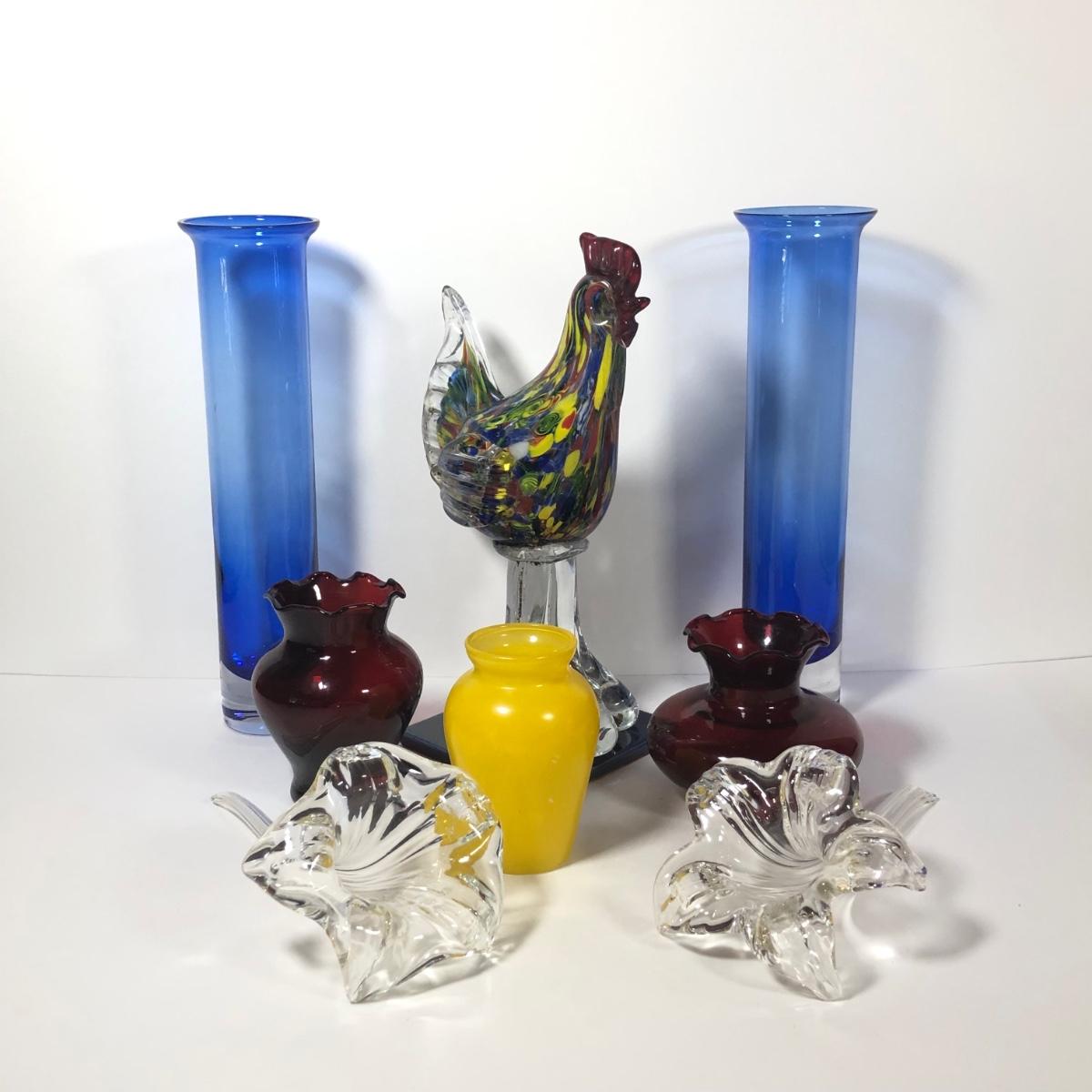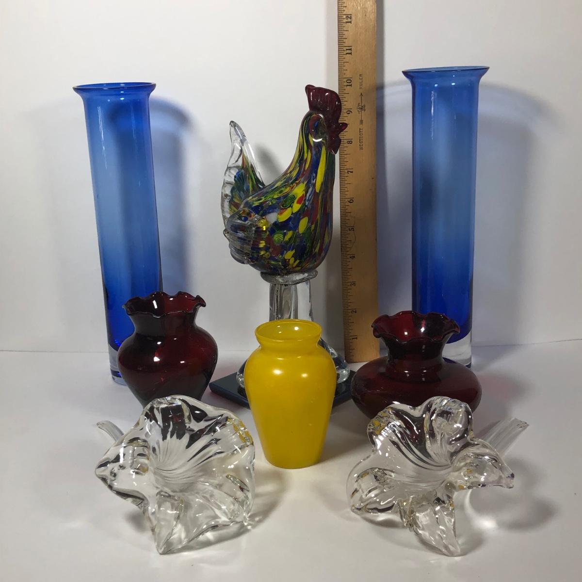 LOT 214K: Vintage Murano Style Art Glass Rooster, Two Tall Cobalt Blue Glass Vases, Anchor Hocking Royal Ruby Red Glass Ivy Vase, Clear Glass Flowers & More
