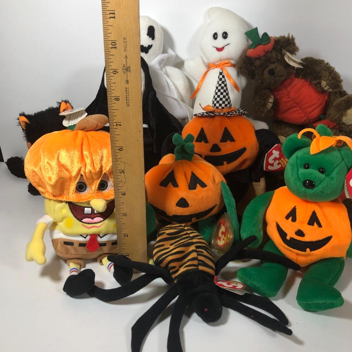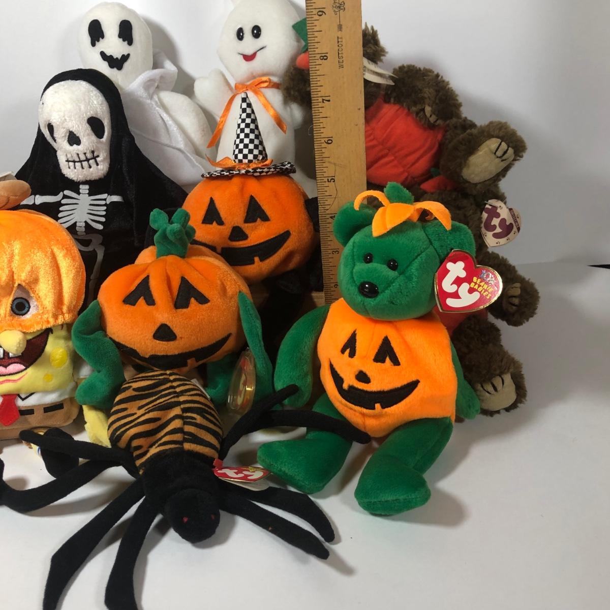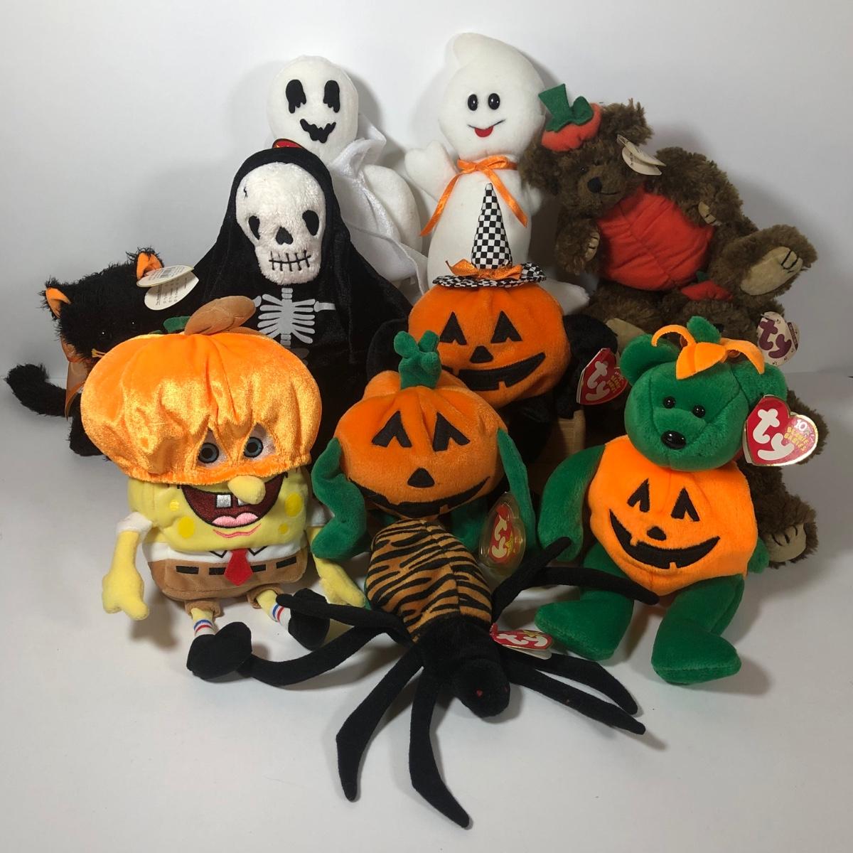 LOT 222K: TY Halloween Beanie Babies - Most w/ Tags - Spongebob, Creepers, Vintage 1993 Pumpkin the Bear/Attic Treasures Collection & More