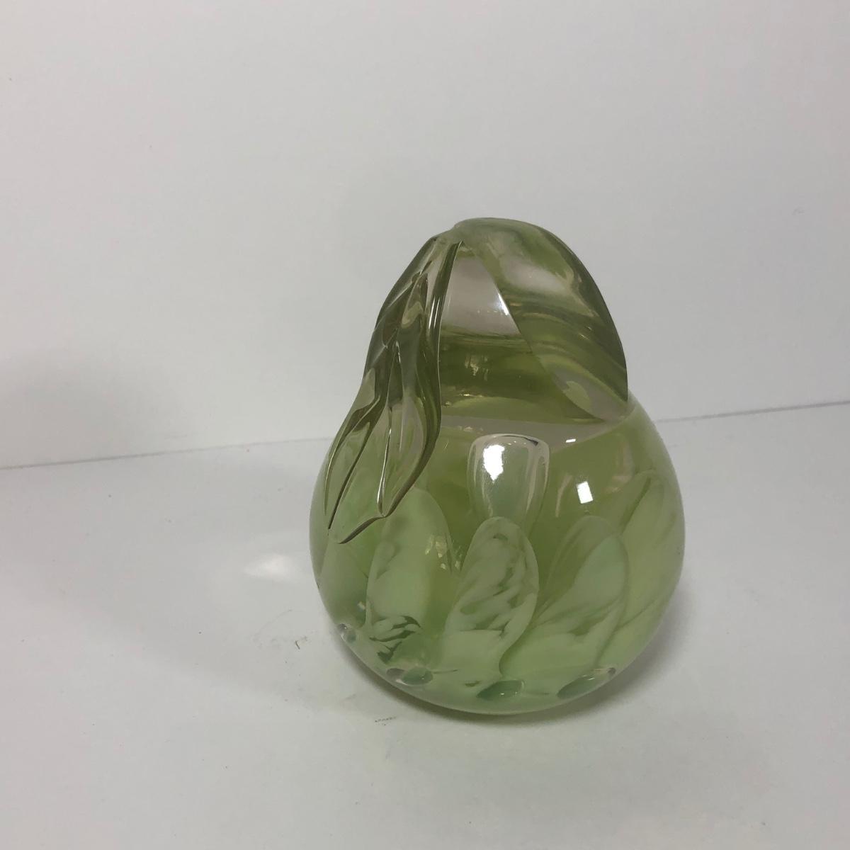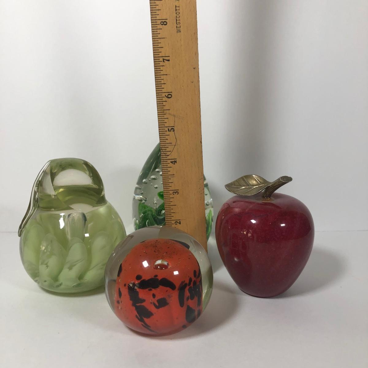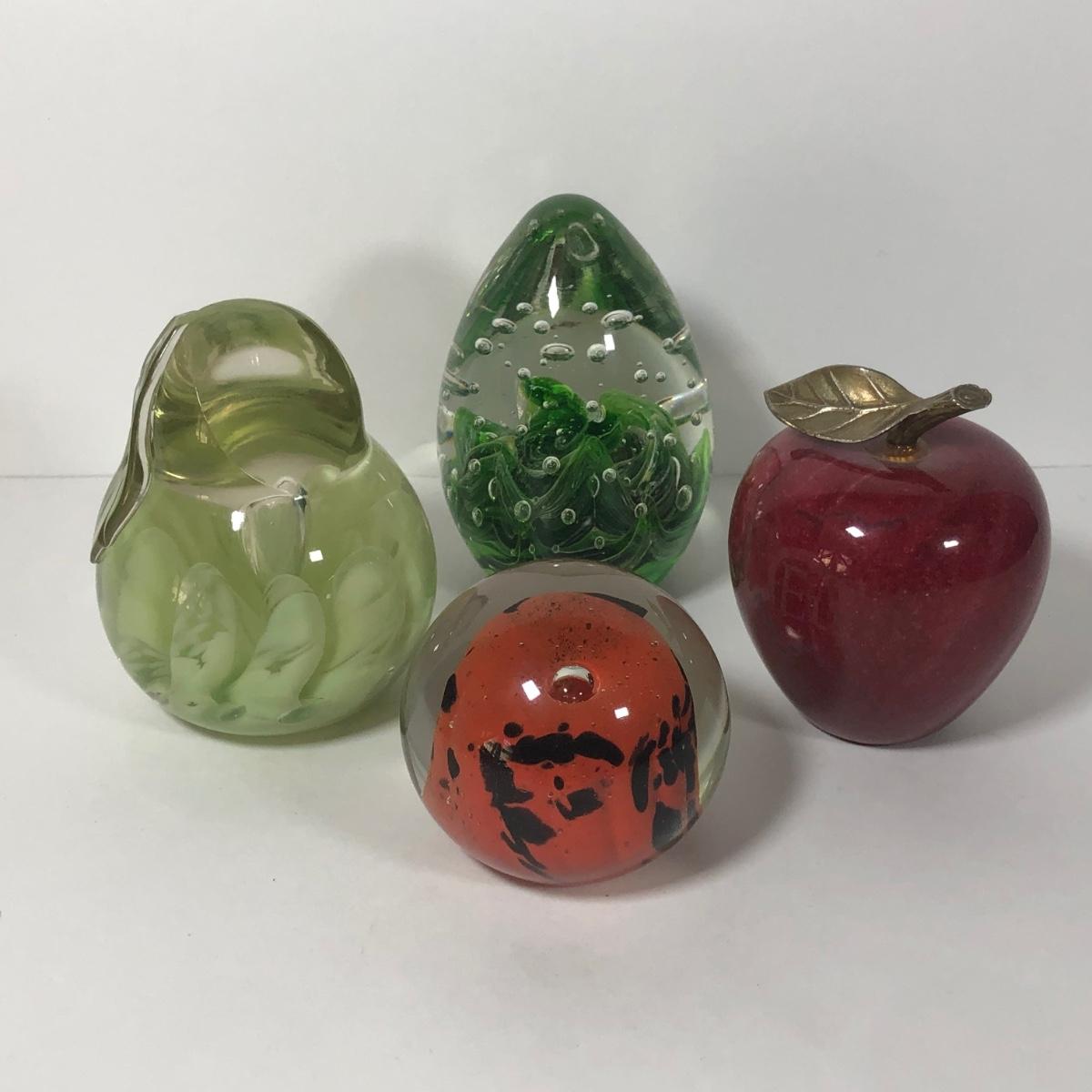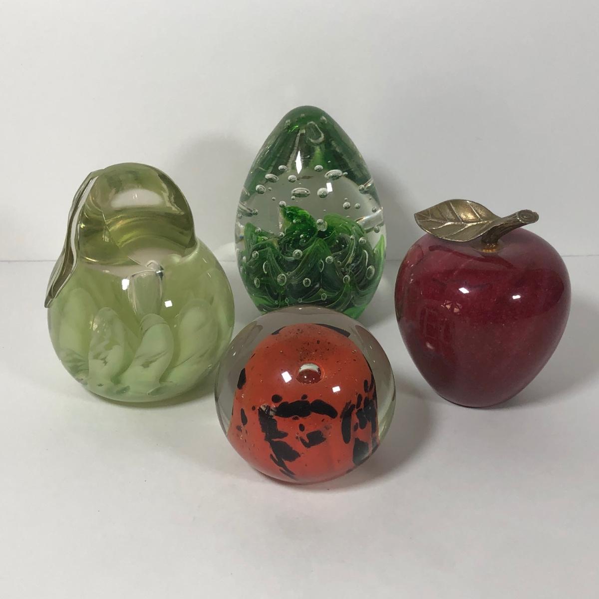 LOT 225K: Vintage Paperweights - Green Swirl Glass Egg, Green Glass Pear, Red Marble Apple & Orange Glass Orb made in Lithuania