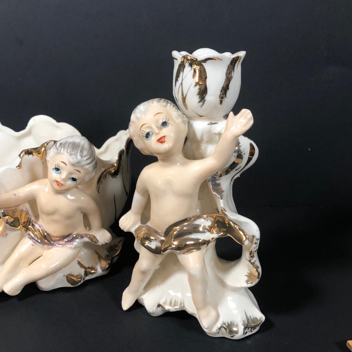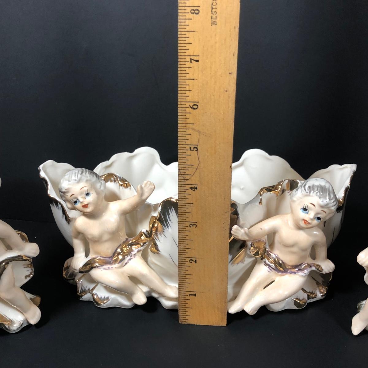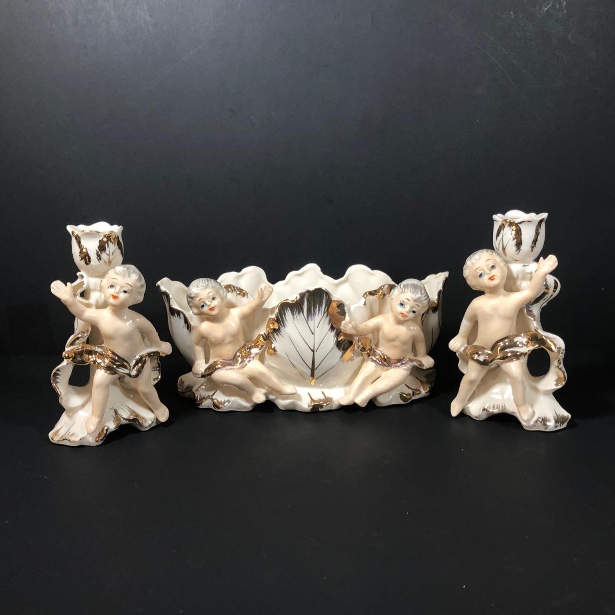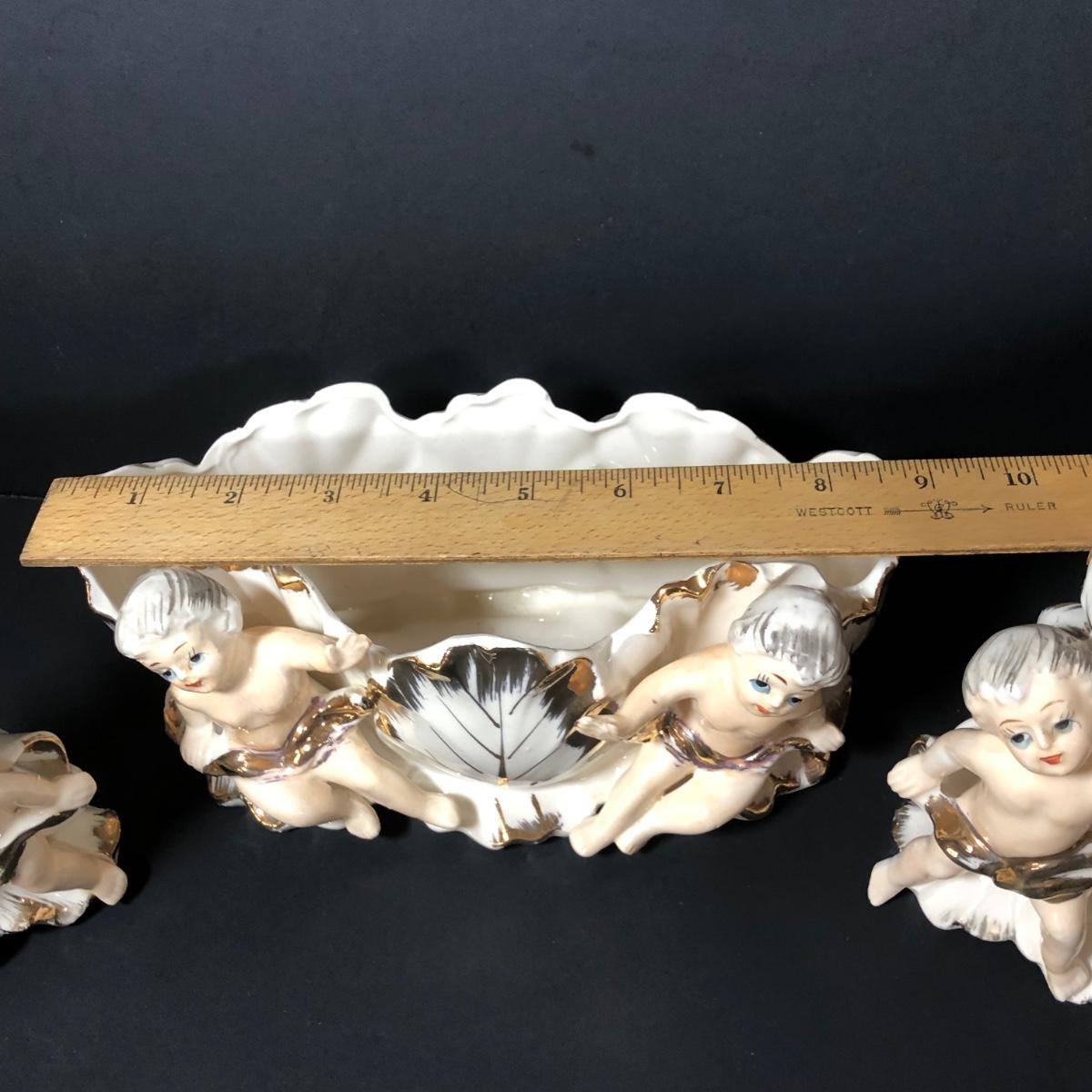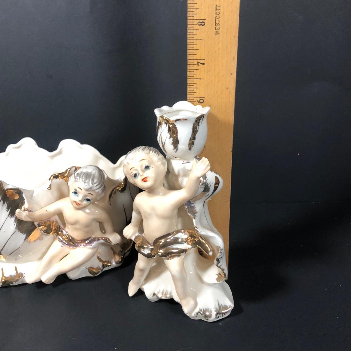 LOT 230K: Vintage White & Gold Ceramic Cherub Set - Candle Holders & Planter/Centerpiece