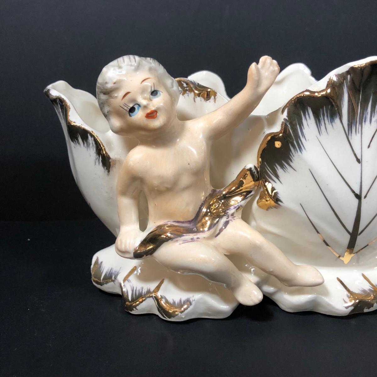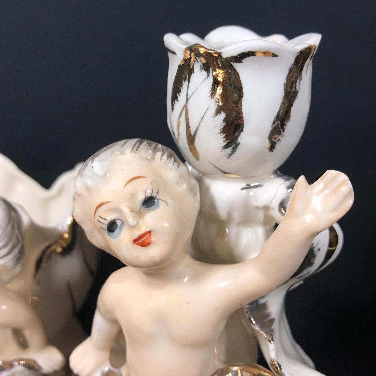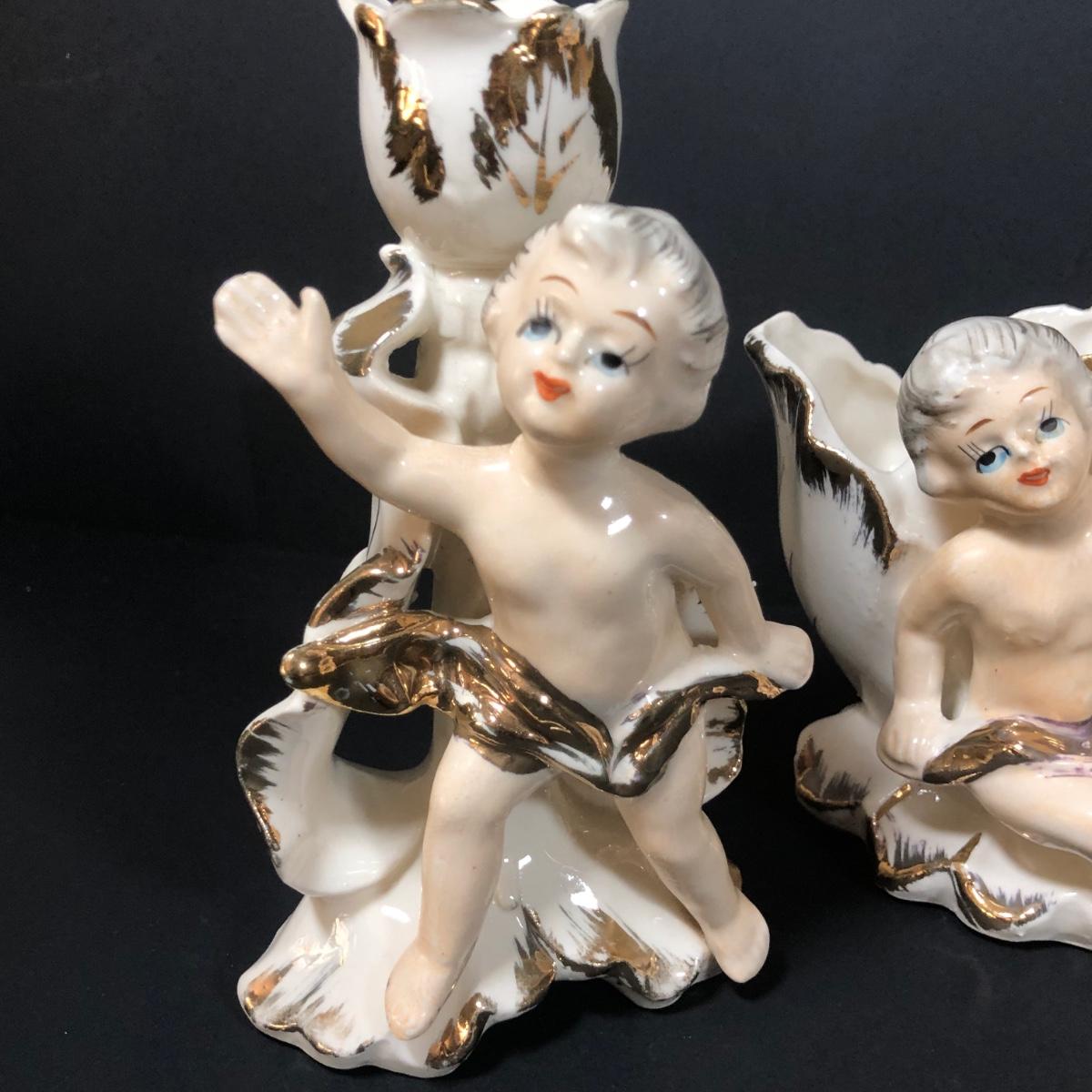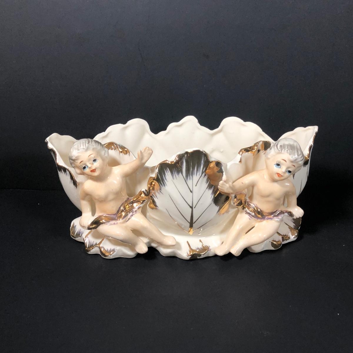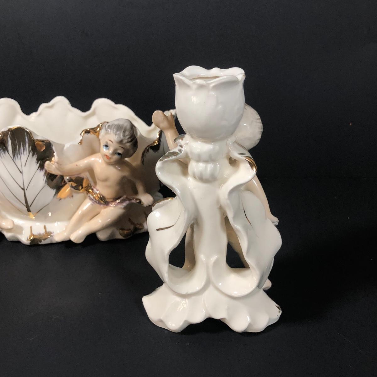 LOT 230K: Vintage White & Gold Ceramic Cherub Set - Candle Holders & Planter/Centerpiece