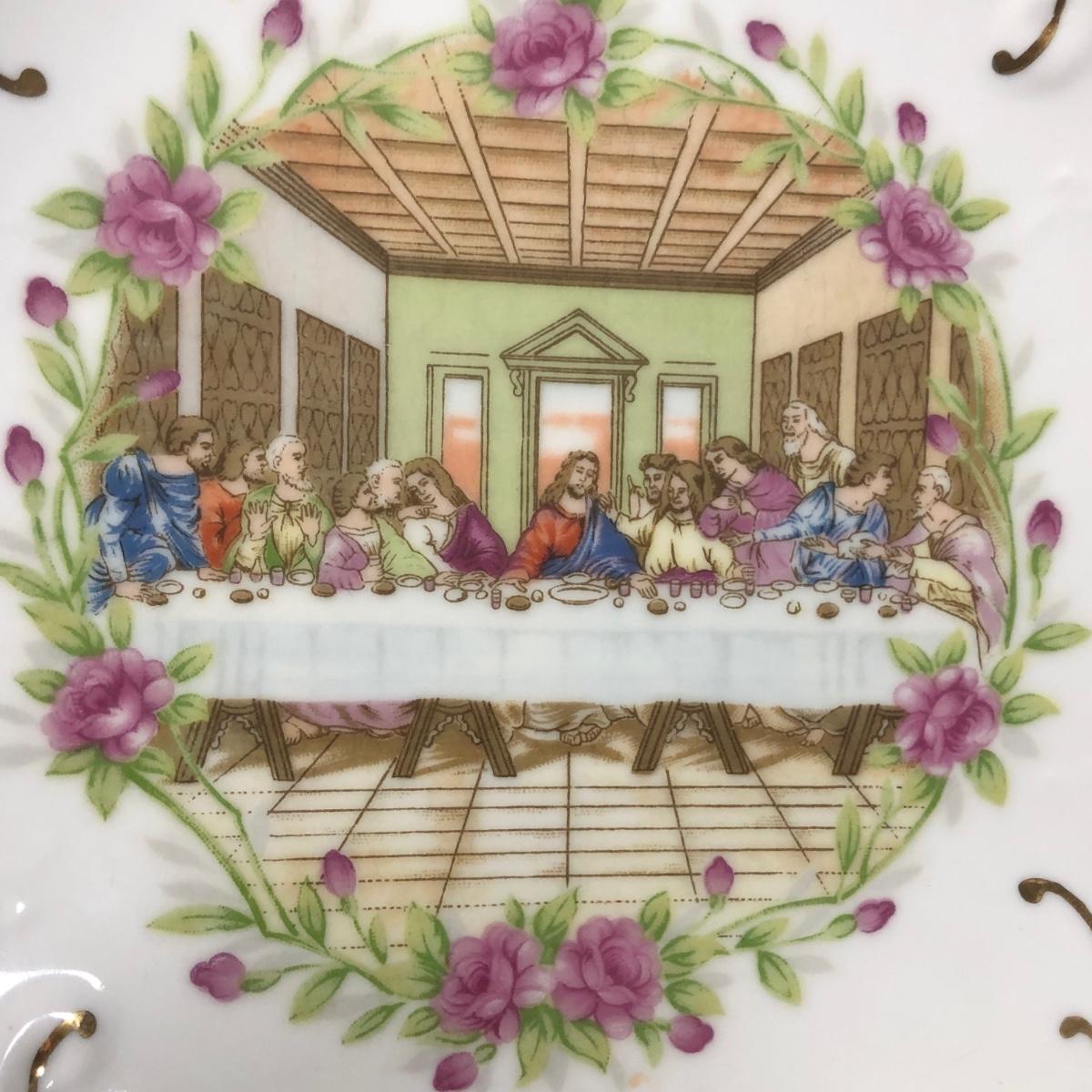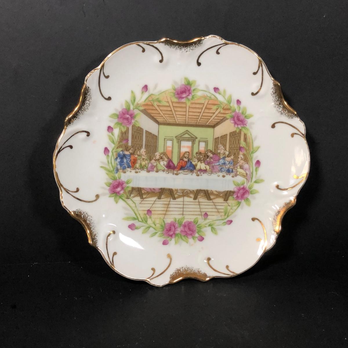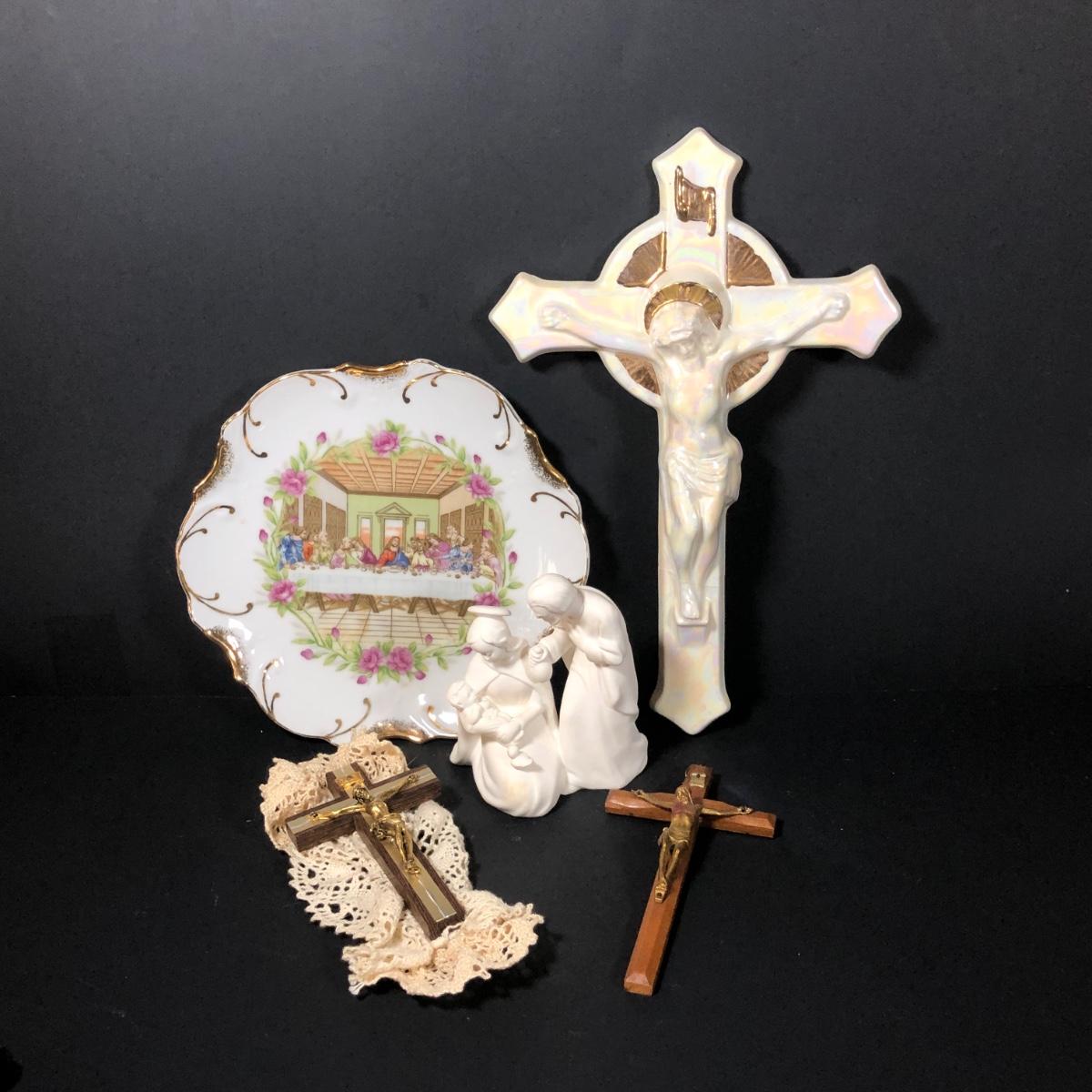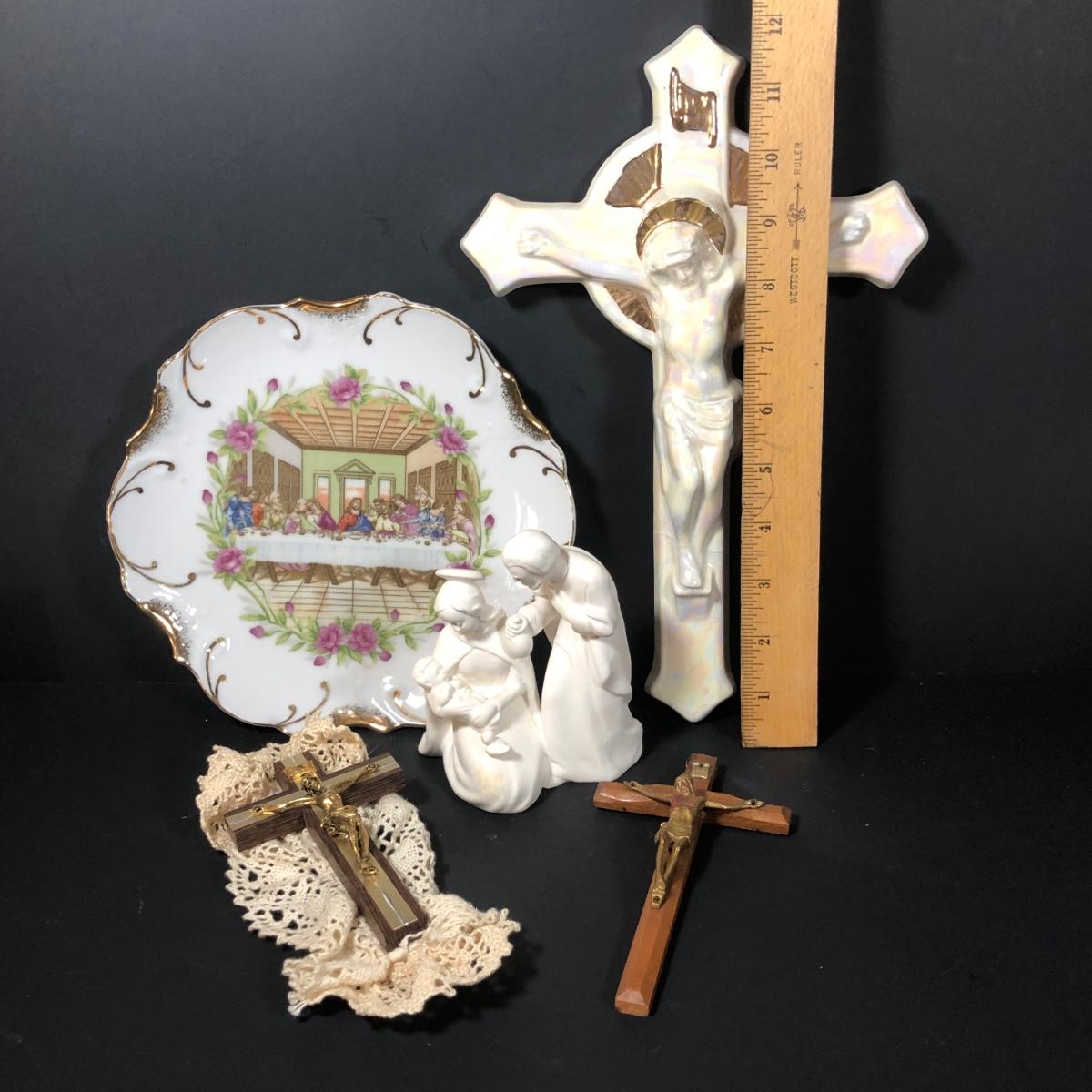 LOT 231K: Decorative 18kt Gold Accent Last Supper Plate, Crucifixes made in Italy, White Goebel Holy Family Figure & White & Gold Porcelain Crucifix