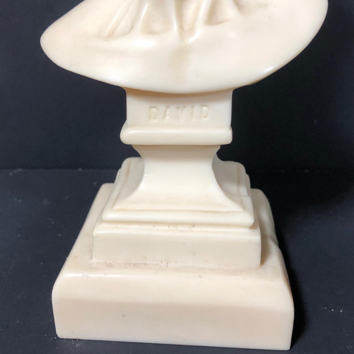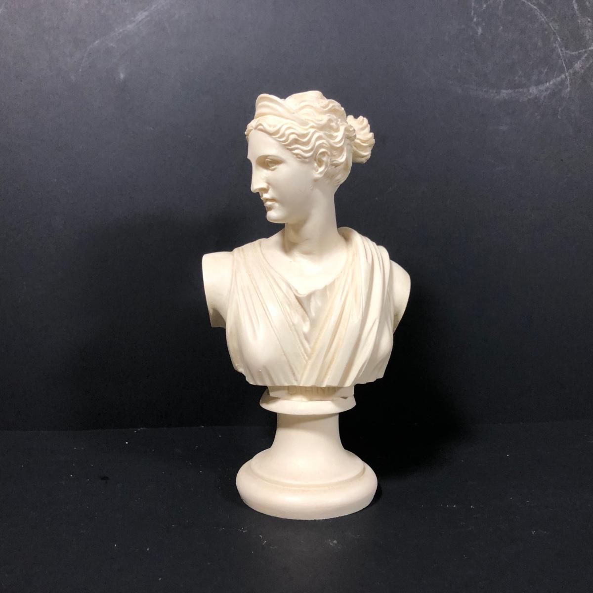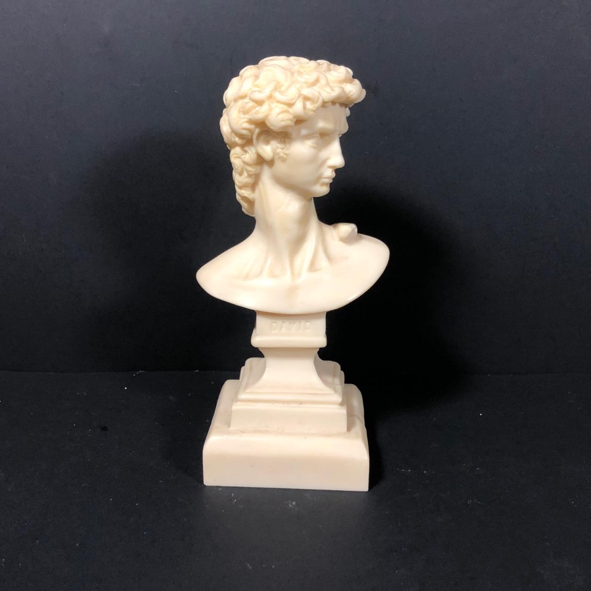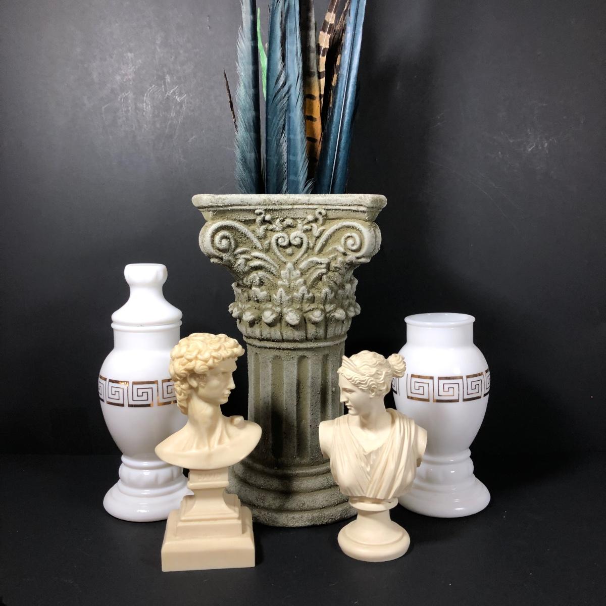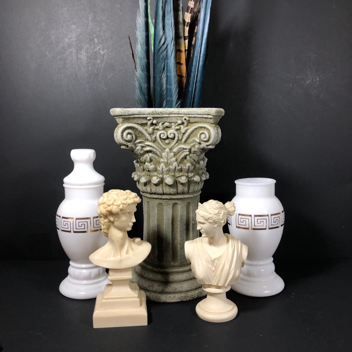 LOT 236K: Artemis Diana Bust Sculpture, David Bust Sculpture, Milk Glass Pedestal Apothecary Jars w/ Gold Greek Key (One with Lid, one without) & Column Planter Marked LBK