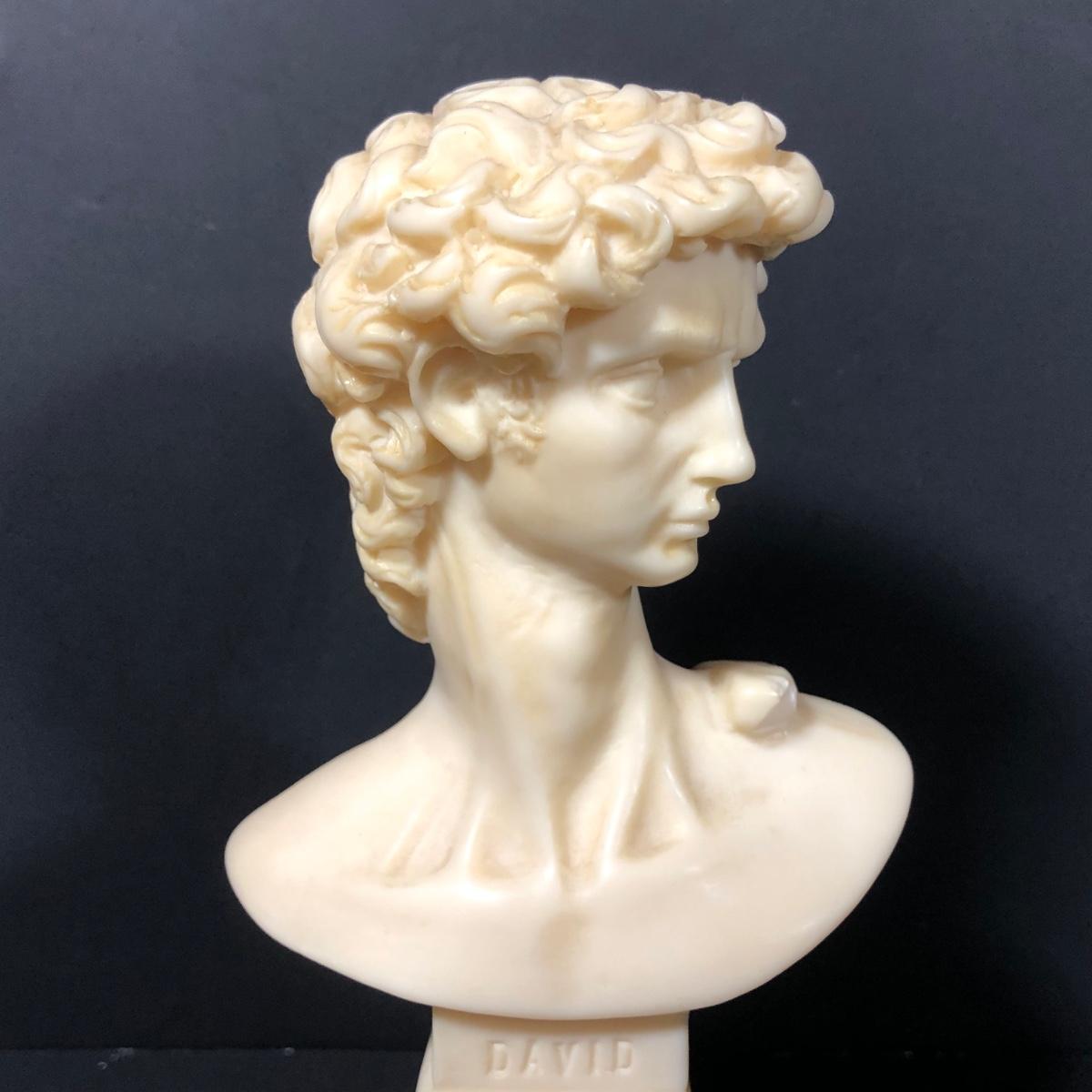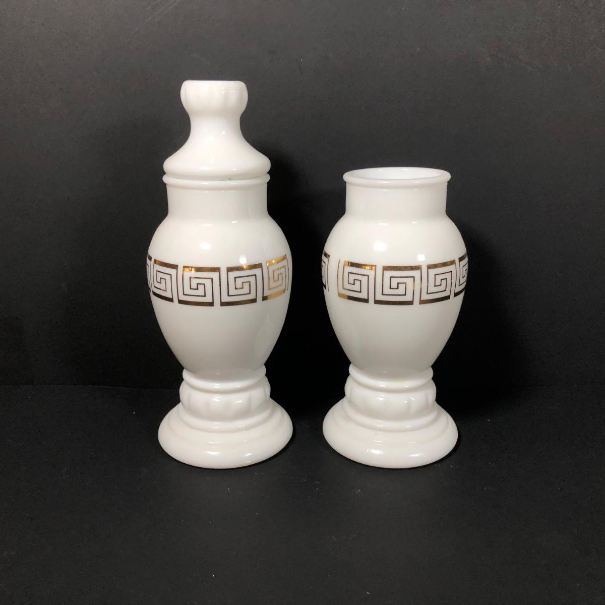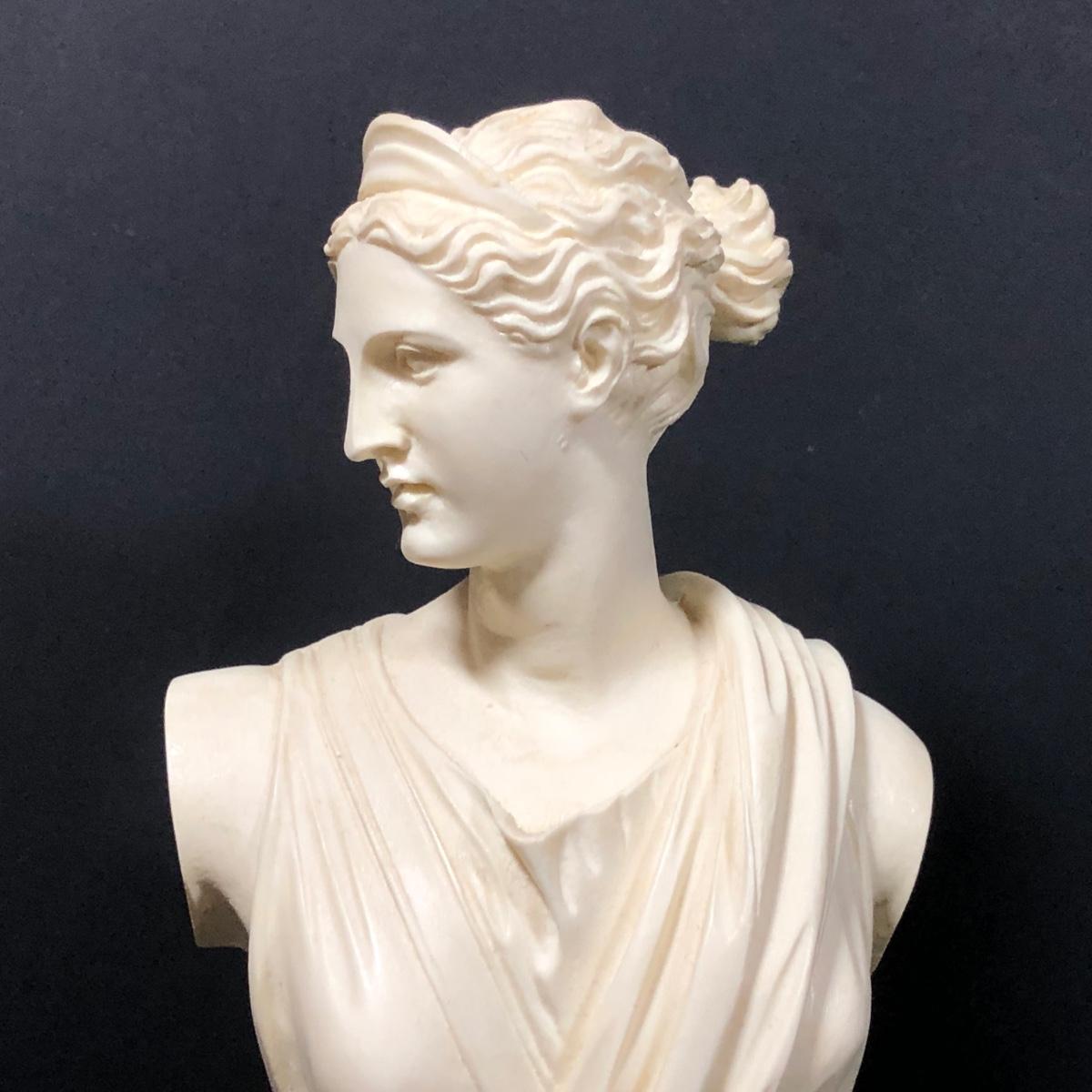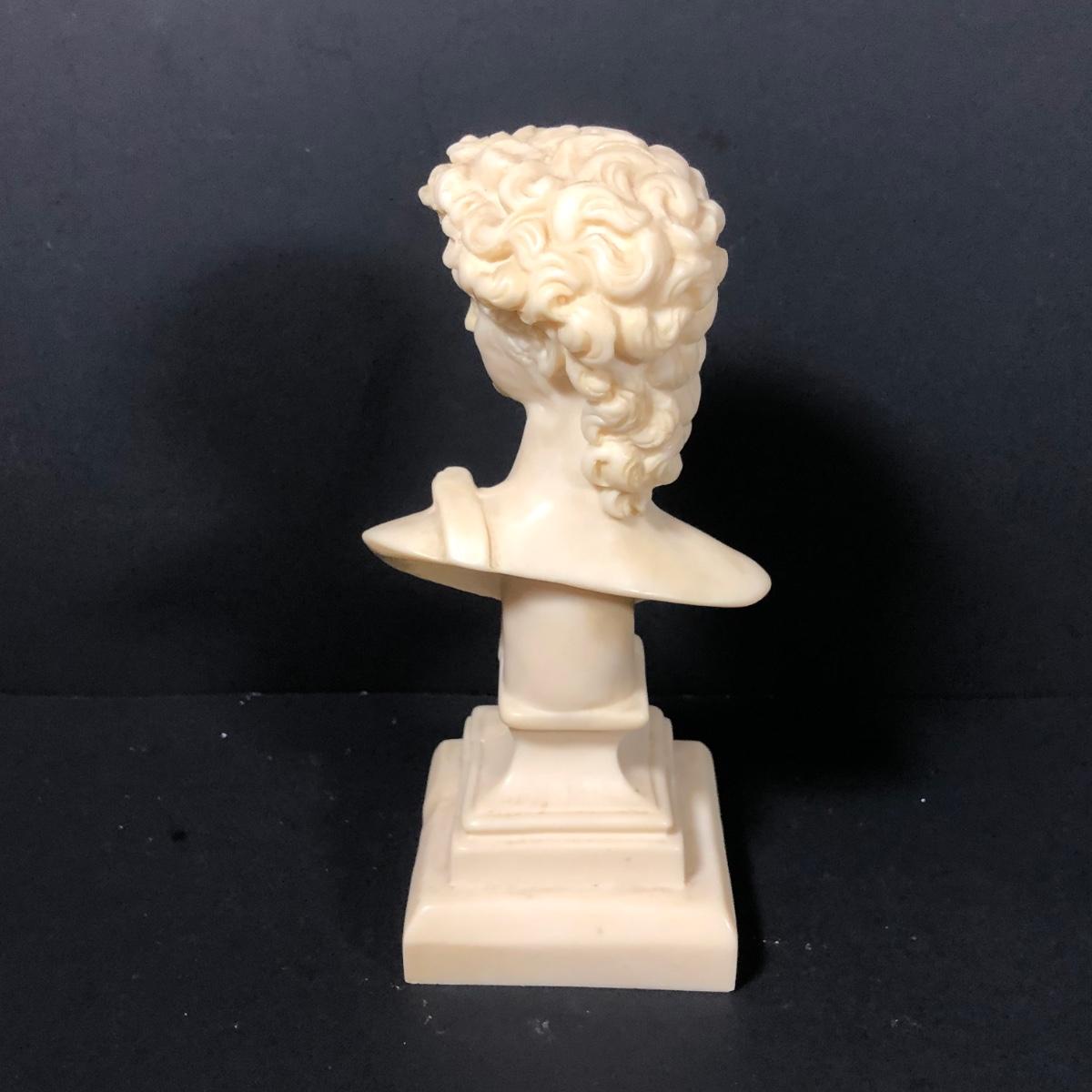 LOT 236K: Artemis Diana Bust Sculpture, David Bust Sculpture, Milk Glass Pedestal Apothecary Jars w/ Gold Greek Key (One with Lid, one without) & Column Planter Marked LBK