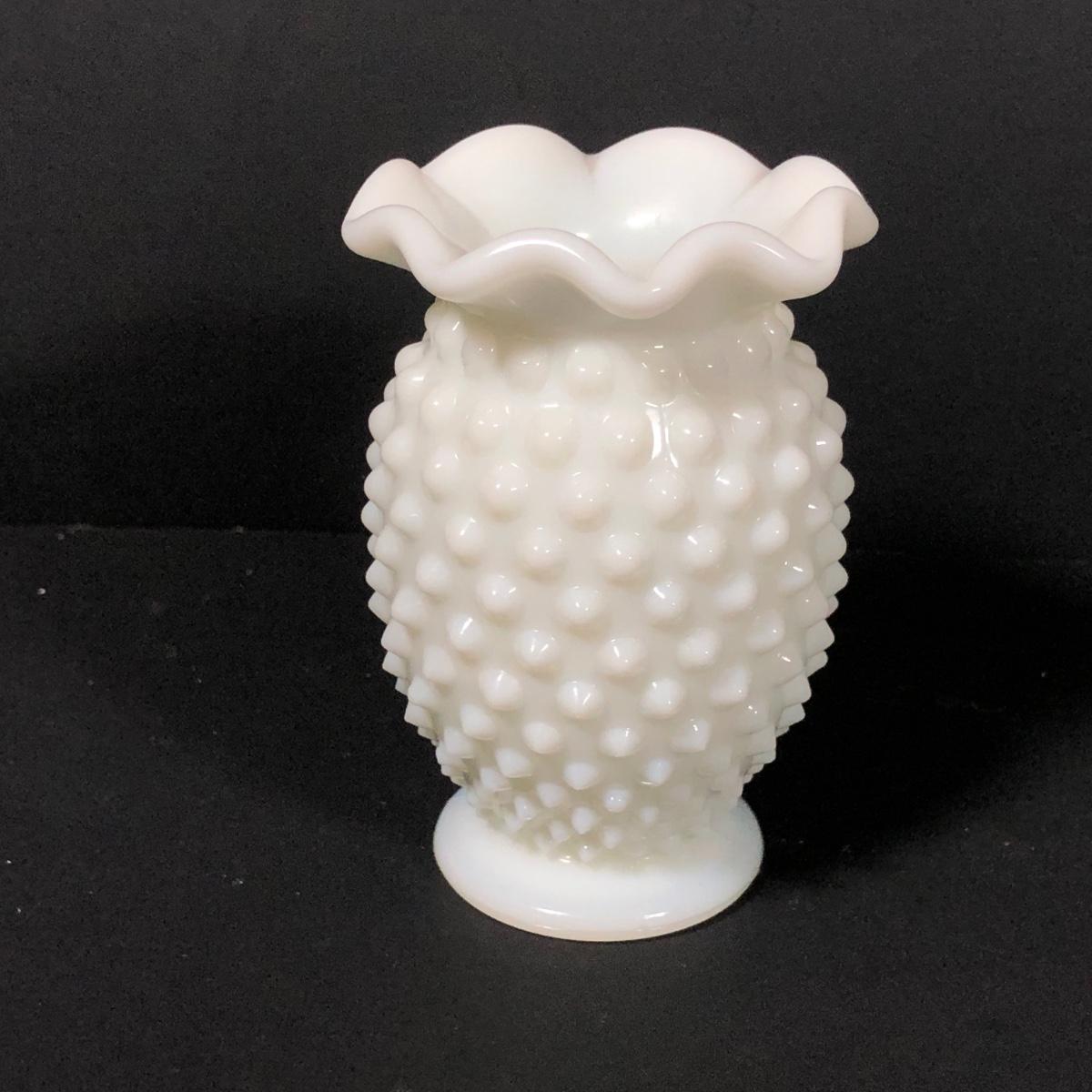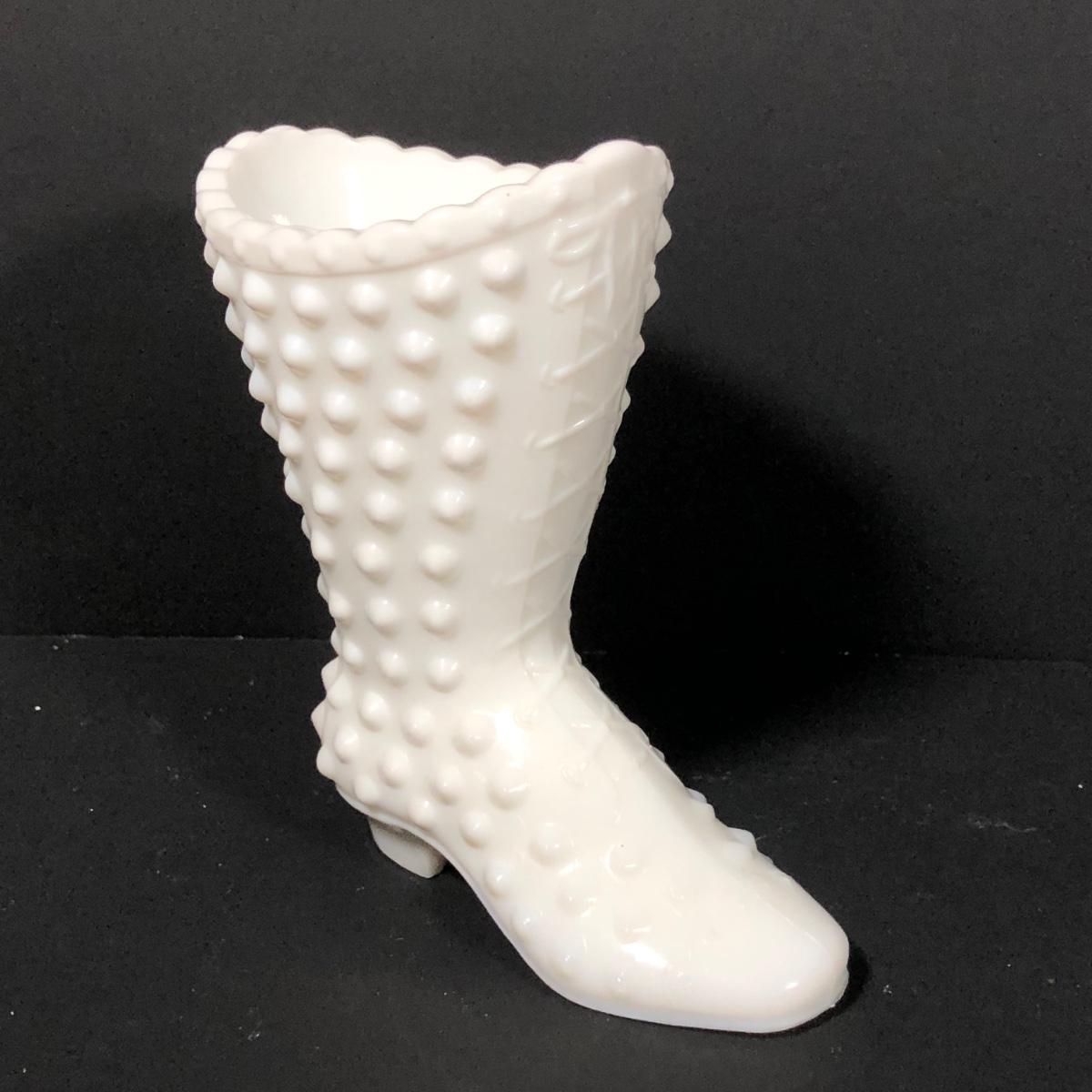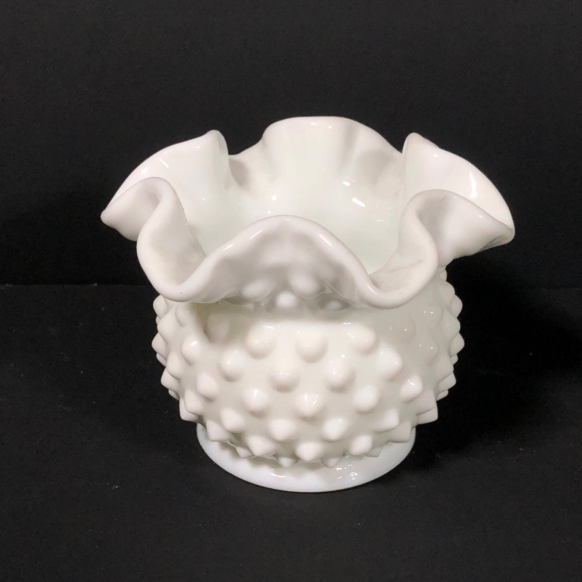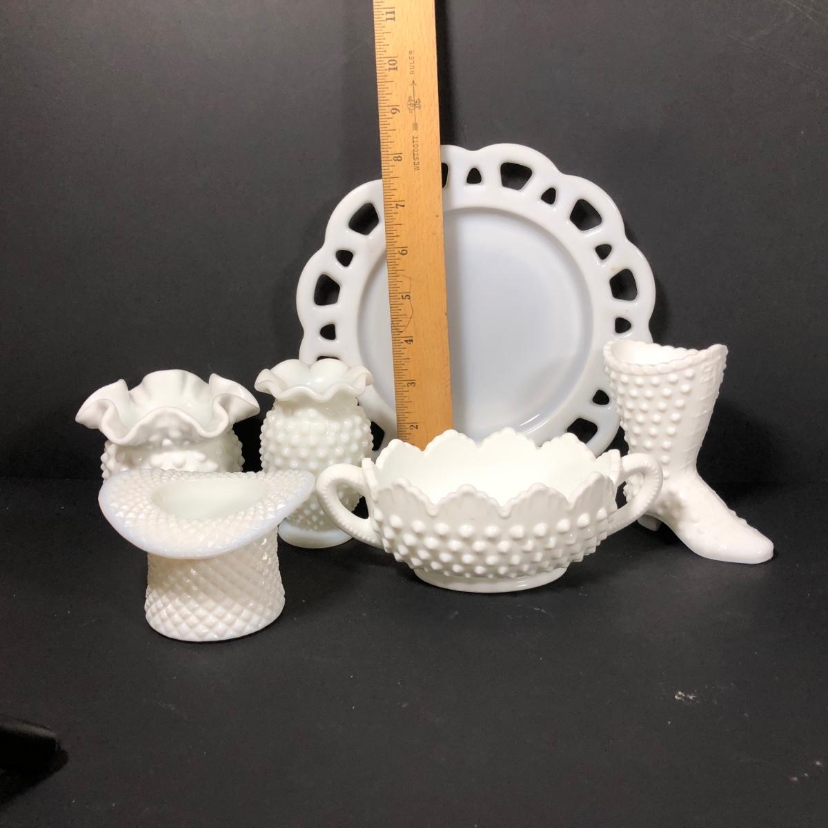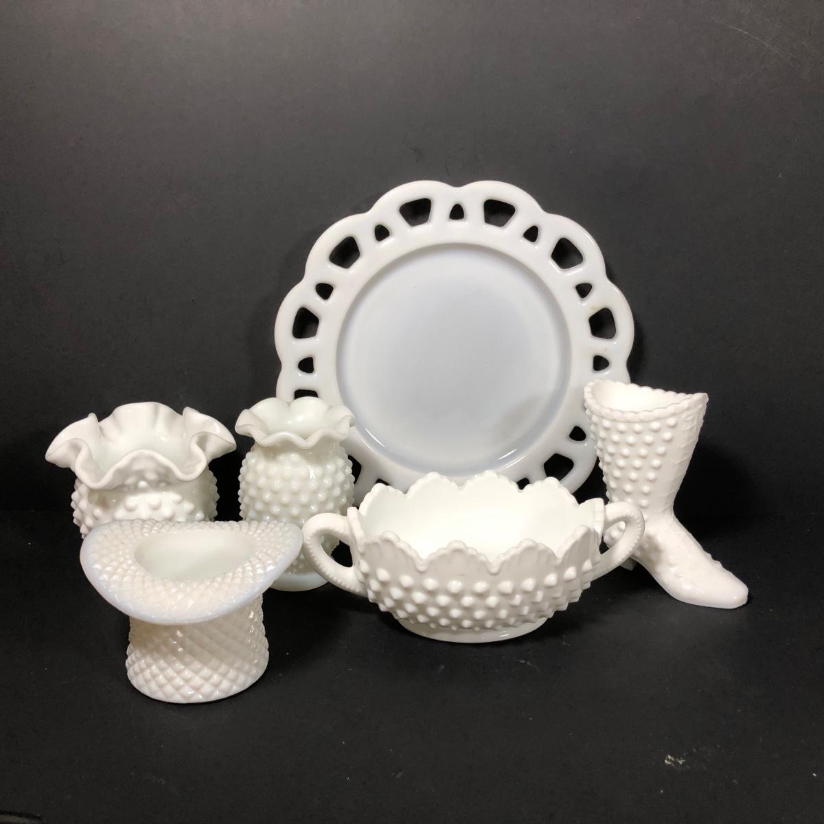 LOT 237K: Milk Glass - Hazel Atlas Lace Edge Plate, Fenton Hobnail Nut Bowl w/ Handles, Fenton Hobnail Victorian Lace Boot, Hobnail Ruffled Edge Vases & Top Hat Toothpick Holder