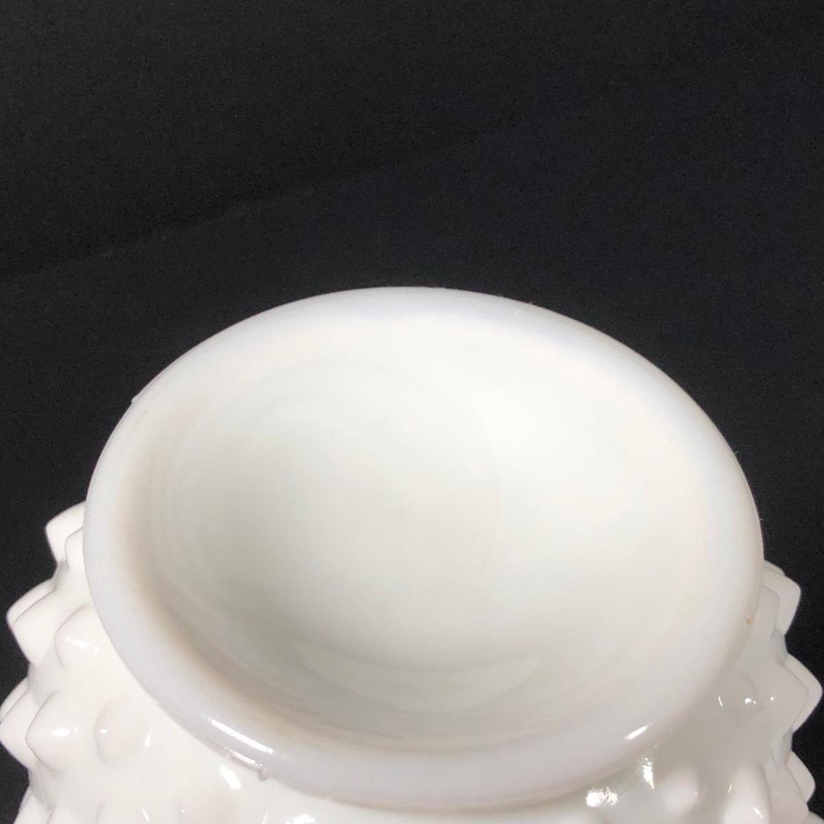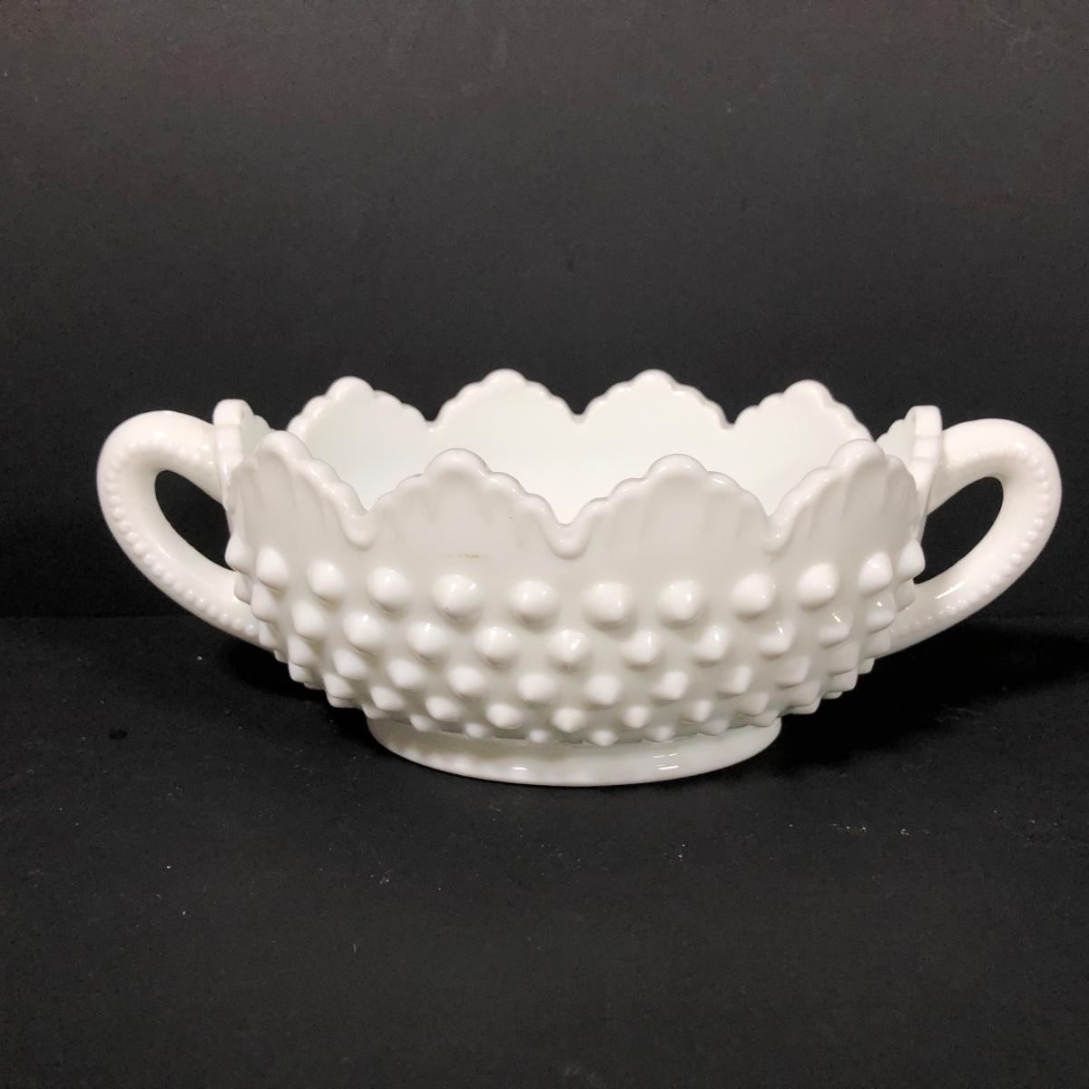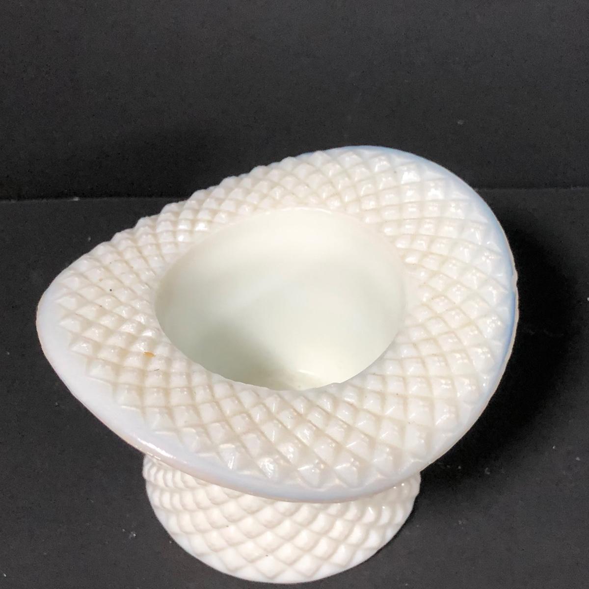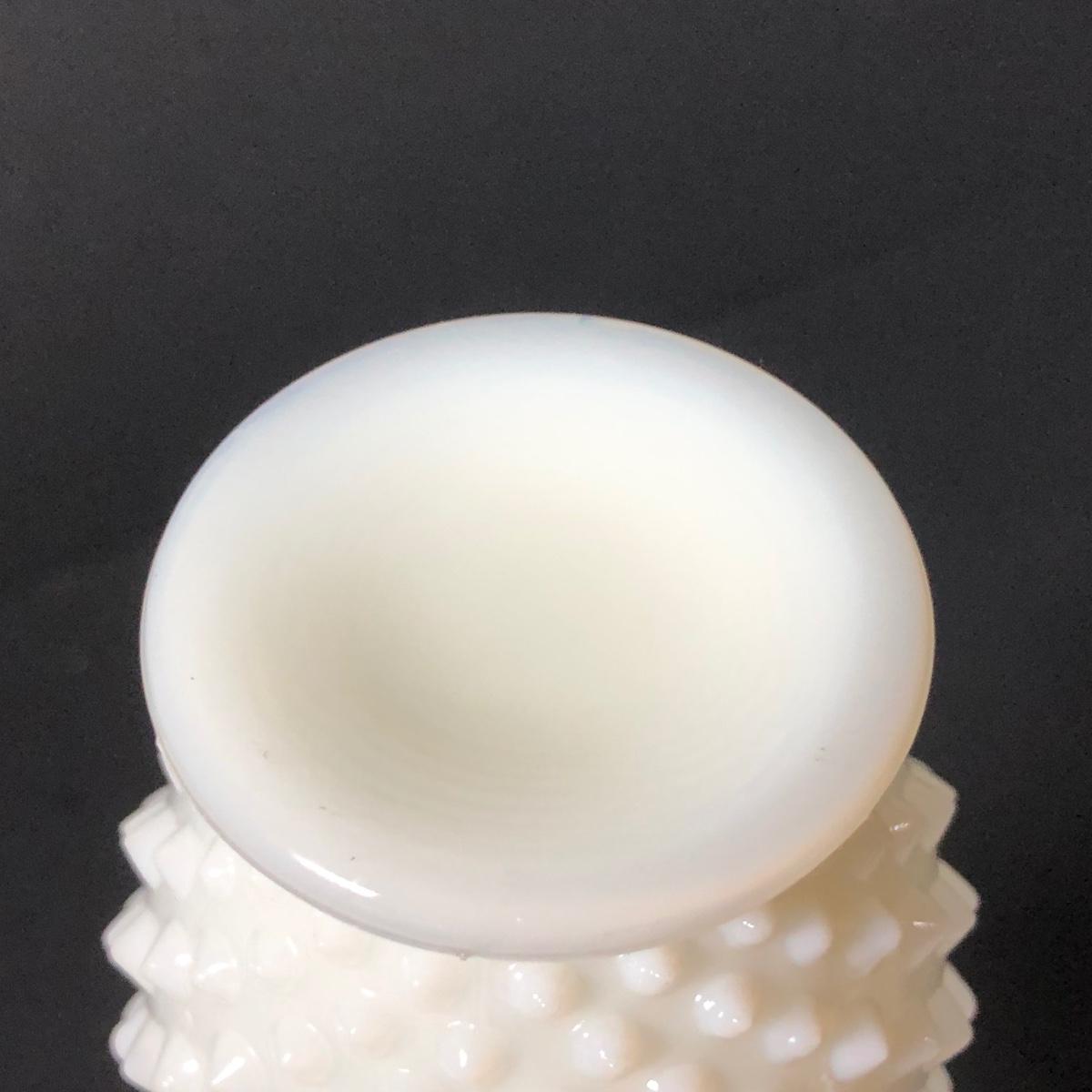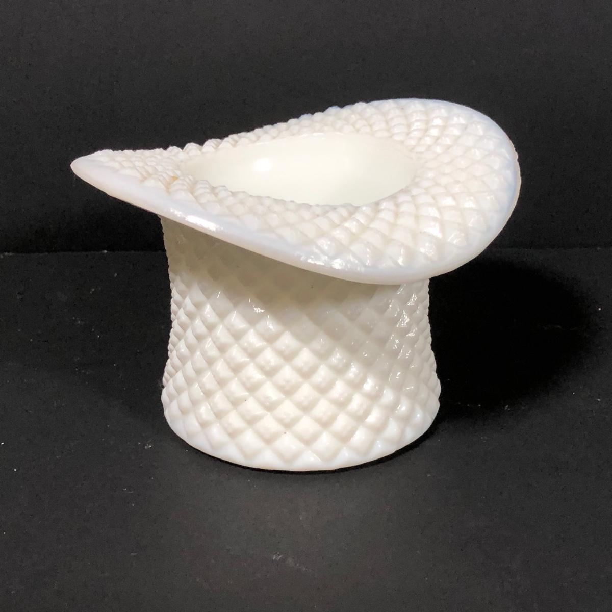 LOT 237K: Milk Glass - Hazel Atlas Lace Edge Plate, Fenton Hobnail Nut Bowl w/ Handles, Fenton Hobnail Victorian Lace Boot, Hobnail Ruffled Edge Vases & Top Hat Toothpick Holder