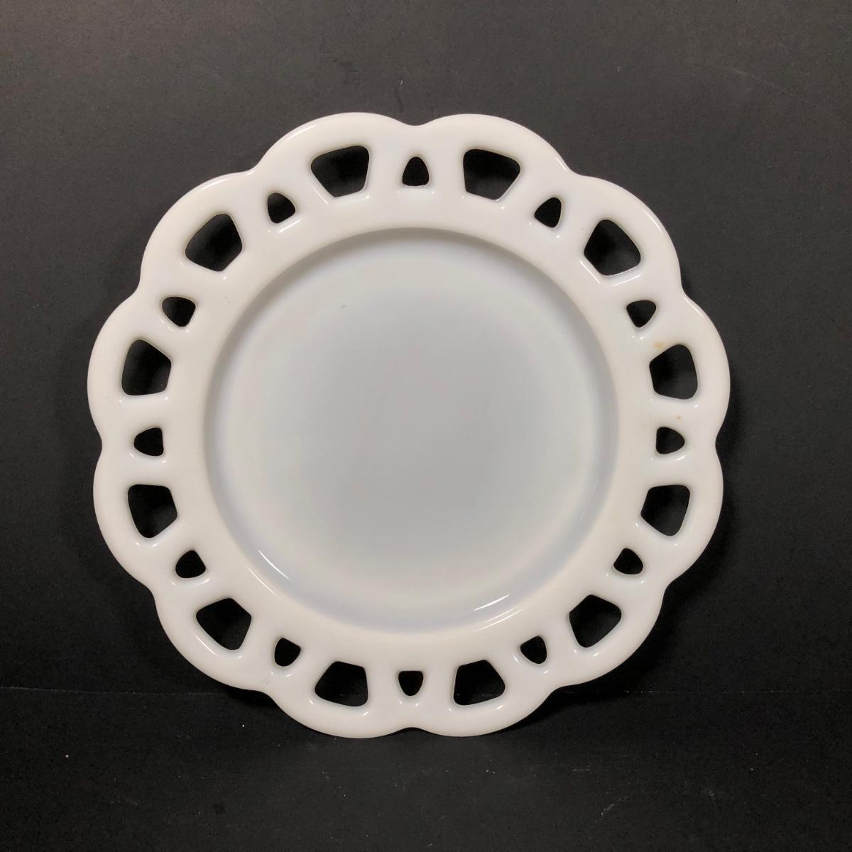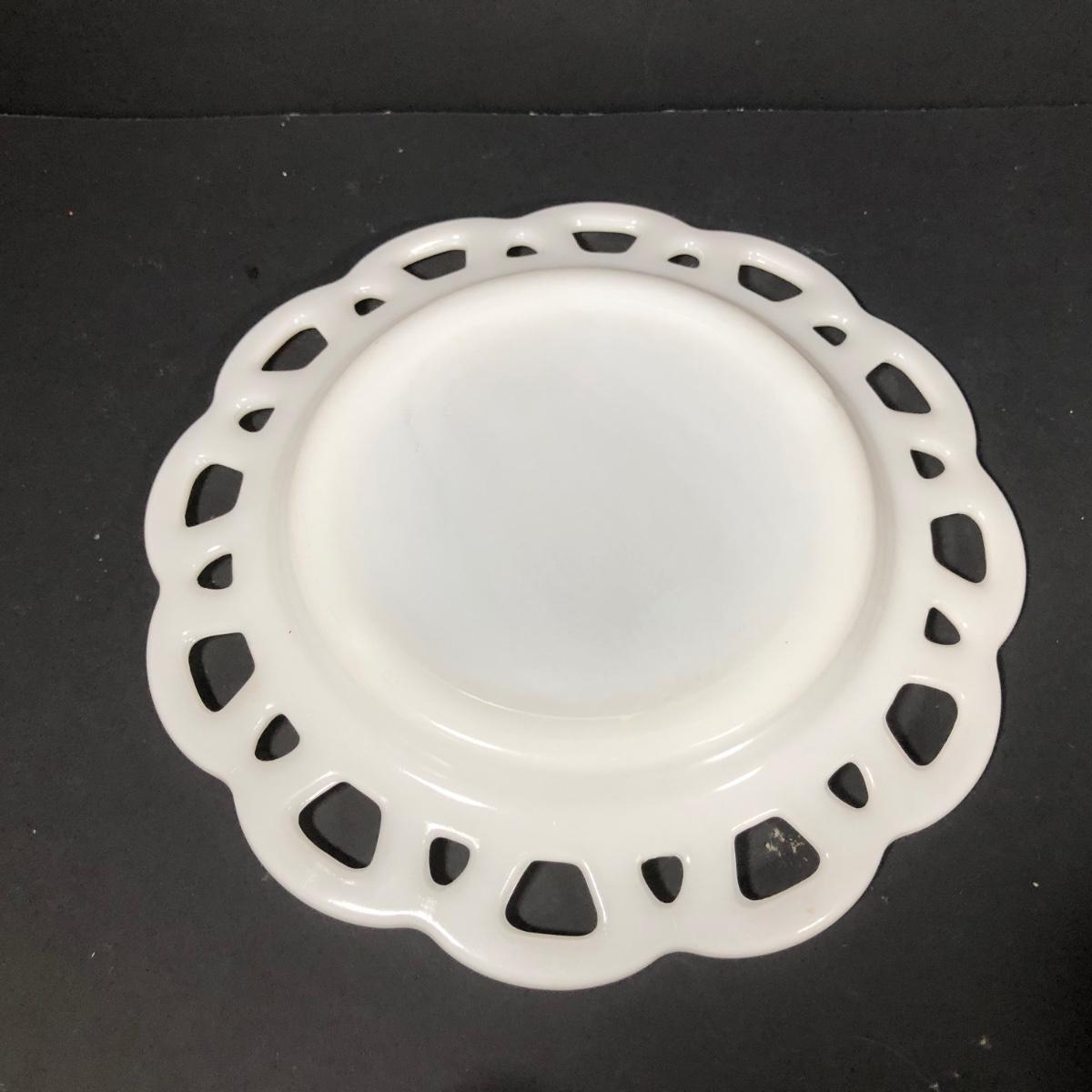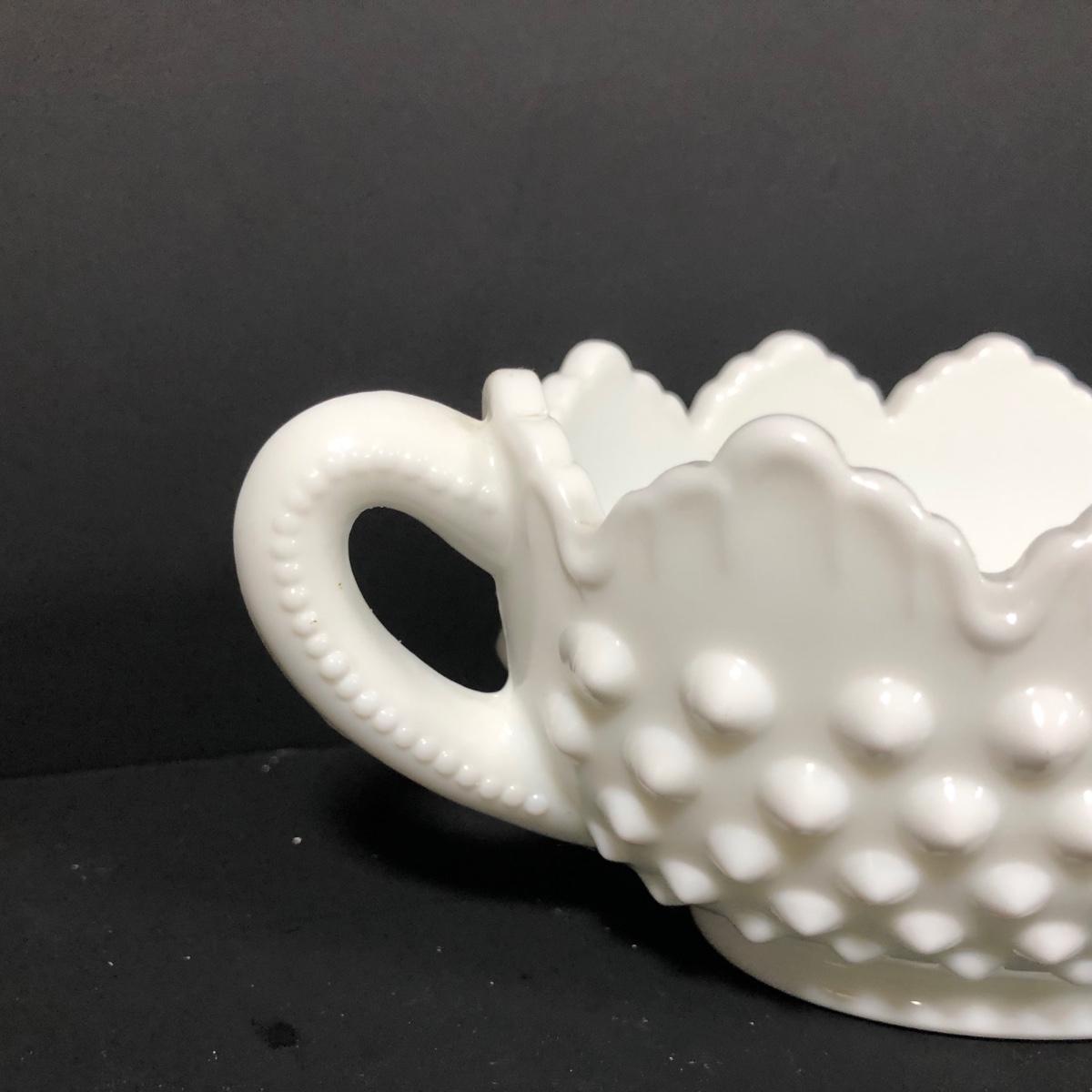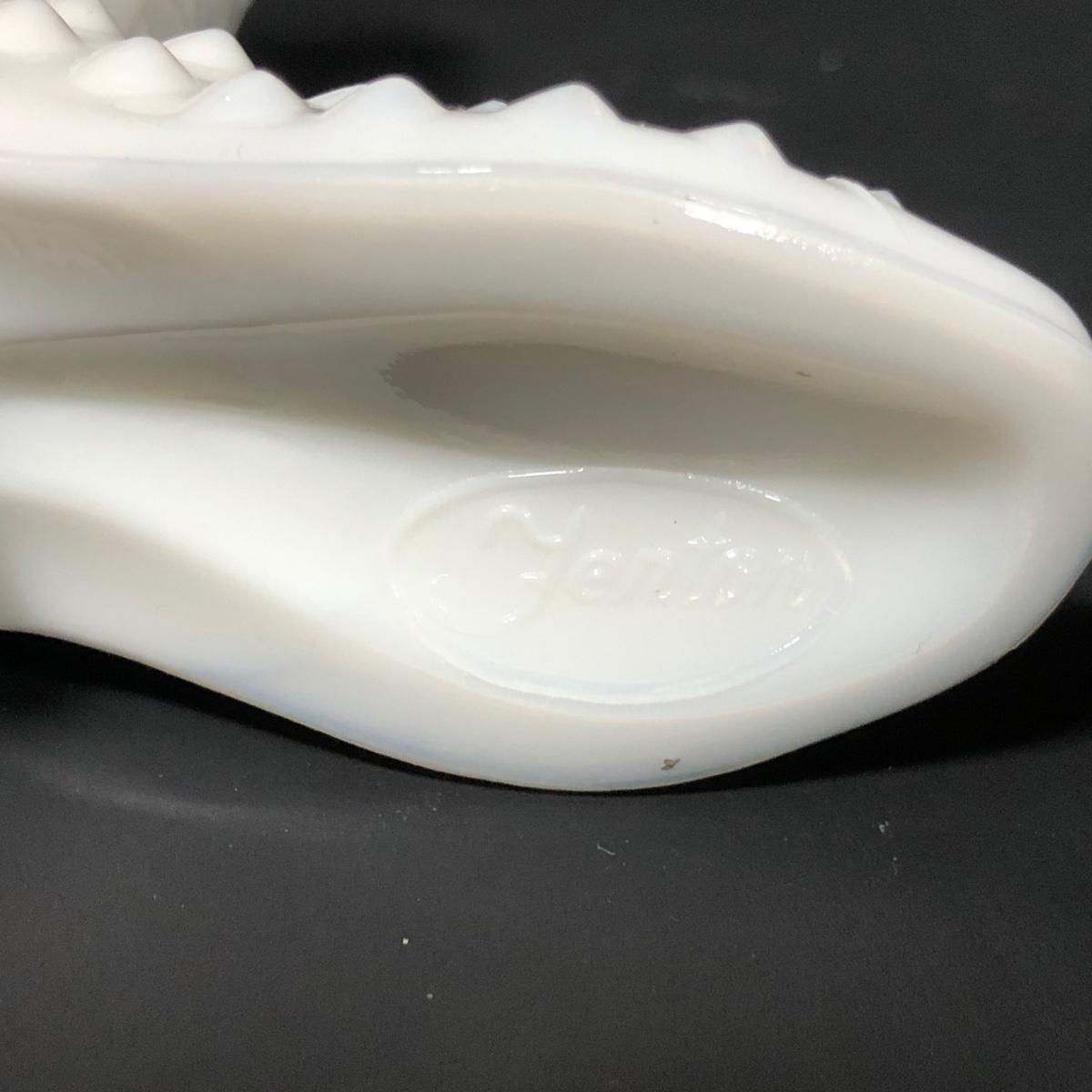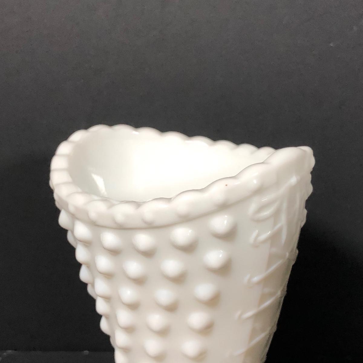 LOT 237K: Milk Glass - Hazel Atlas Lace Edge Plate, Fenton Hobnail Nut Bowl w/ Handles, Fenton Hobnail Victorian Lace Boot, Hobnail Ruffled Edge Vases & Top Hat Toothpick Holder