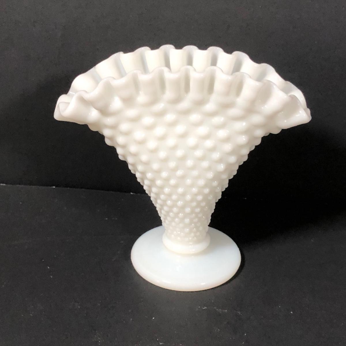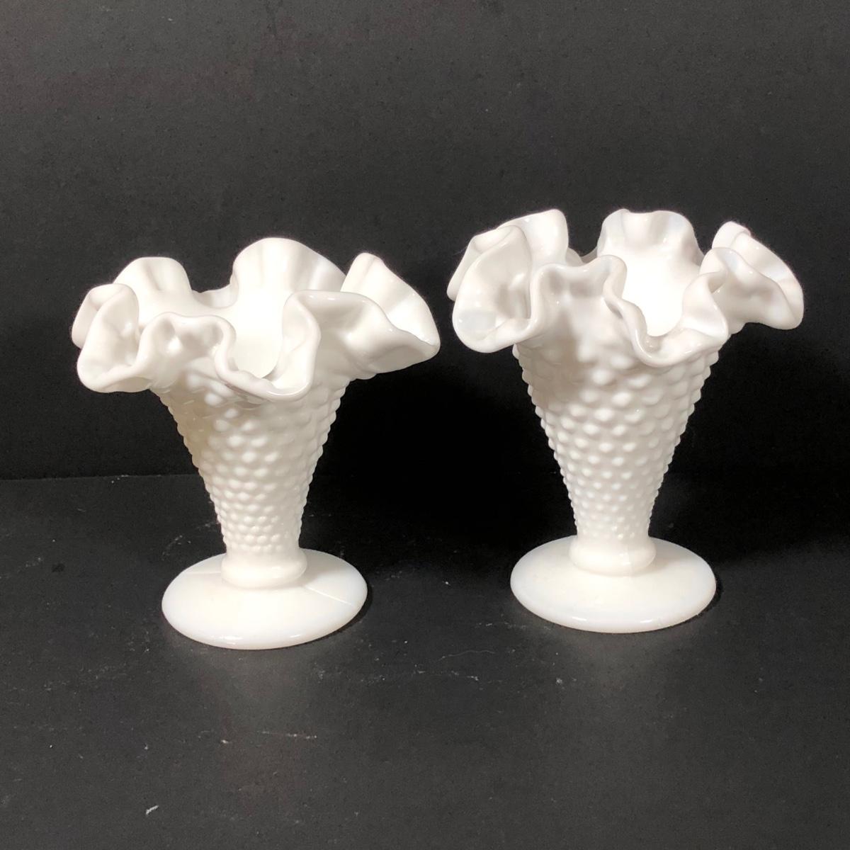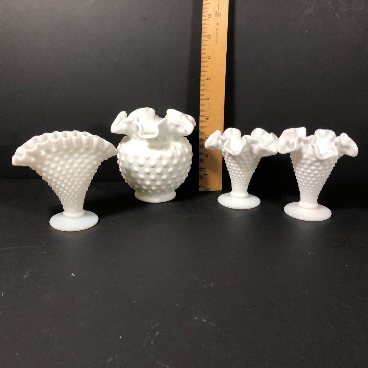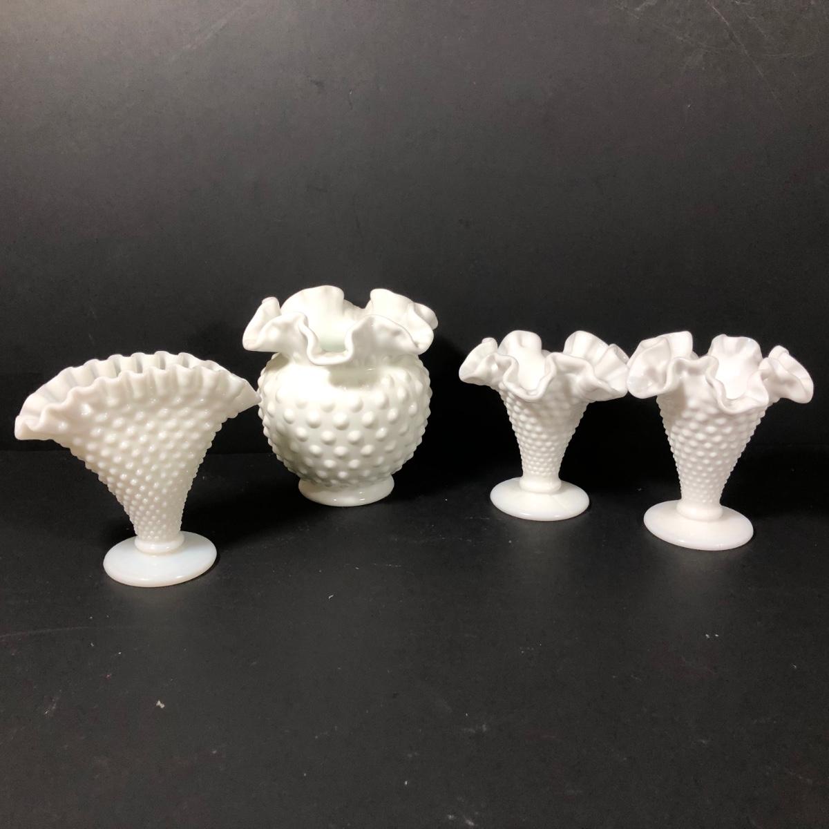 LOT 240W: Milk Glass - Fenton Hobnail Trumpet Vases, Hobnail Footed Vase & Hobnail Fan Vase