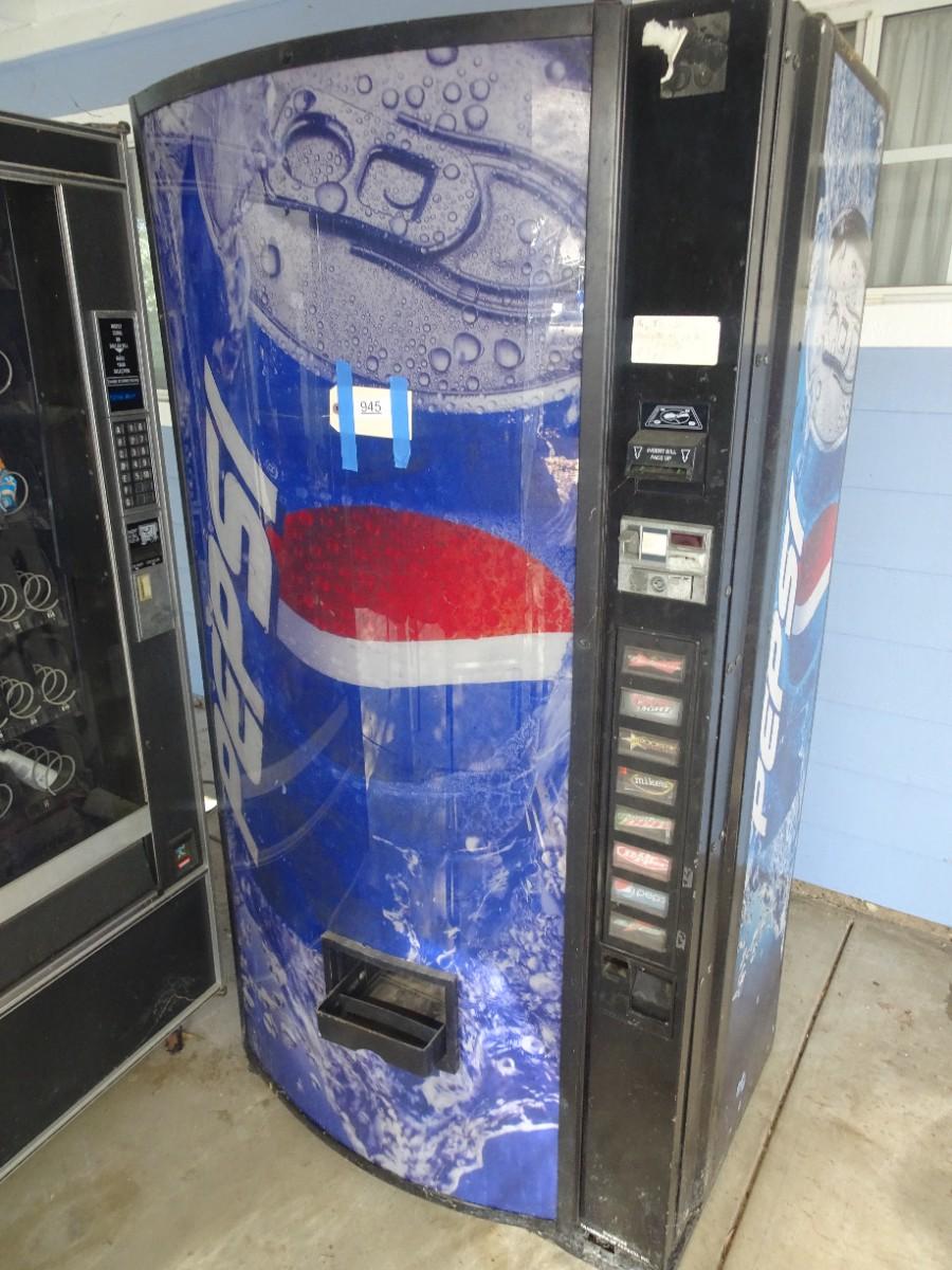 LOT 945. PEPSI VENDING MACHINE. NOT TESTED. MACHINE DOES POWER UP. THIS MACHINE IS VERY HEAVY. PLEASE DO NOT BID ON THIS MACHINE IF YOU DO NOT HAVE THE PROPER EQUIPMENT AND EXPERIENCE TO MOVE IT FROM THE SALE LOCATION.
