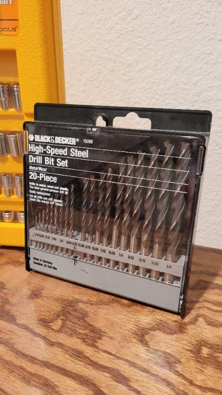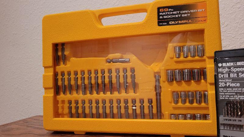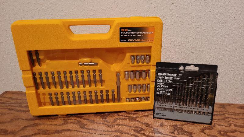 Lot 946: New High Speed Drill Bit Set and New Ratchet Driver and Socket Set (missing socket wrench)