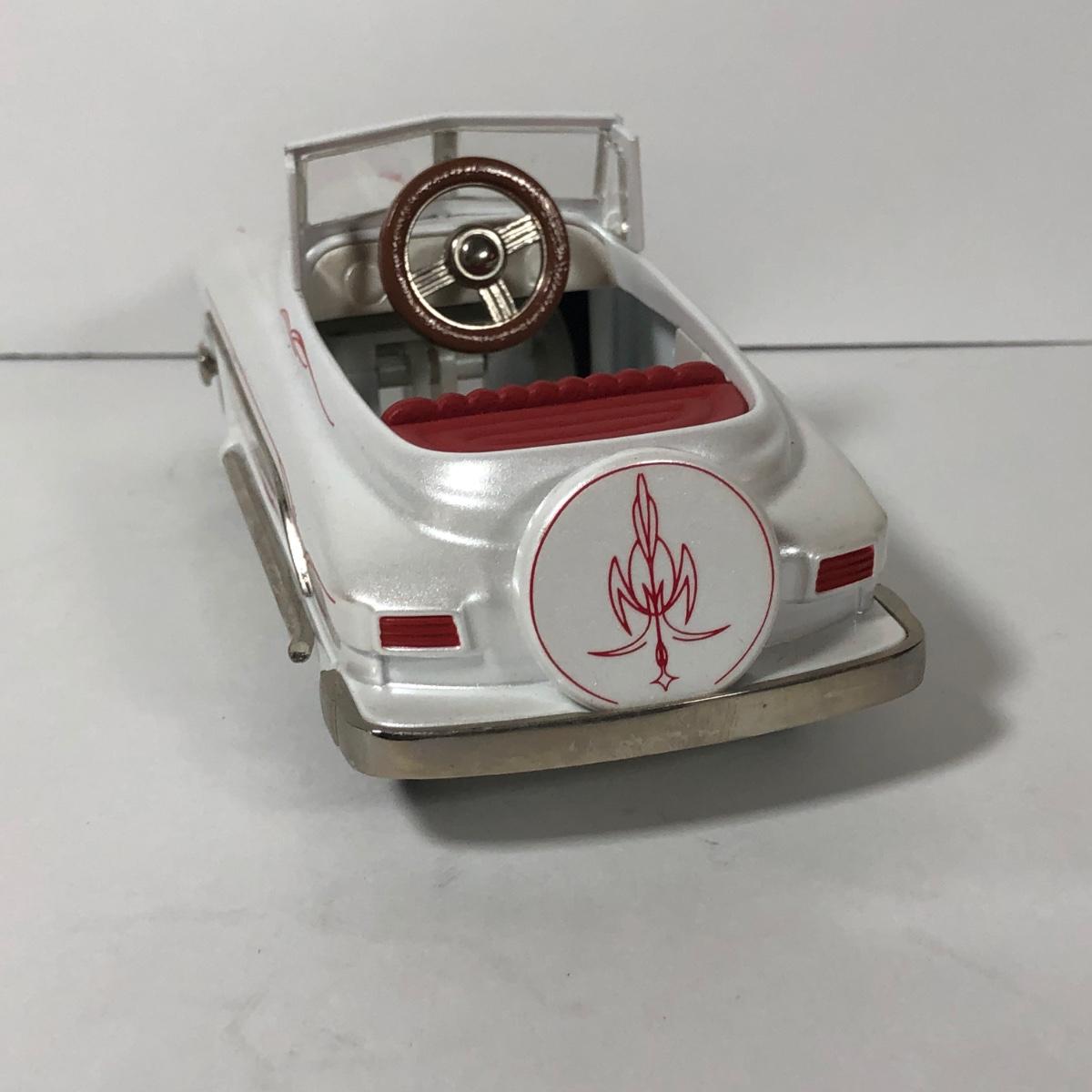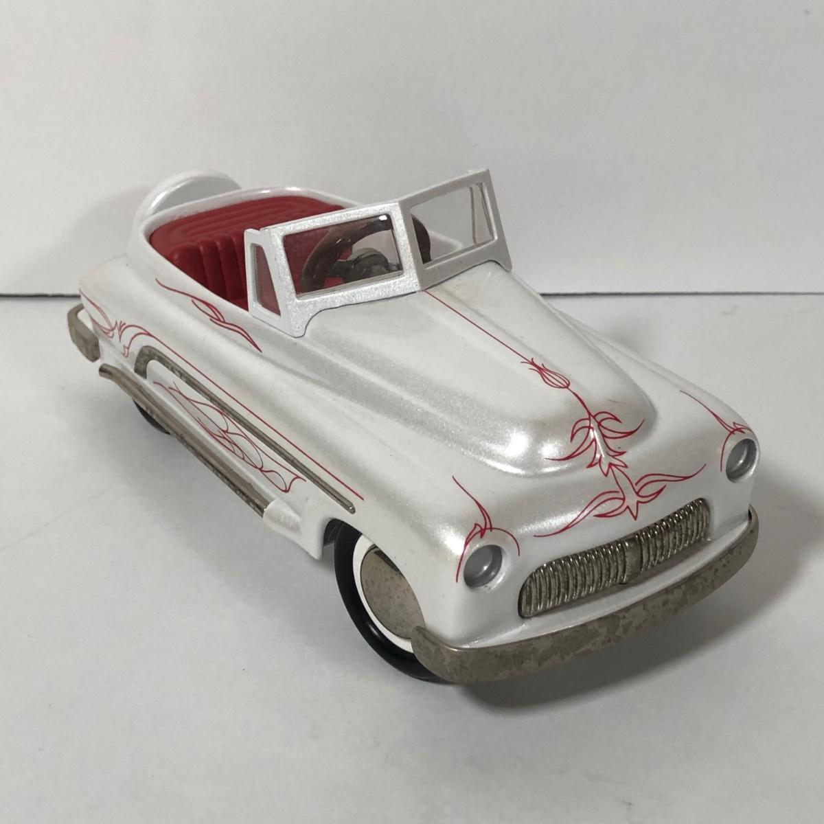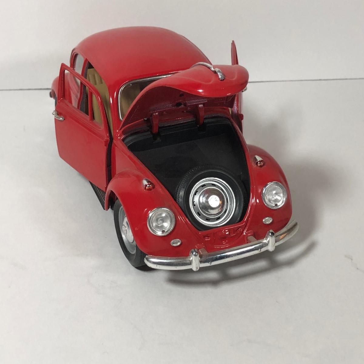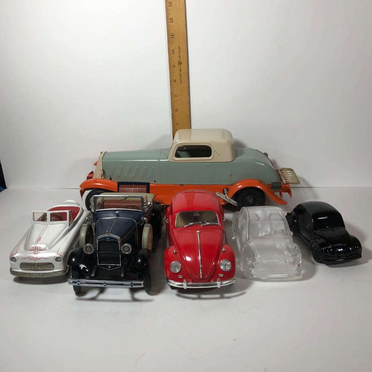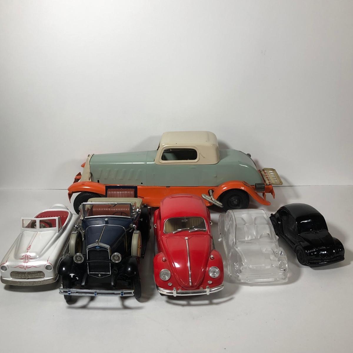 LOT 13F: Vintage Girard Pierce Arrow Coupe Windup Metal Car, 1931 Ford Model A Replica, 1967 Volkswagen Beetle Replica, Avon Volkswagen Bottle, Hallmark Classics 1950s Custom Convertible