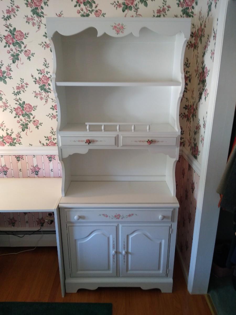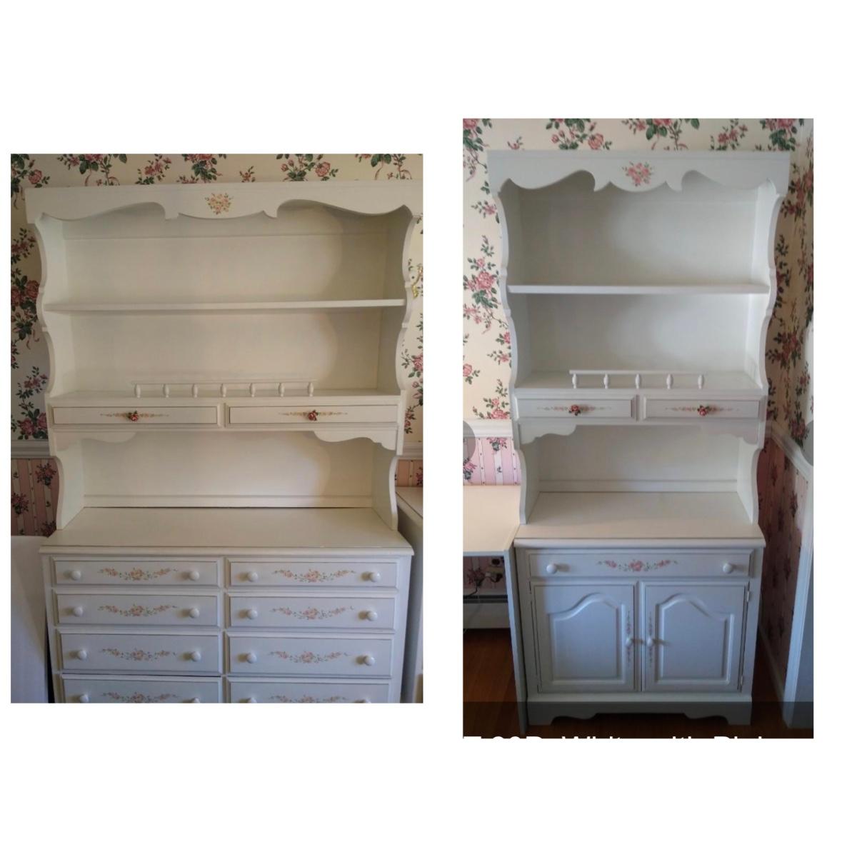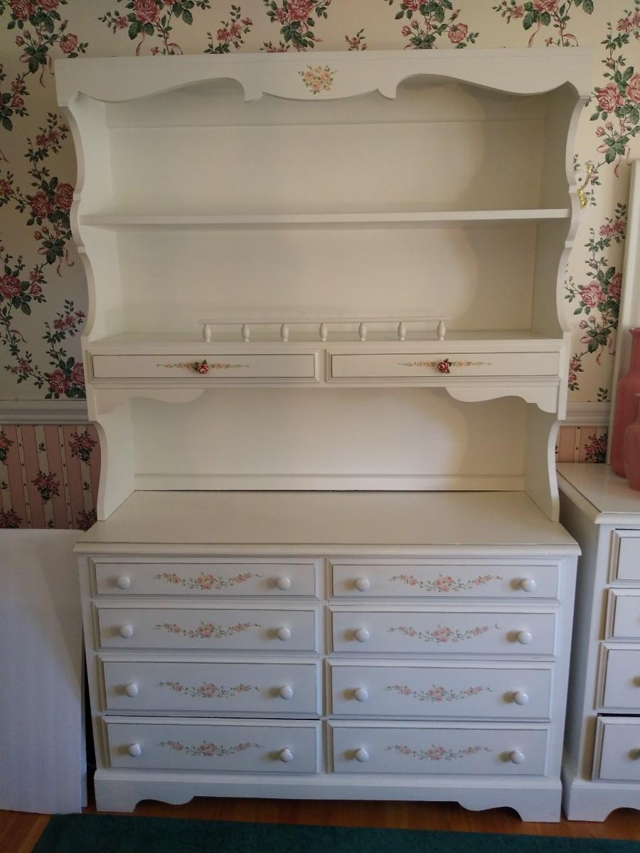 LOT 28P: White with Pink Floral Design 8 Drawer Dresser w/ Hutch and Cabinet w/ Hutch