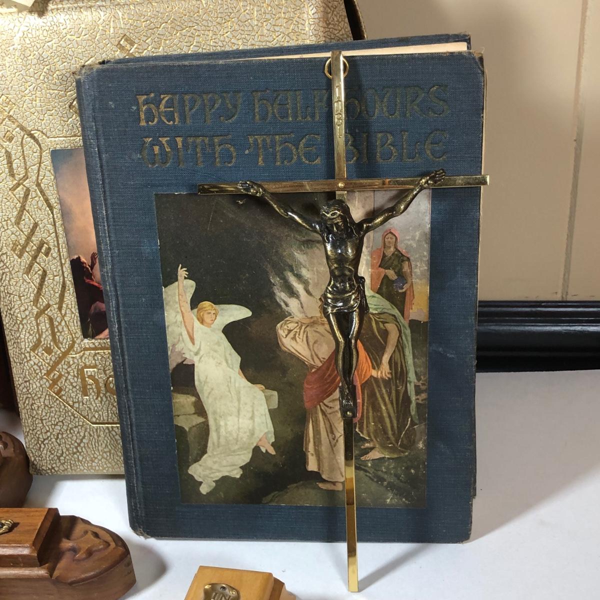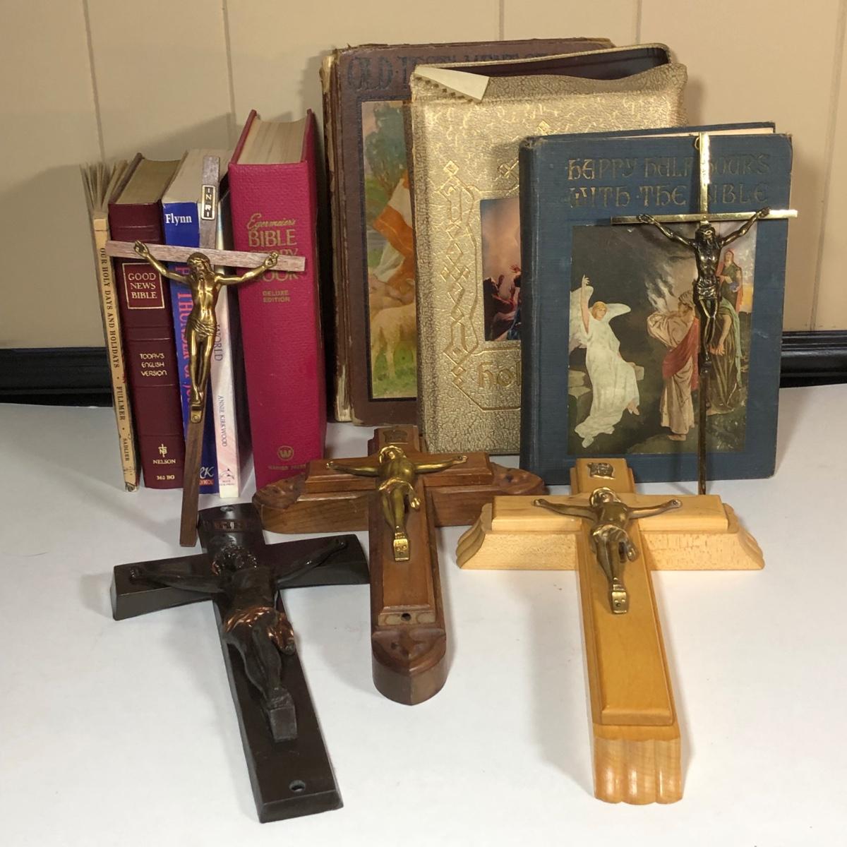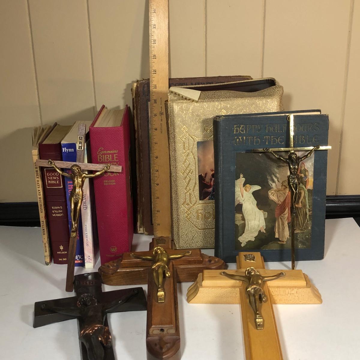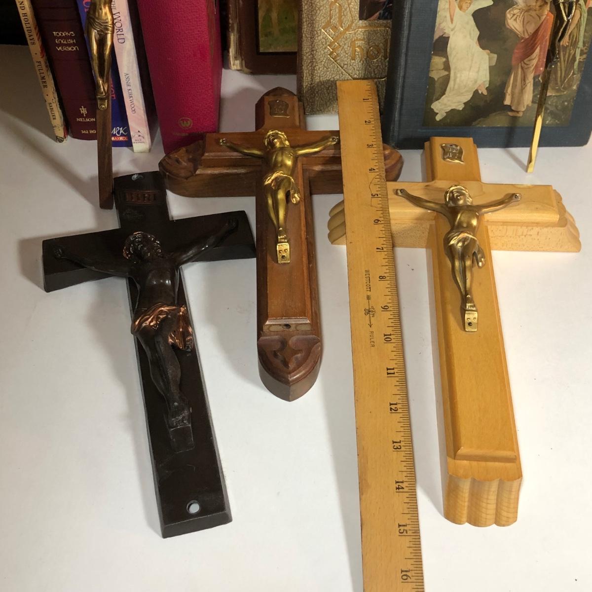 LOT 56F: Religious Collection - Wooden "Sick Call" Crucifixes w/ Hidden Compartments, Bibles & Holy Books w/ More Crucifixes