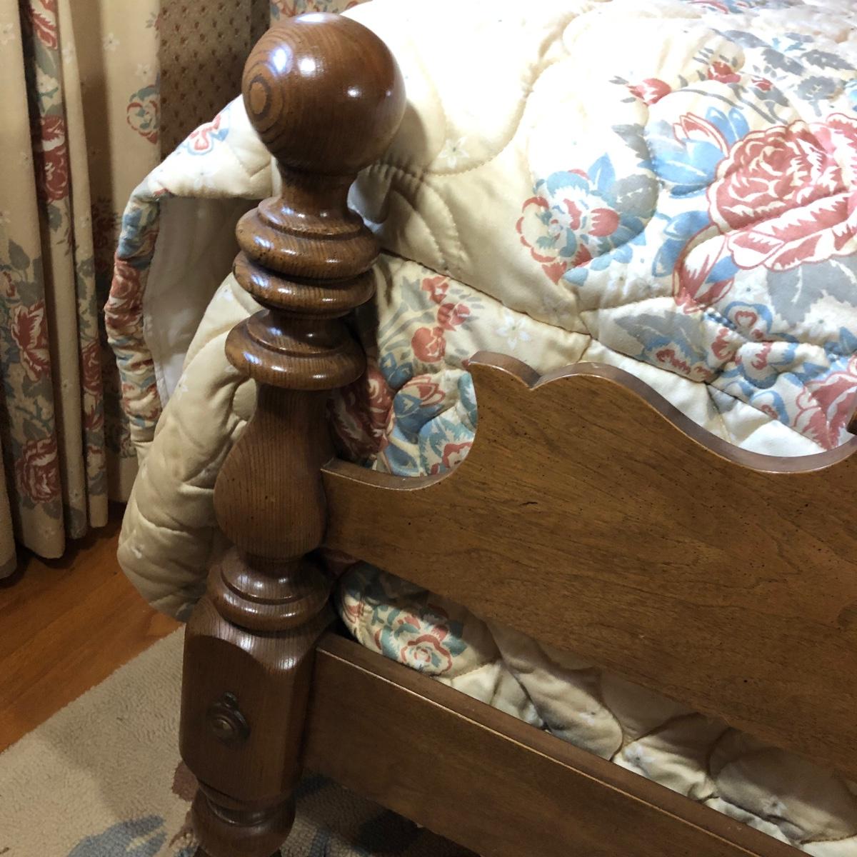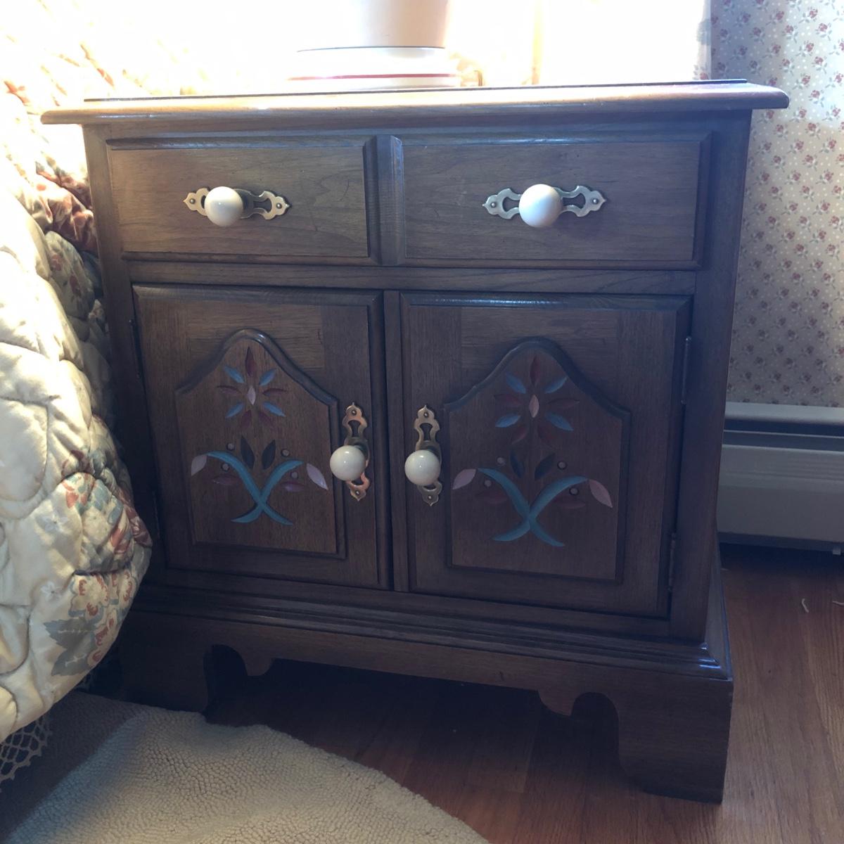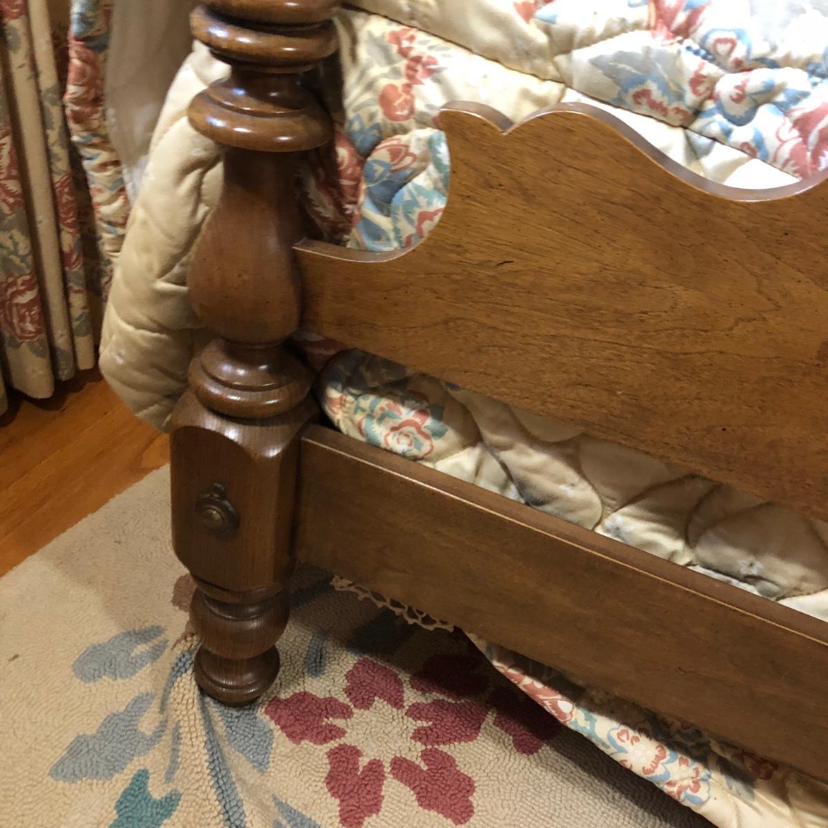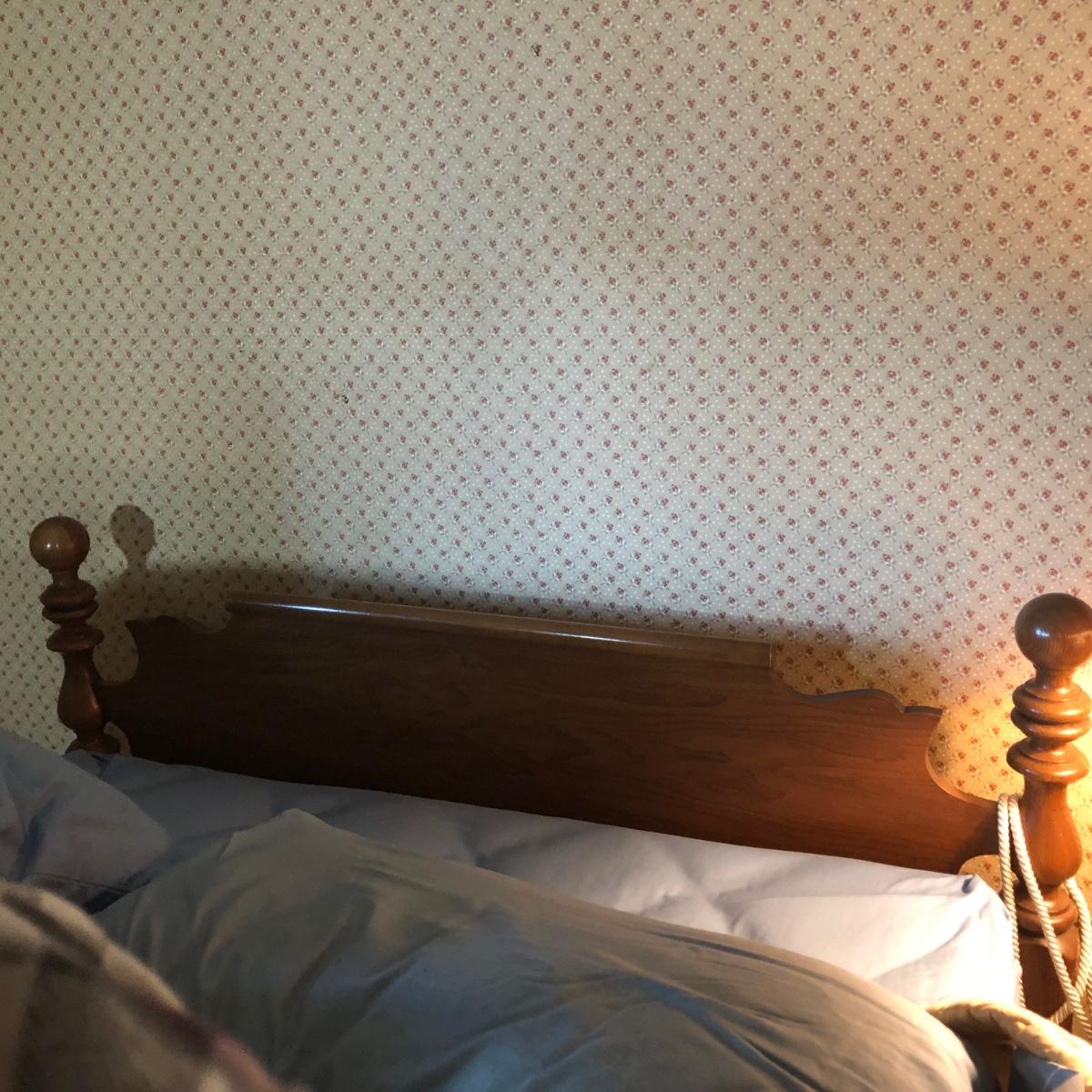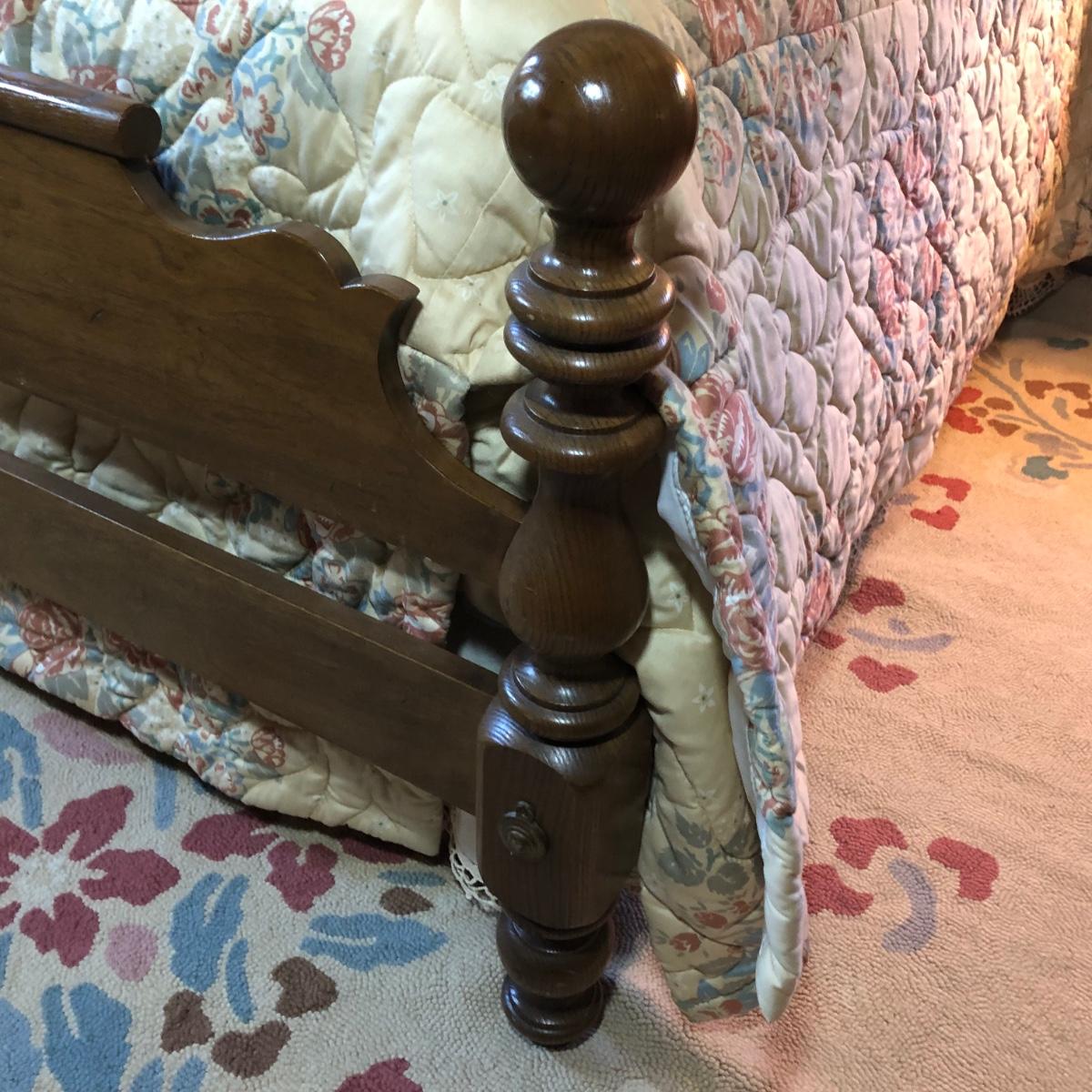 Bed measures 56W x 82D x 40H. Located upstairs in the home, must bring tools to disassemble the bed and help to move it out. Nightstand measures 24W x 16D x 25H.