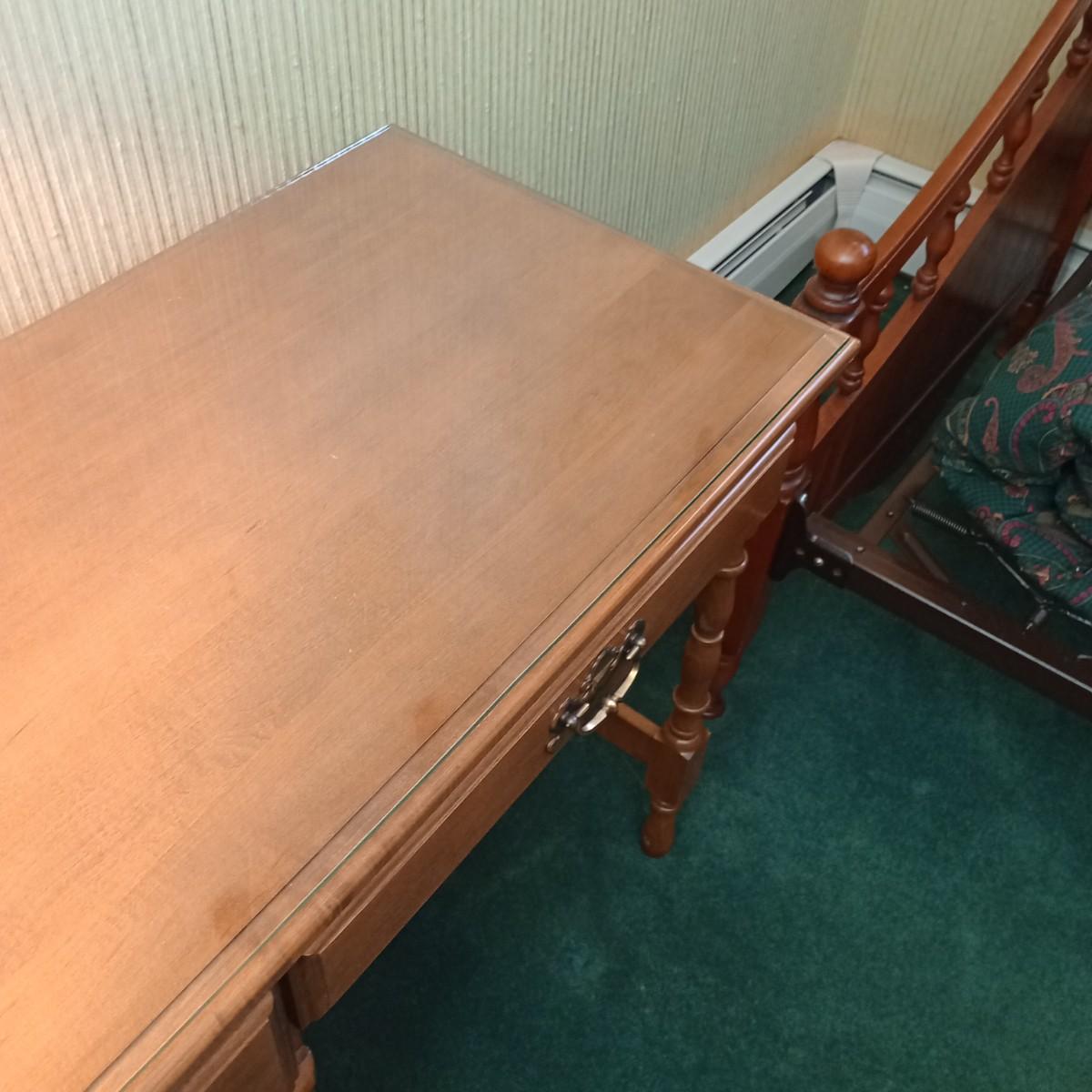 One of the wooden rods in the upper back piece of the chair is not inserted on both ends. Measurements are appr. 41"x18"x30" high for the desk and 34"x18"x41" high. Please see all pictures as they are the best representation of the items. The pictures show condition, measurements if taken, and what is included in the lot. Due to the large amount that we photograph and the time frame, we are not always able to take measurements. All items unless noted, are pre-owned and have been used. If you purchased furniture, you must bring help. We do not allow one person to carry large furniture out on their own. Bring help, tools and a truck for the safety of our client’s homes, and your personal safety. Any damages that result to the property including walls, and floors due to moving of the furniture will be charged to the buyer. Company policy. Thank you.