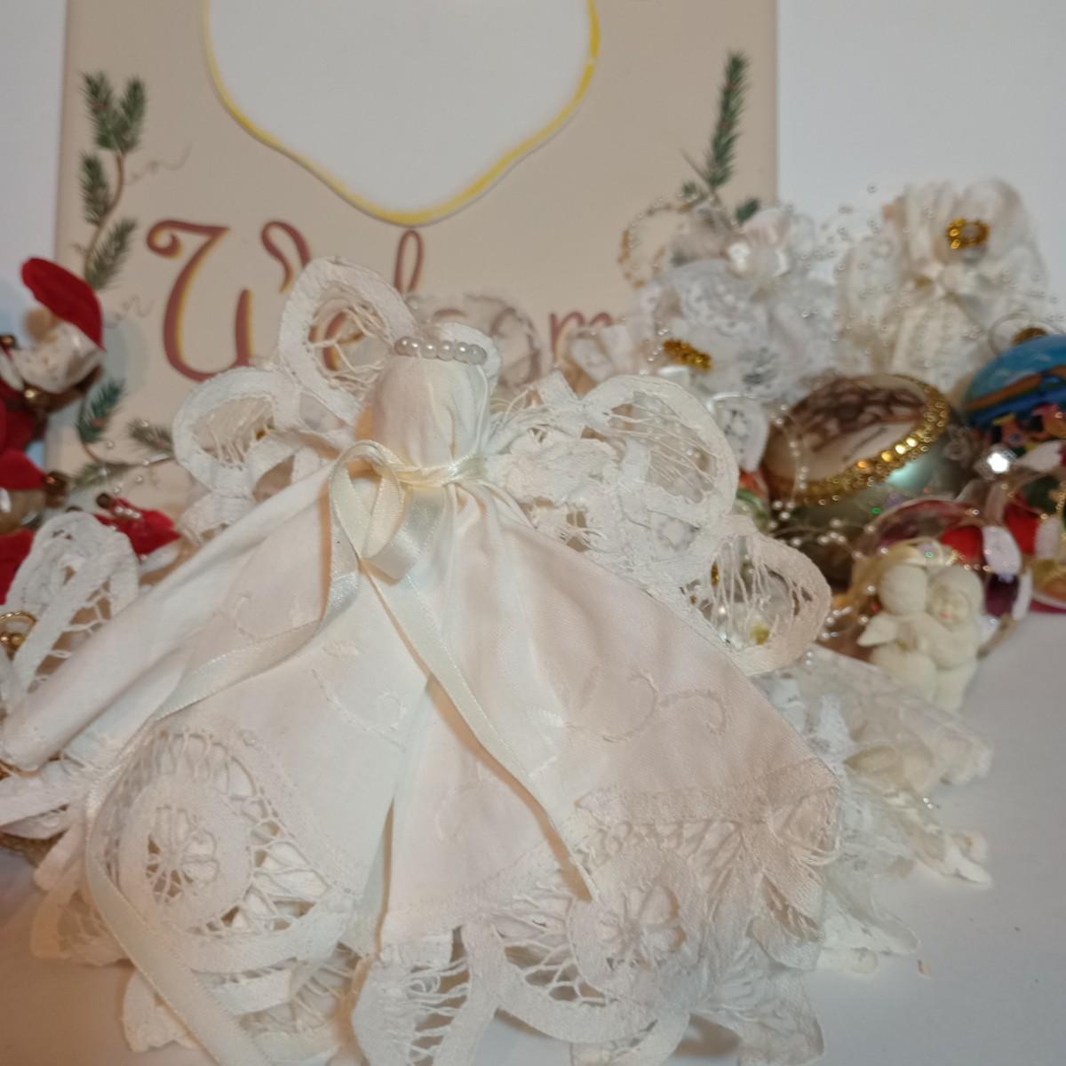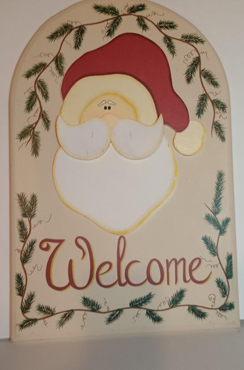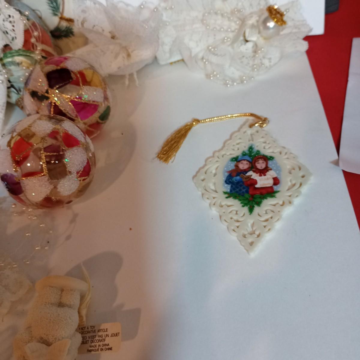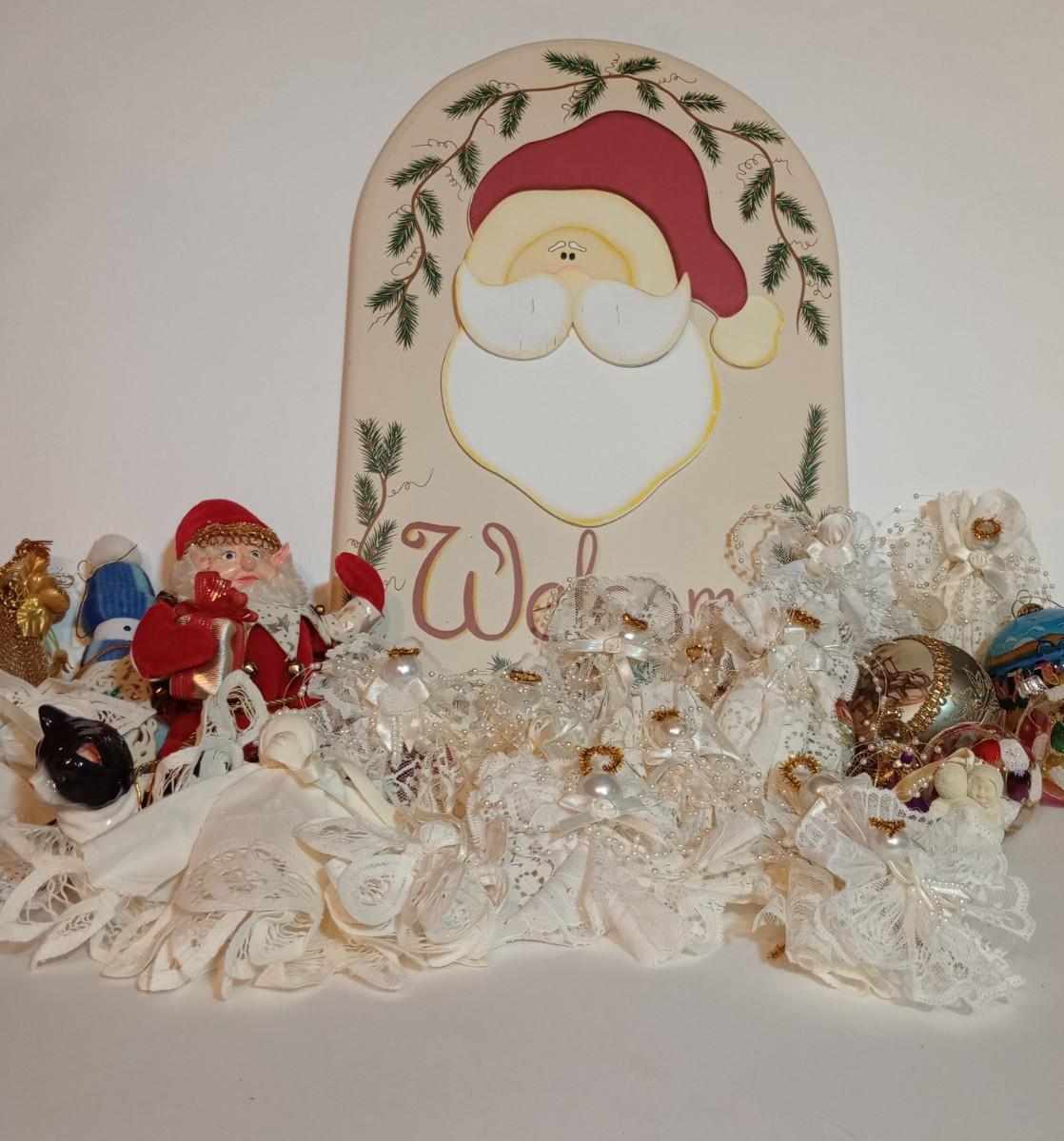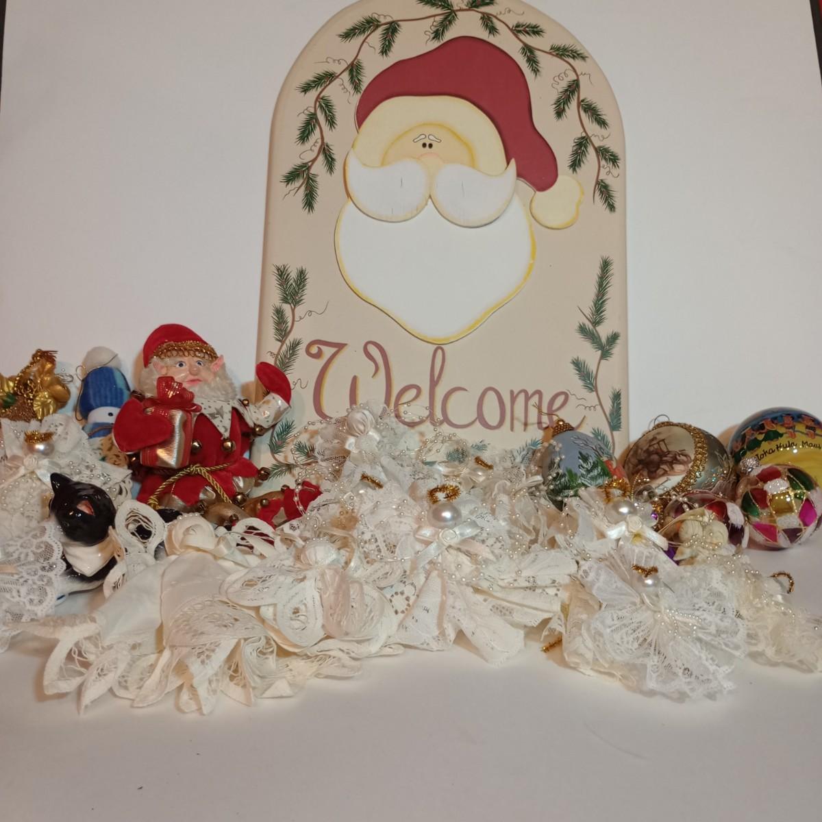 LOT 115B: Santa Welcome sign, Vintage Unique Ornaments, Posable Elf and Handmade Angel Ornaments