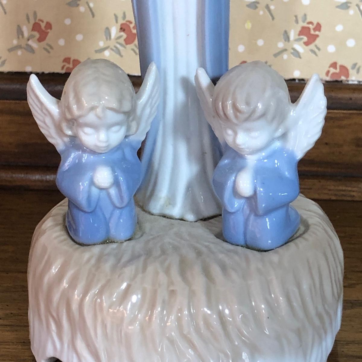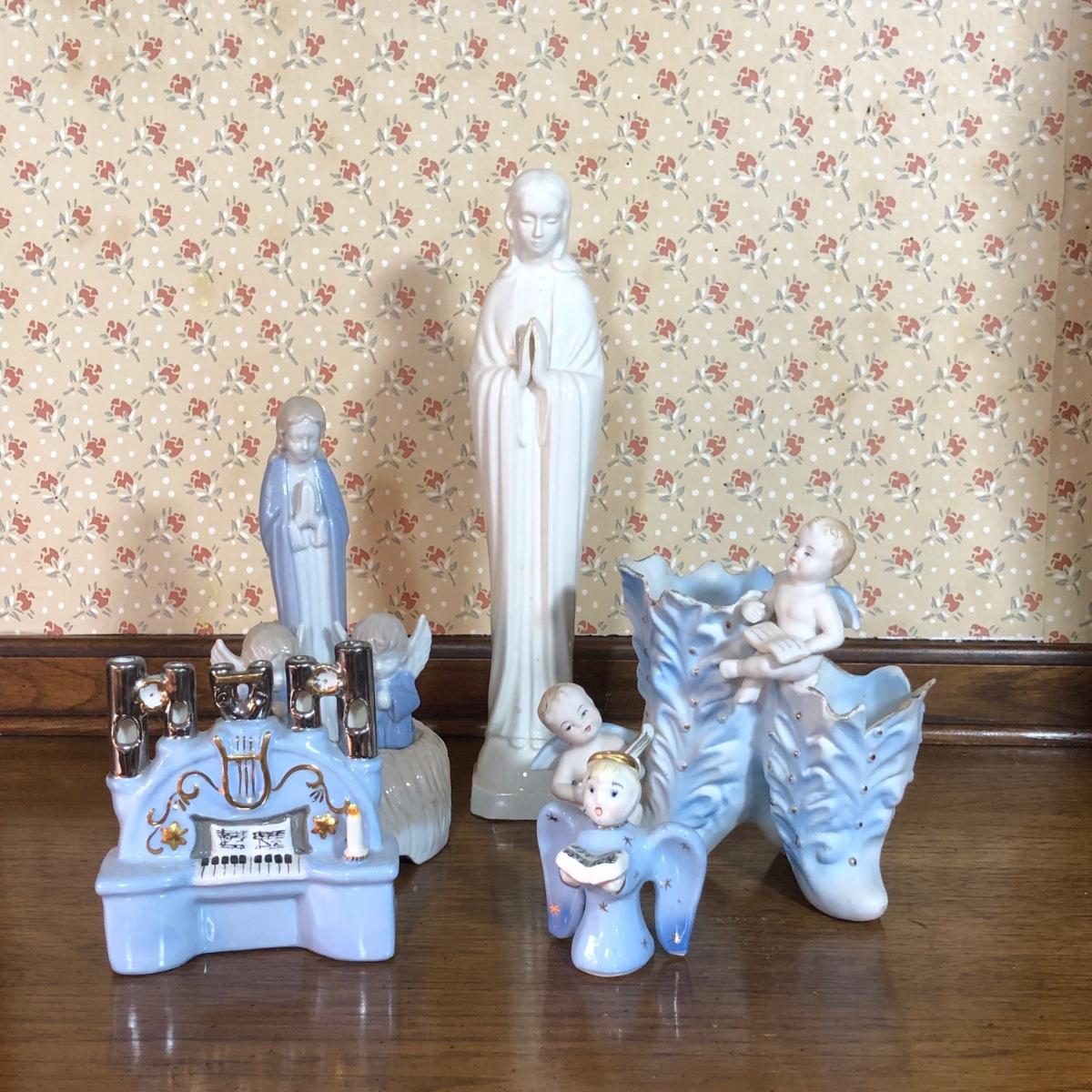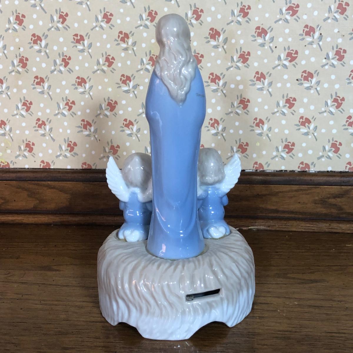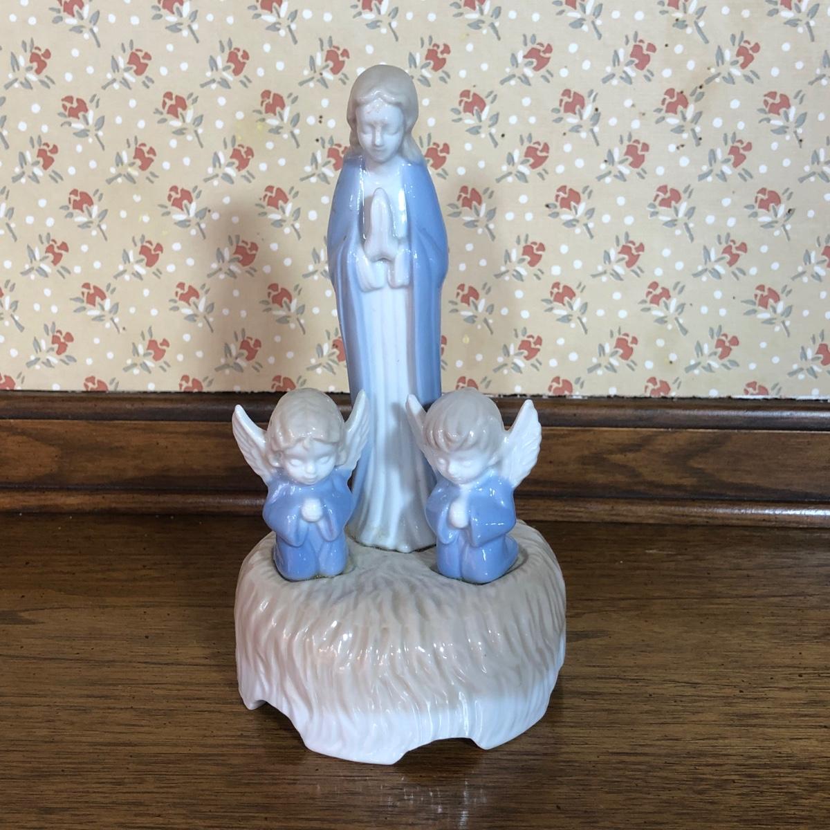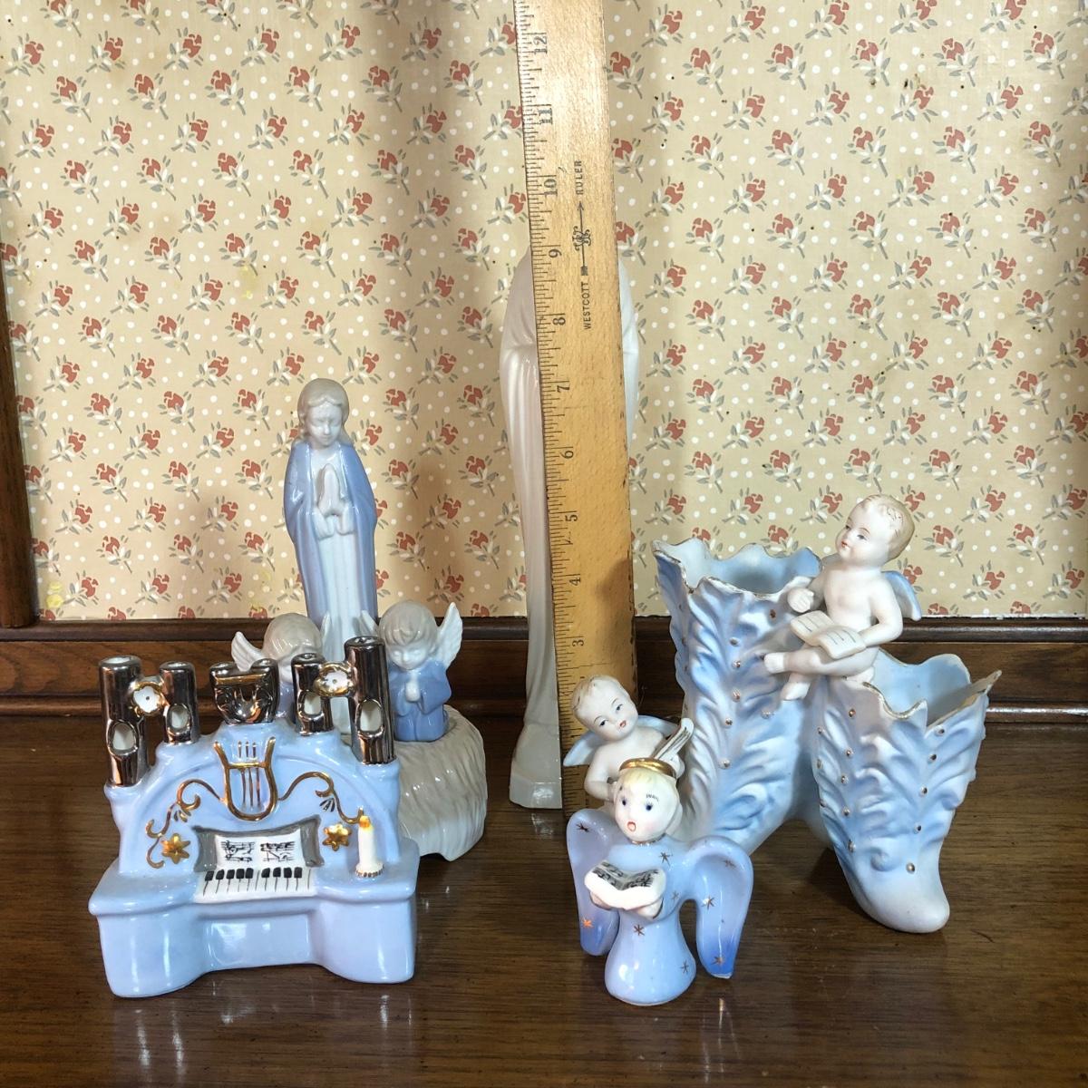 LOT 153C: Porcelain Figures - Praying Madonna, Vintage Mary w/Angels Music Box, Cherub Vase, Piano & Choir Angel