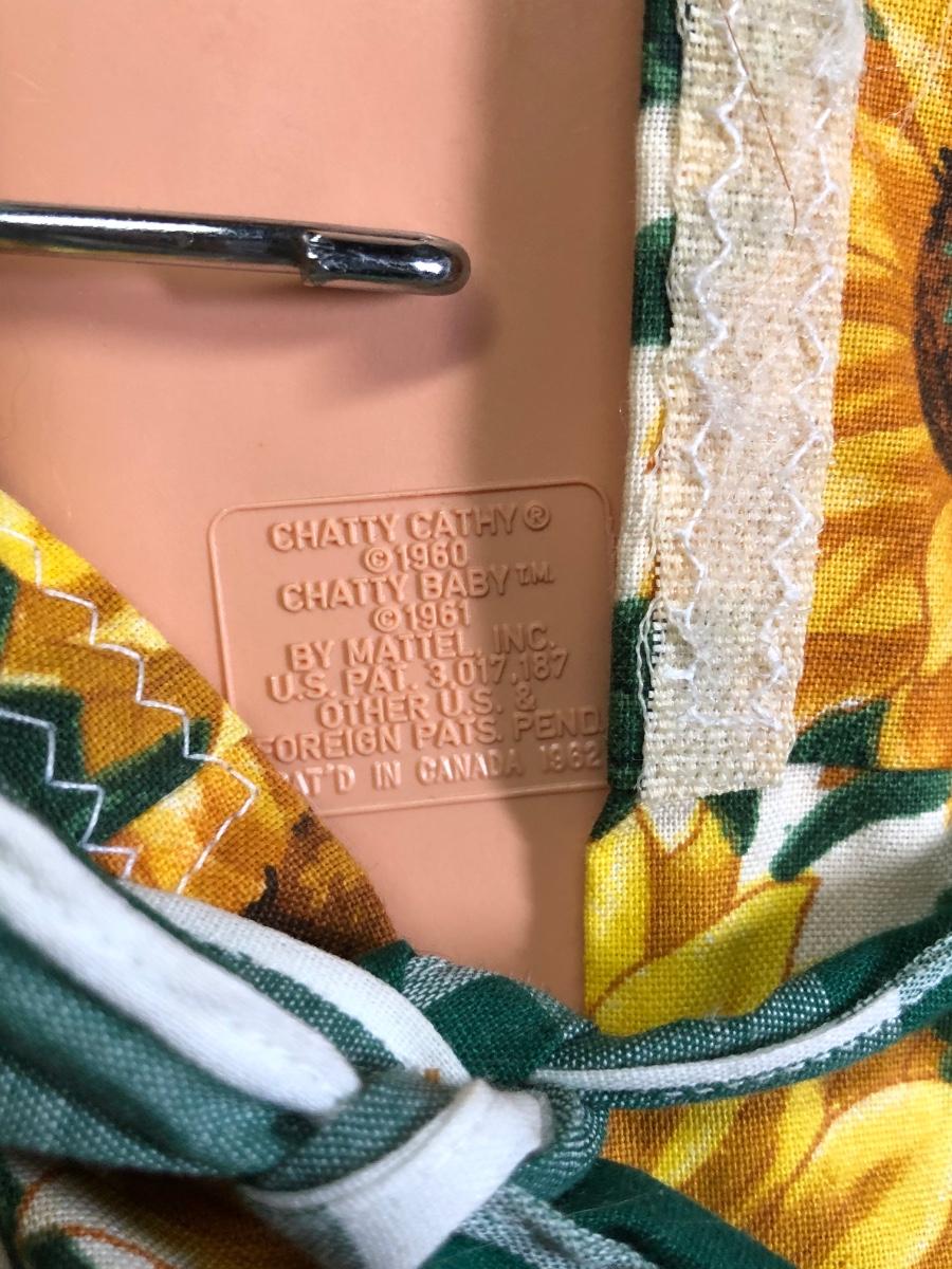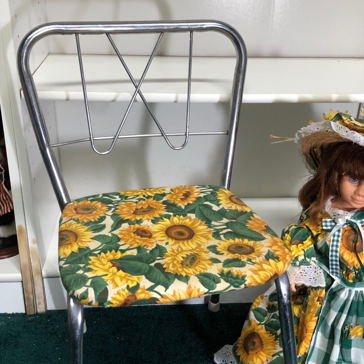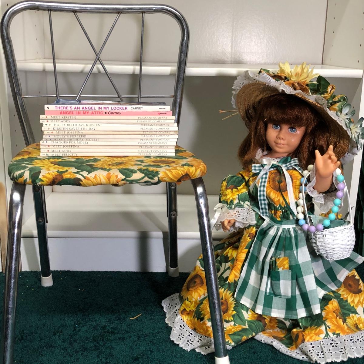 LOT 184B: Vintage Mattel Chatty Cathy Chatty Baby in Sunflower Outfit w/ Child Sized Sunflower Chair & American Girl Doll Books