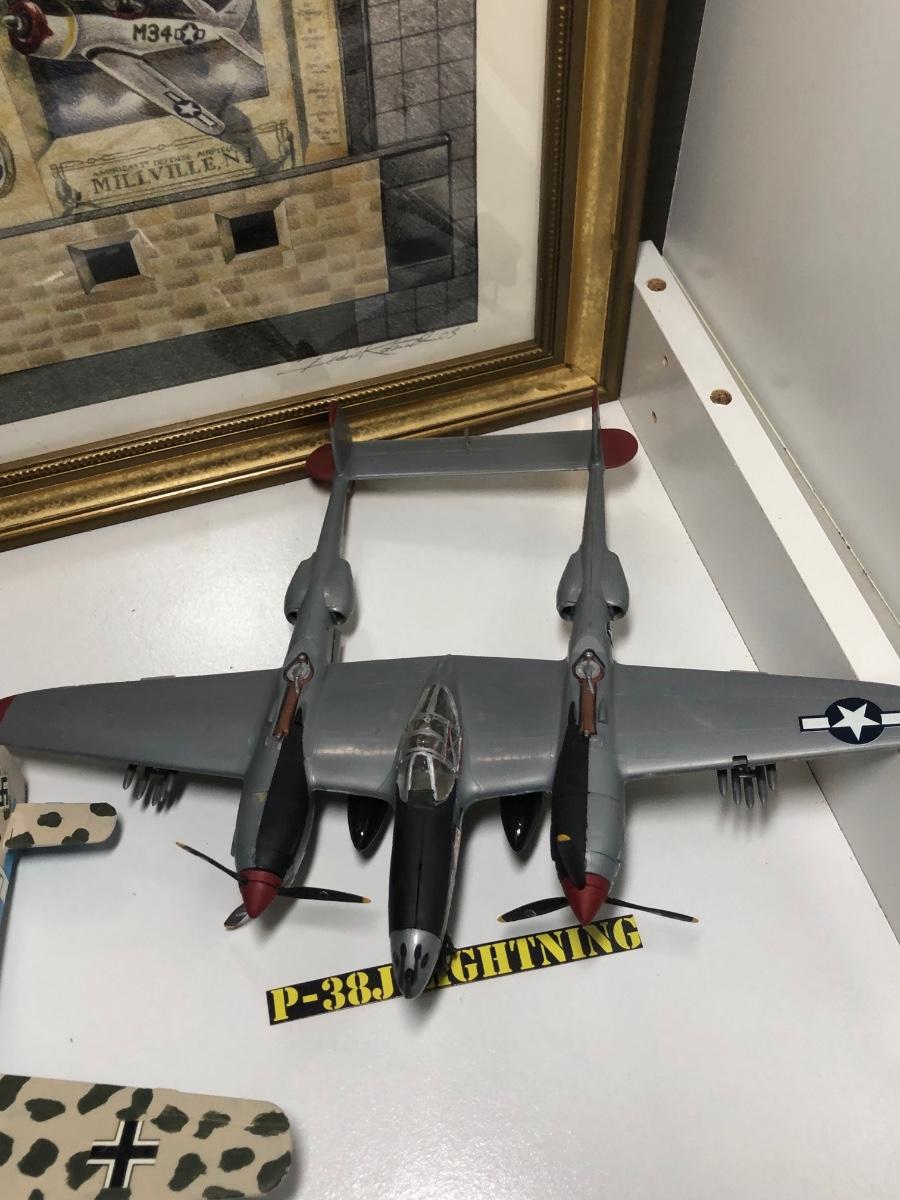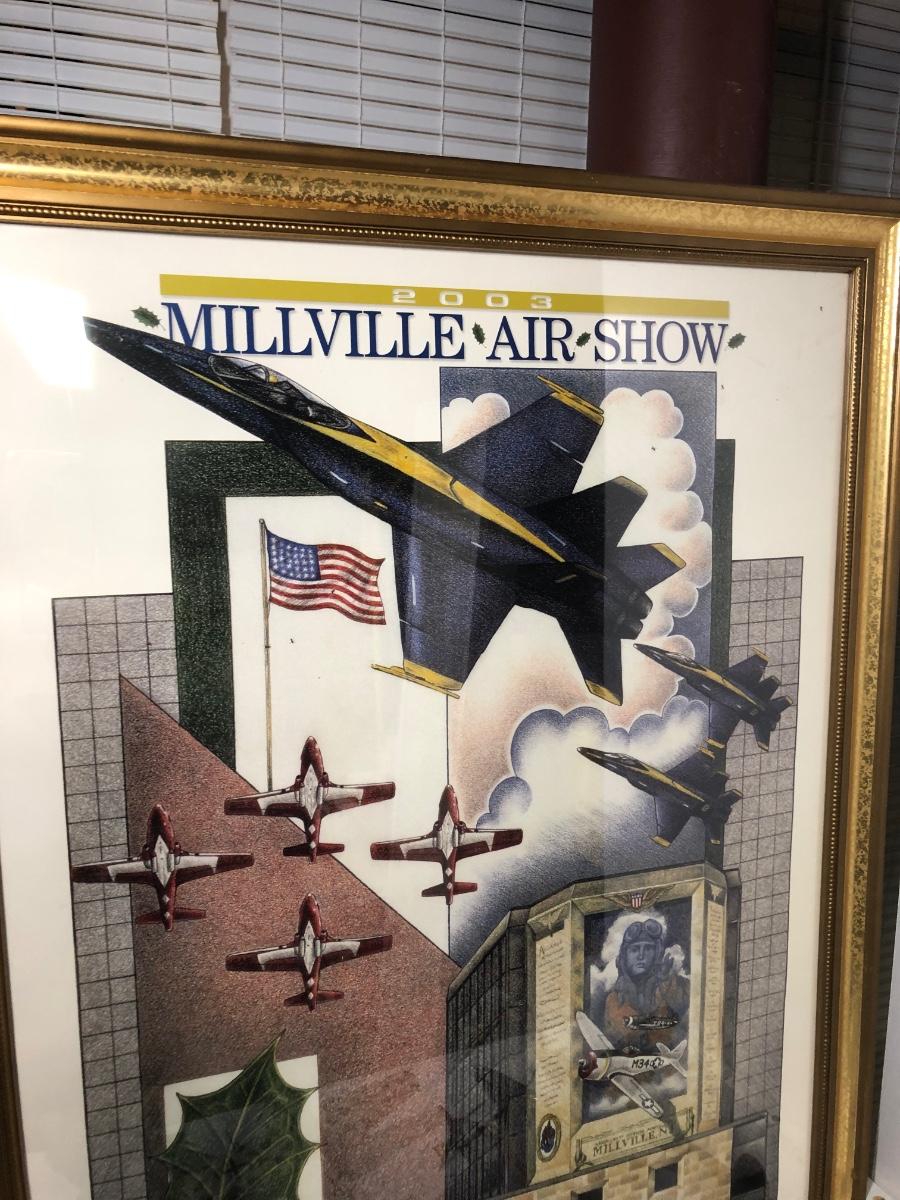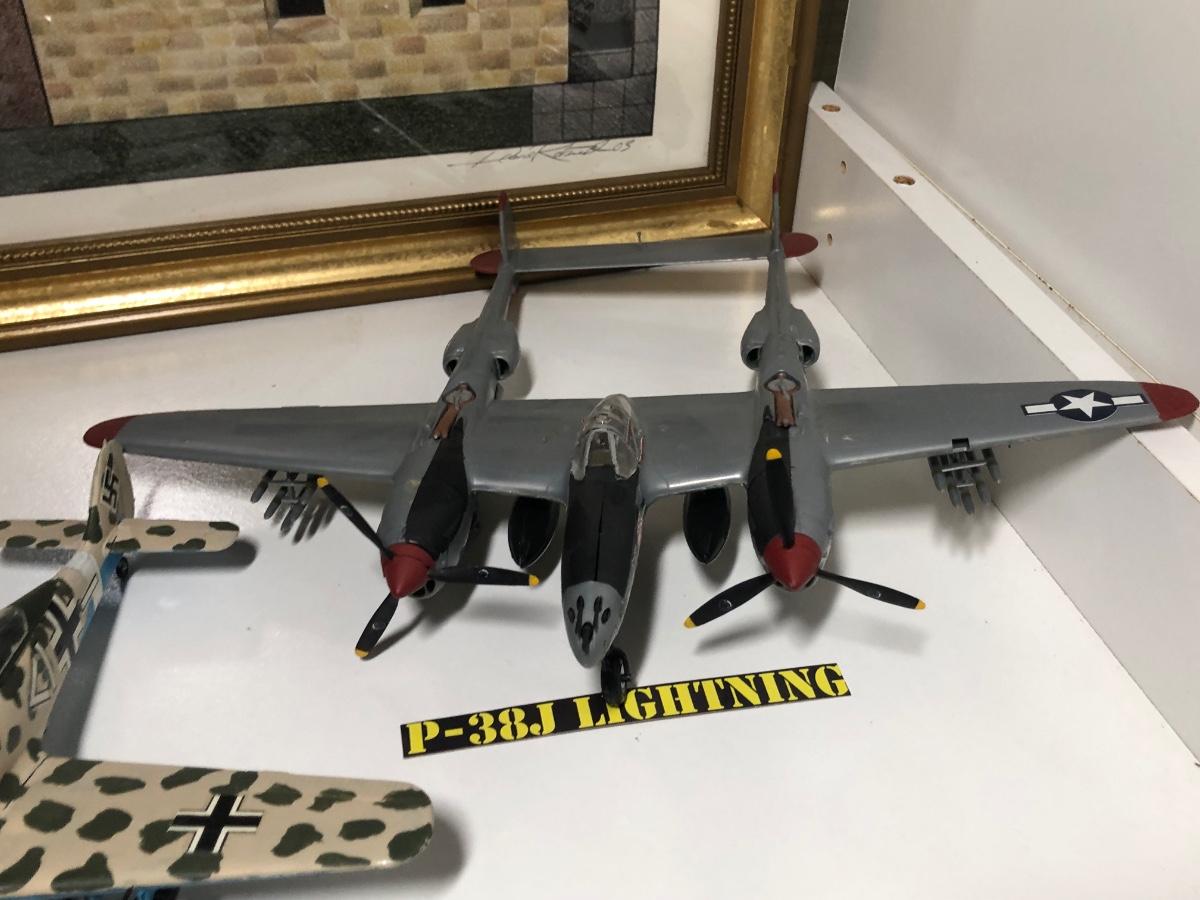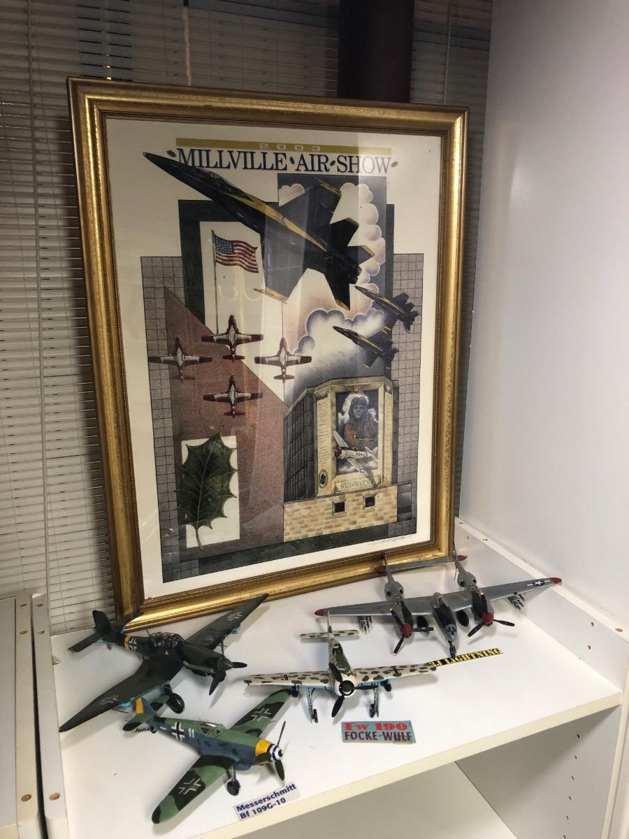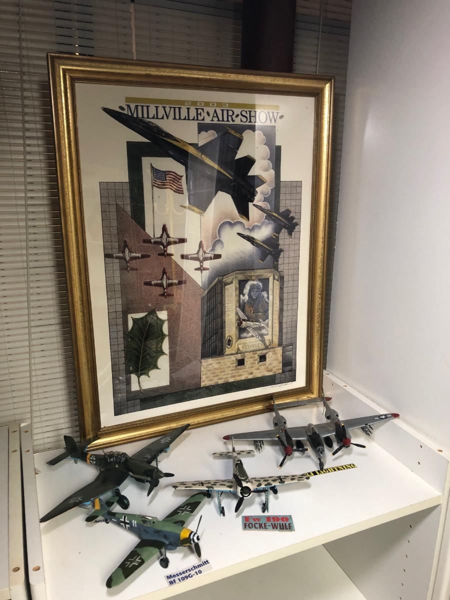 LOT 202B: 2003 Millville Airshow Framed Poster & Model Planes - Messerschmitt Bf 109G-010, Ju 87 D Stuka, Fw 190 Focke-Wulf & P-38J Lightning