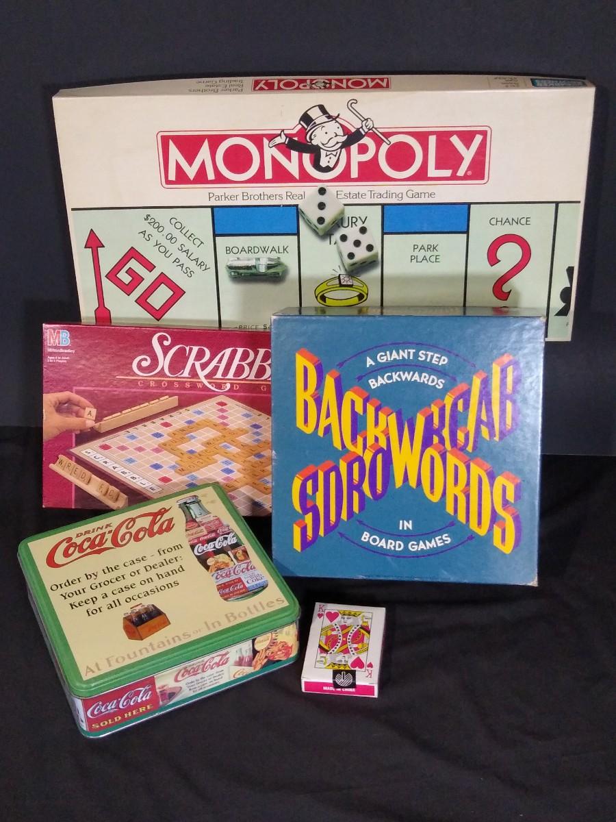 LOT 226B: Vintage Board Games - 1980's Monopoloy and Scrabble, Backwards & More