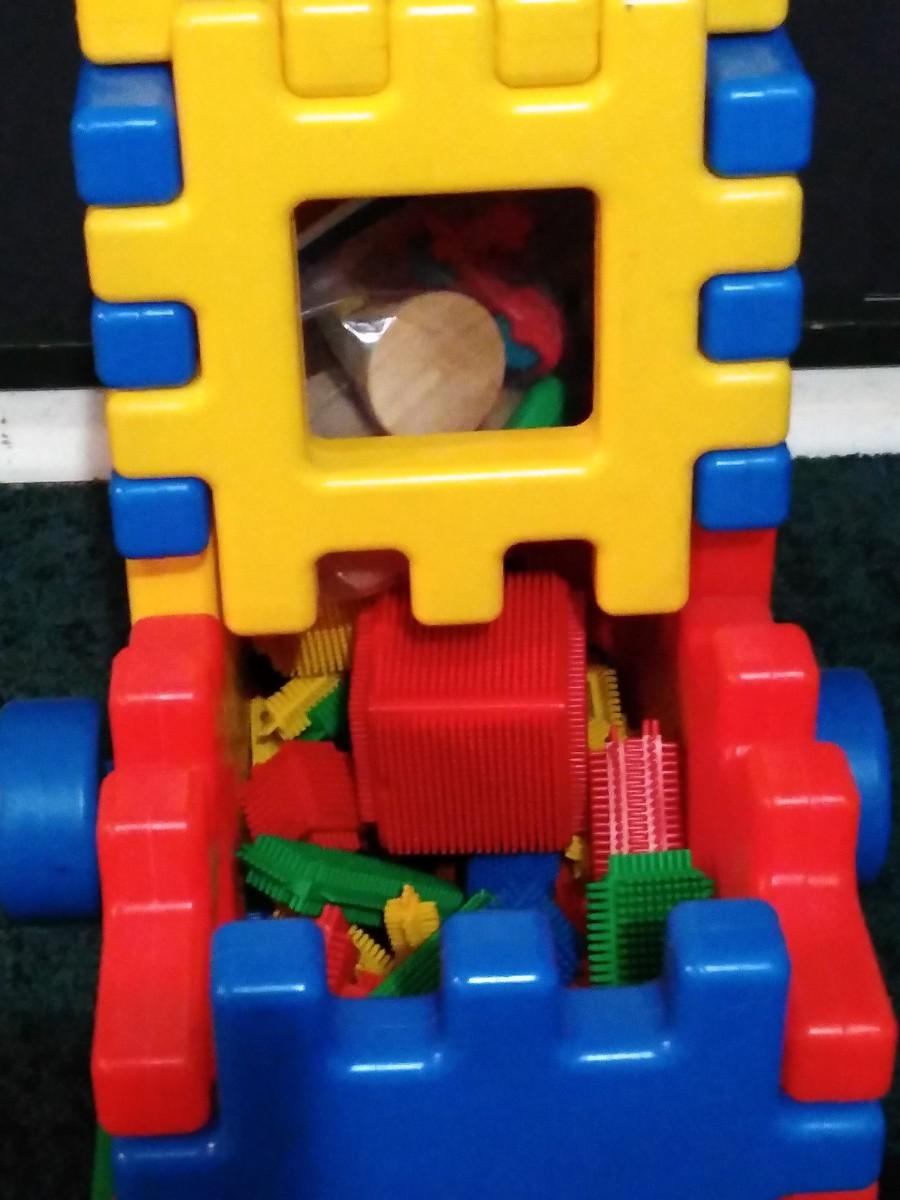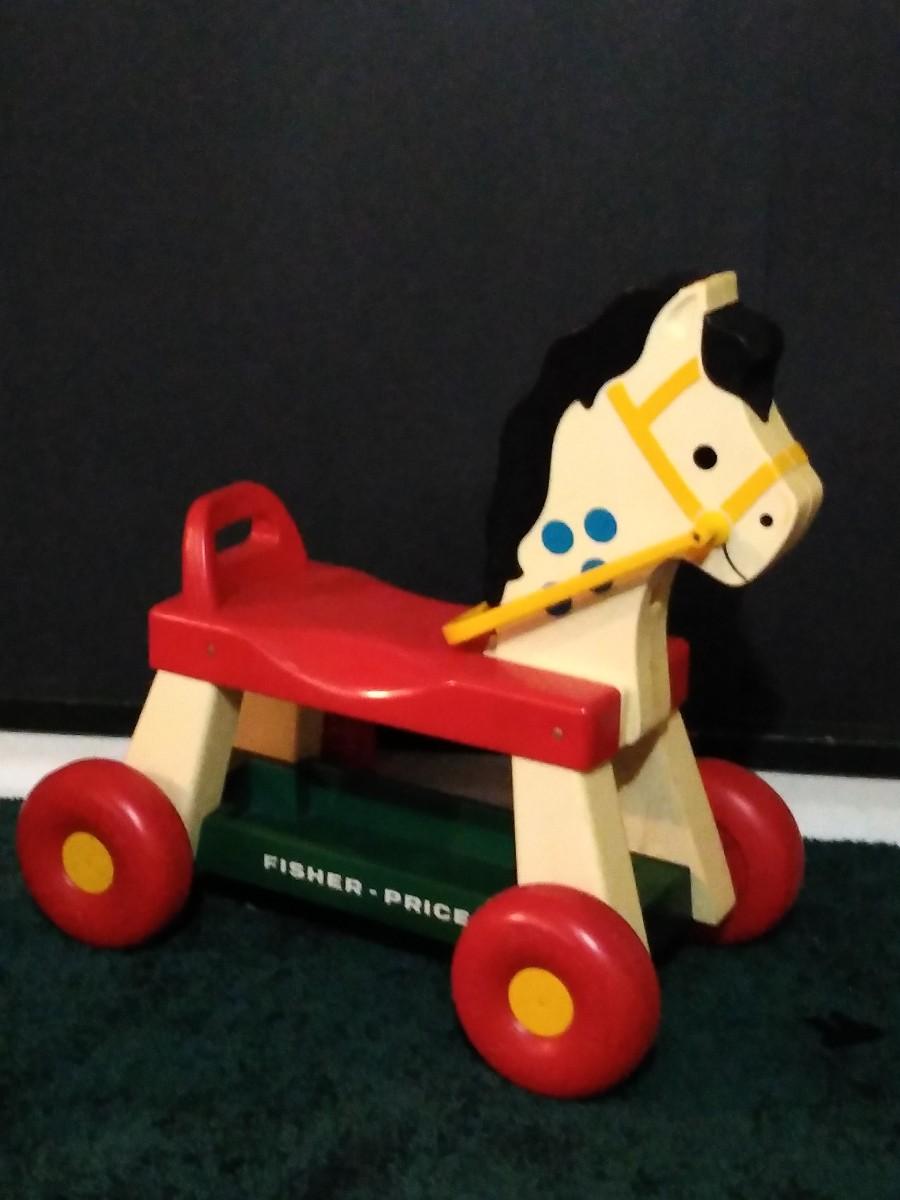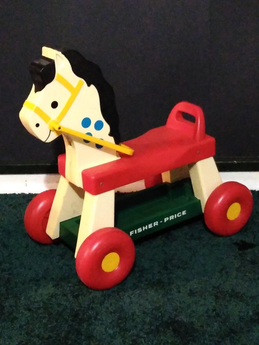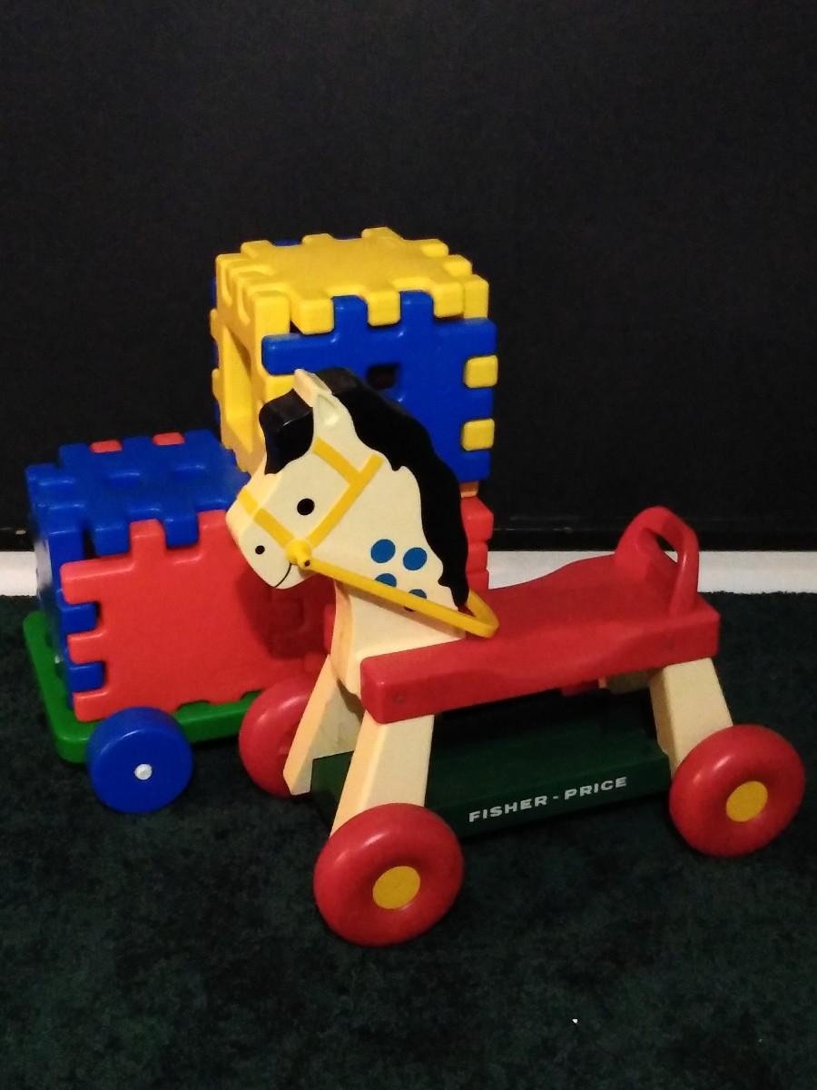 LOT 230B: Vintage Fisher Price Riding Horse and Little Tike Waffle Block Car w/ Assorted Bristle Blocks & More