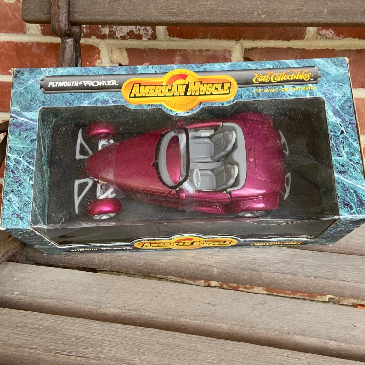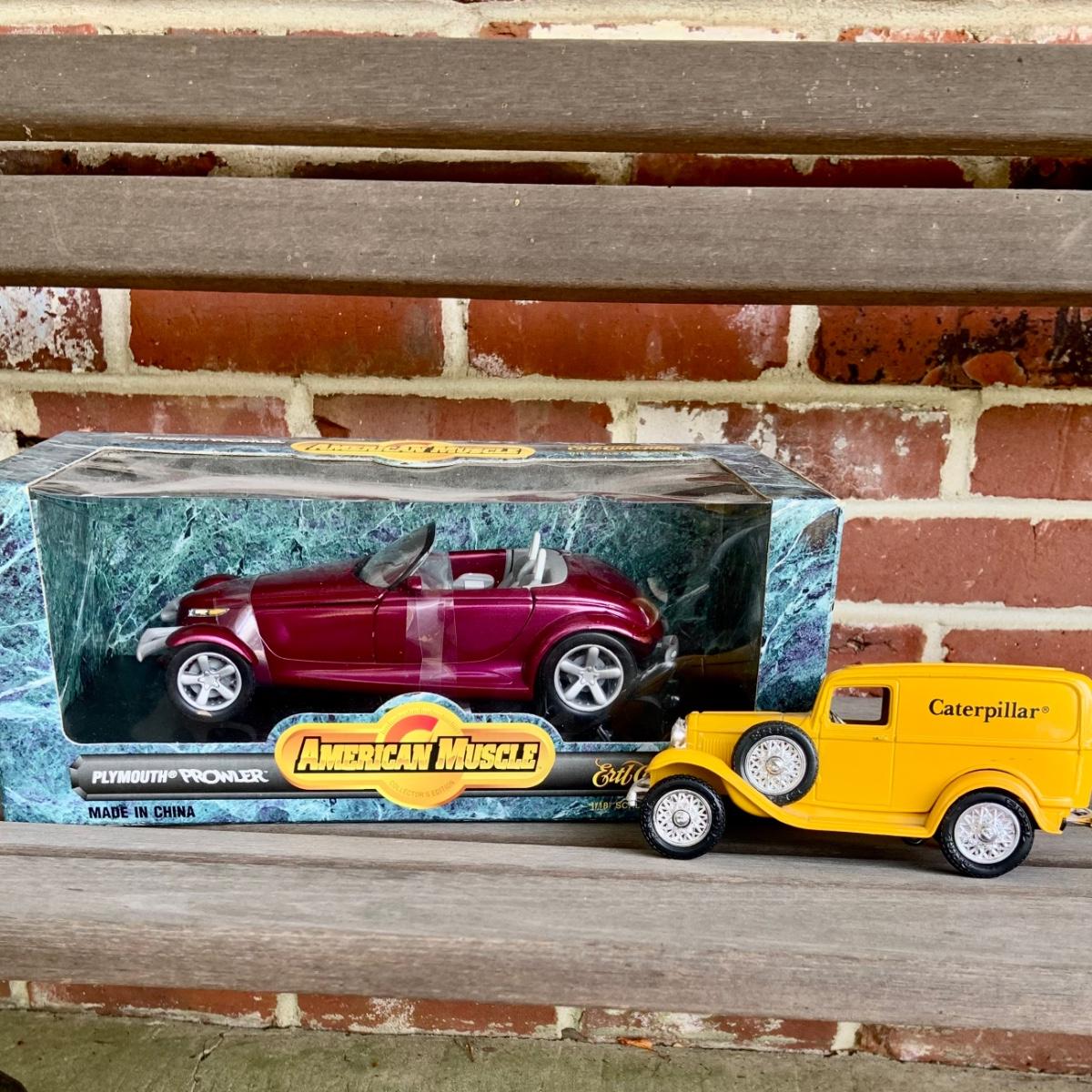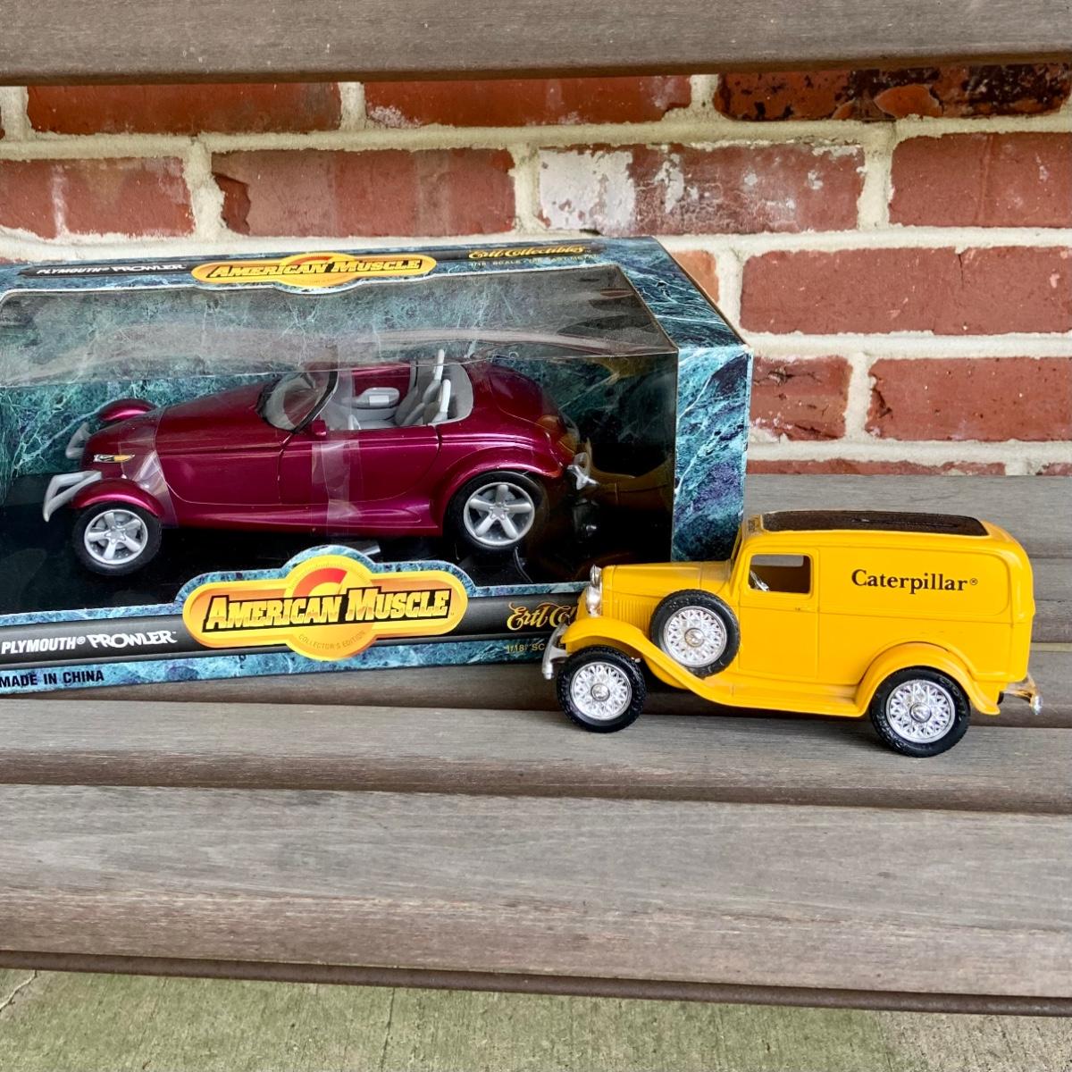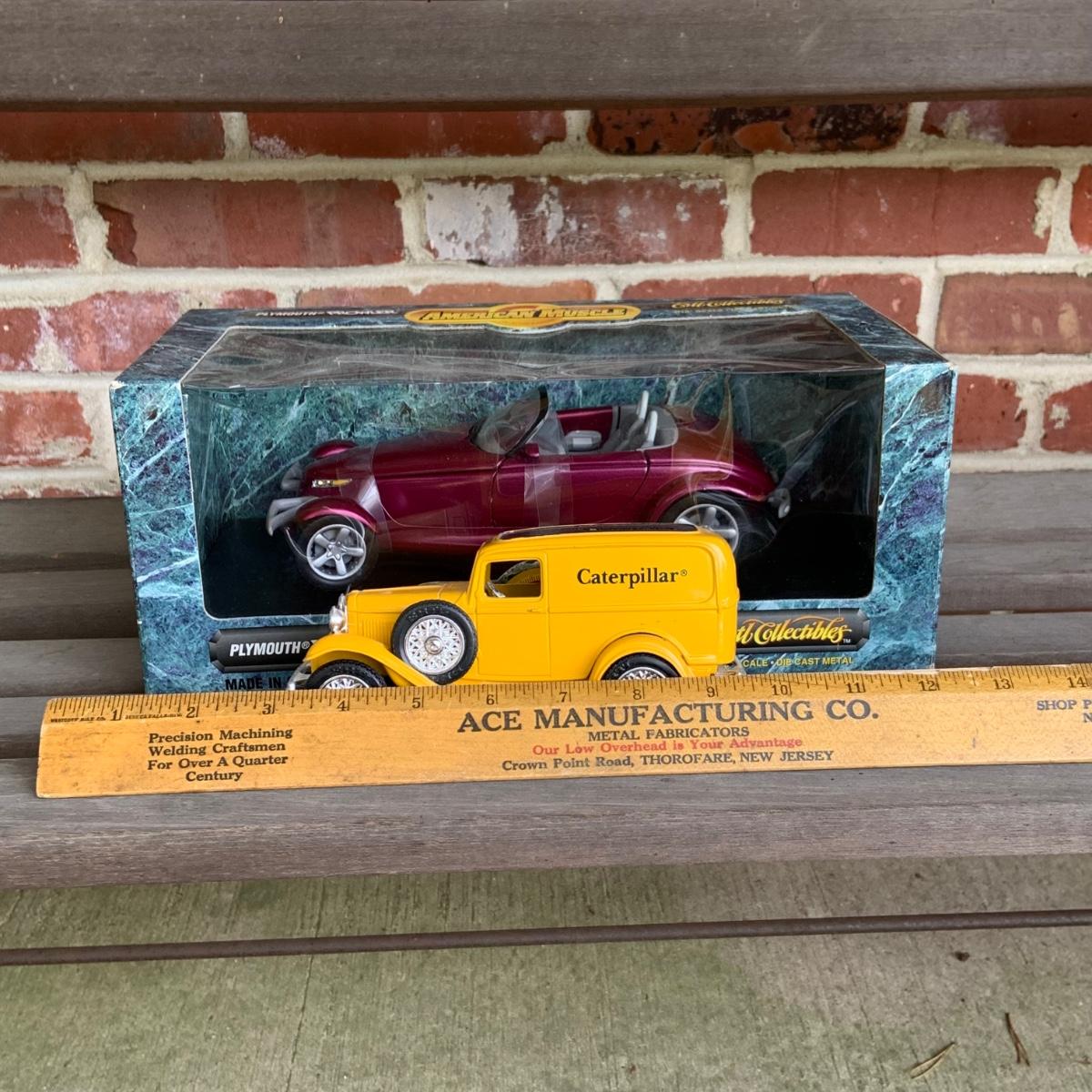 LOT:39G: Ertl Collectable Die Cast Metal Cars - Plymouth Prowler and Replica 1932 Ford Delivery Van Caterpiller