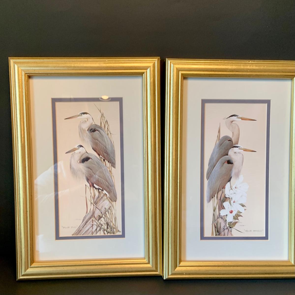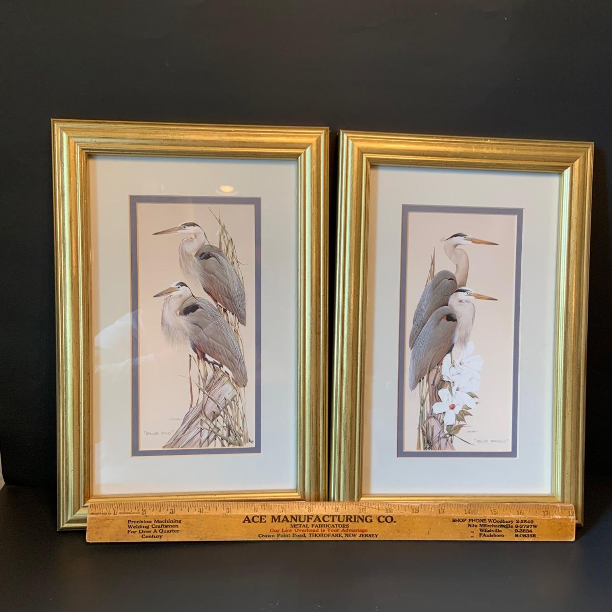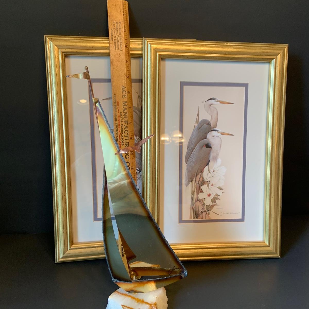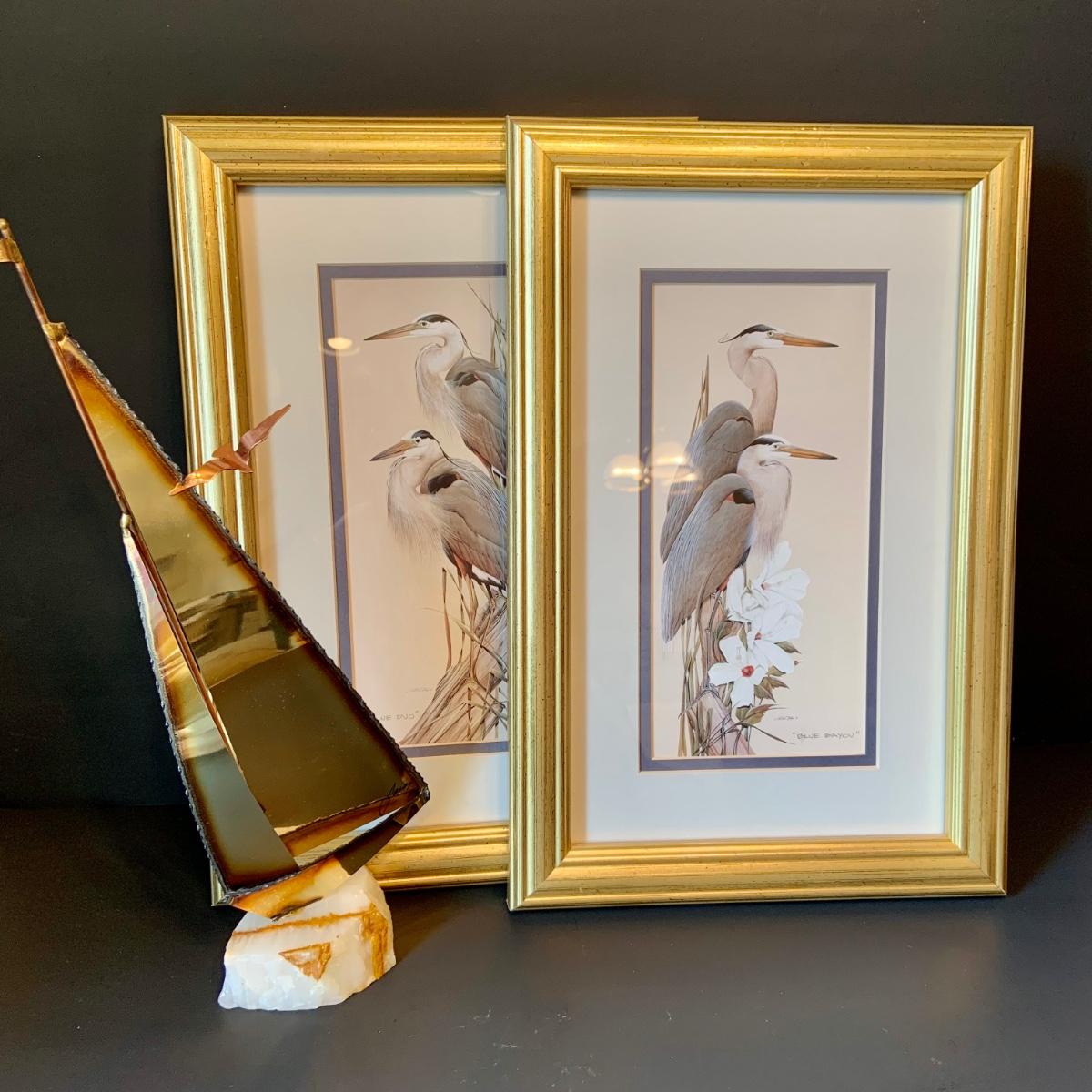 LOT:48G: Framed Art Lamay Herons - Blue Bayou and Blue Duo with Signed Metal Sailboat on Marble Base