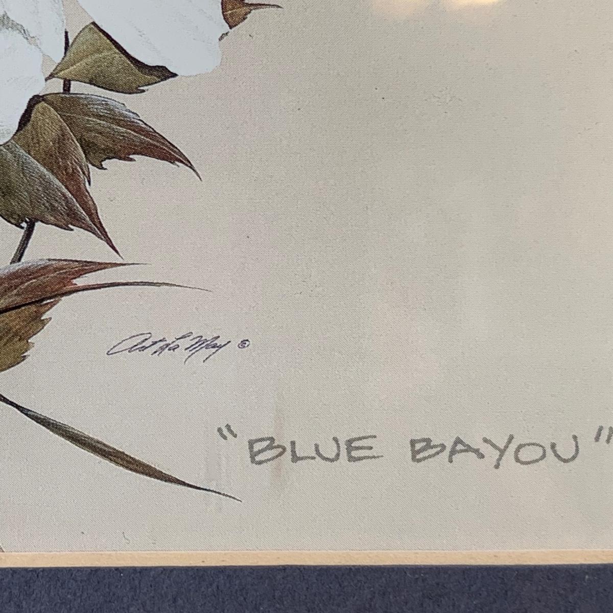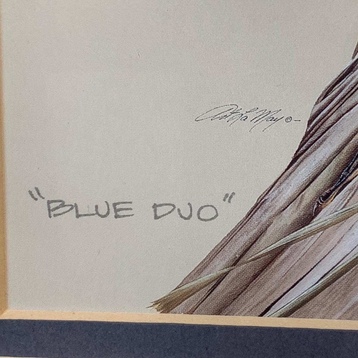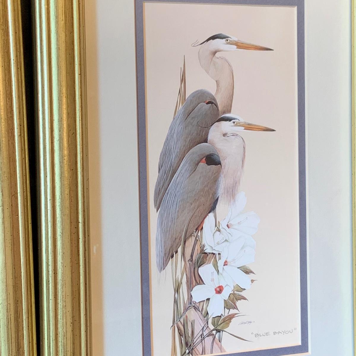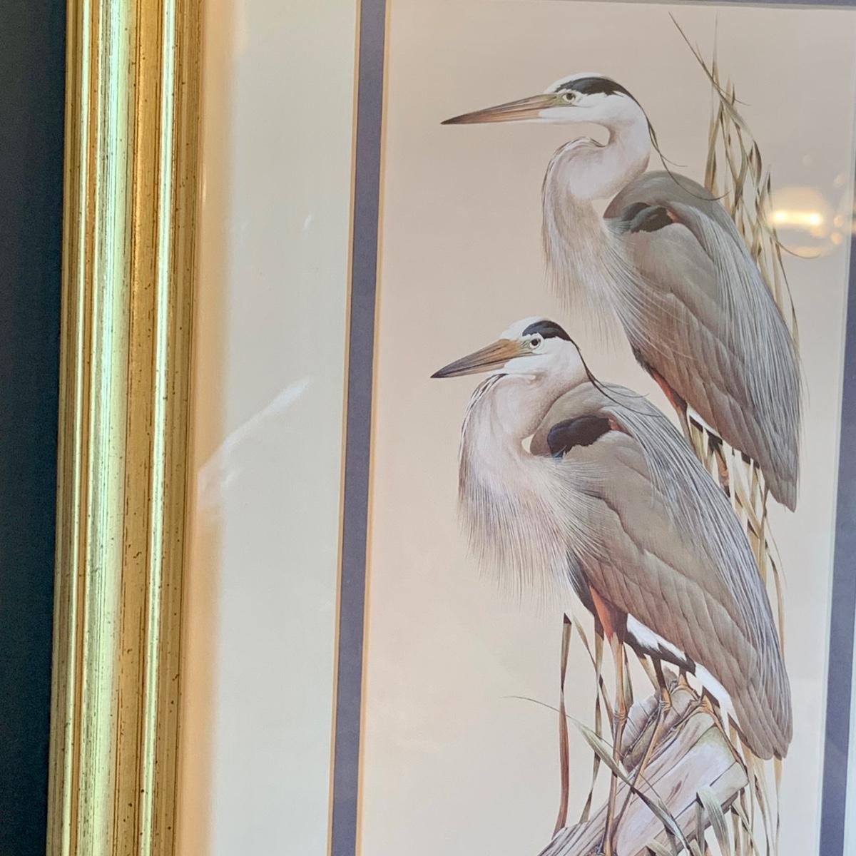 LOT:48G: Framed Art Lamay Herons - Blue Bayou and Blue Duo with Signed Metal Sailboat on Marble Base