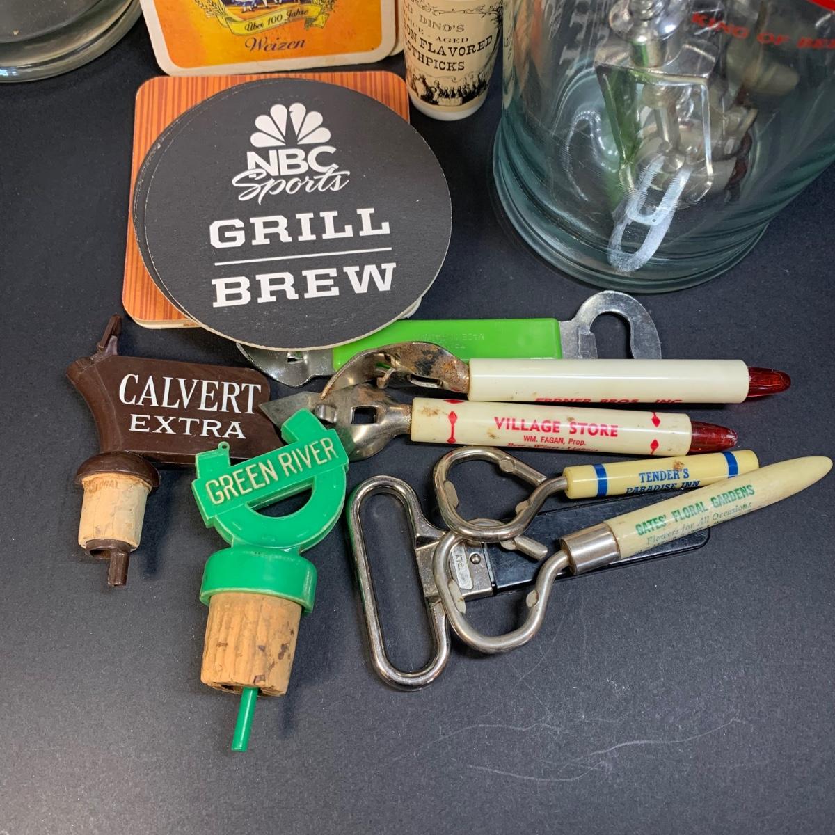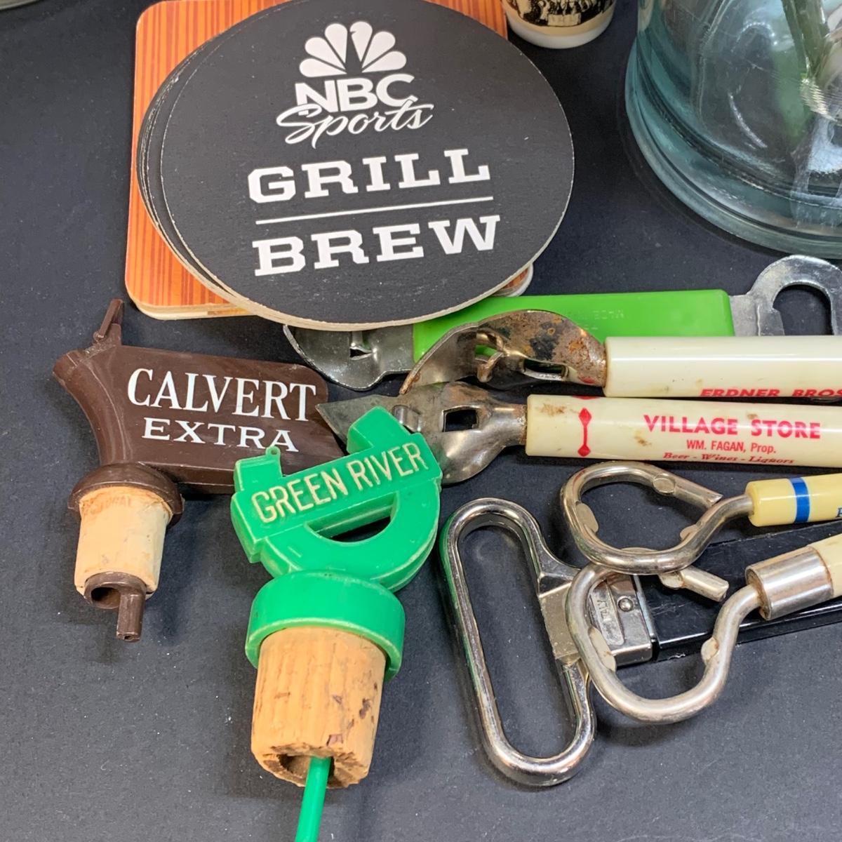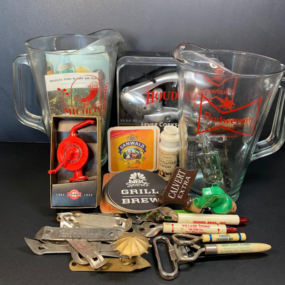 LOT 56R: Barware: Budweiser & Michelob Glass Pitchers, Bottle Openers, Houdini Lever Corkscrew, Pour Spouts & More