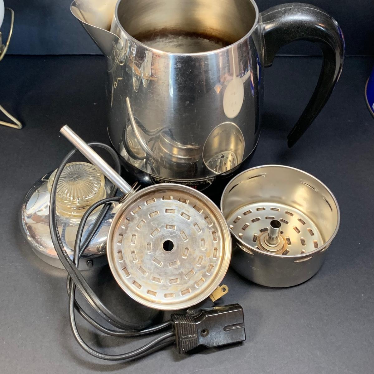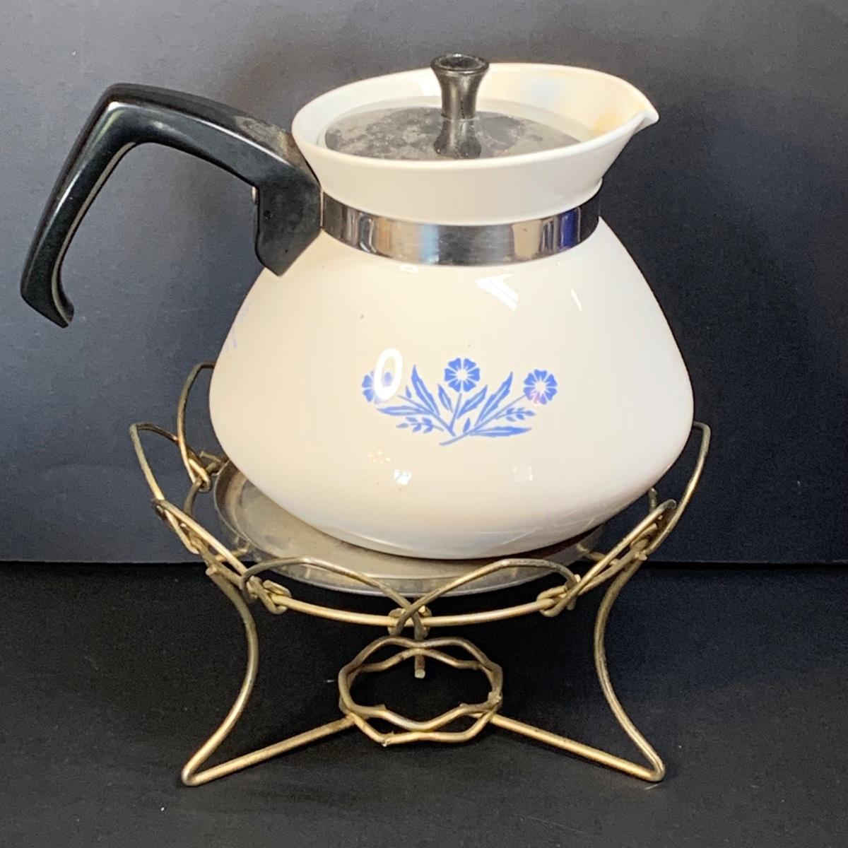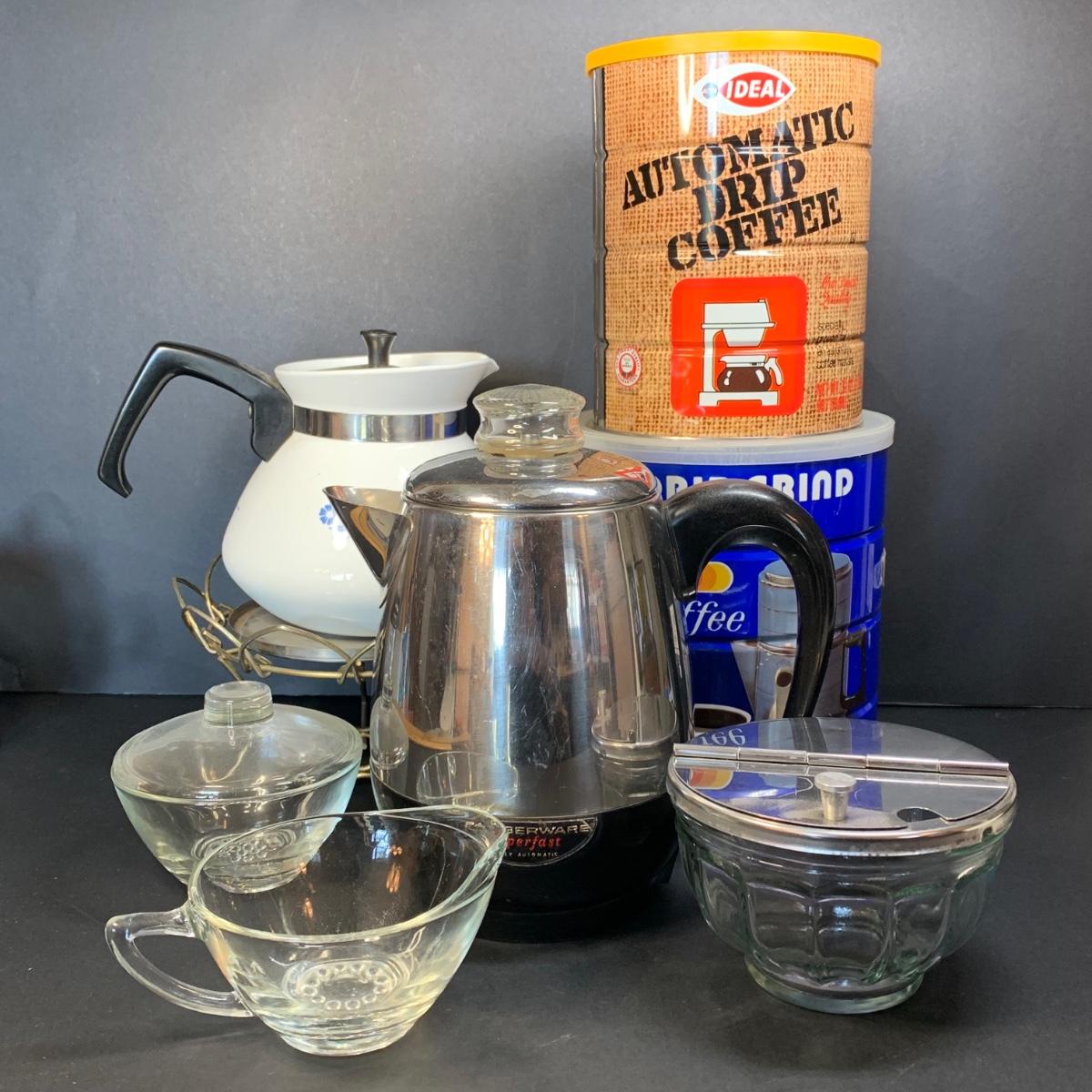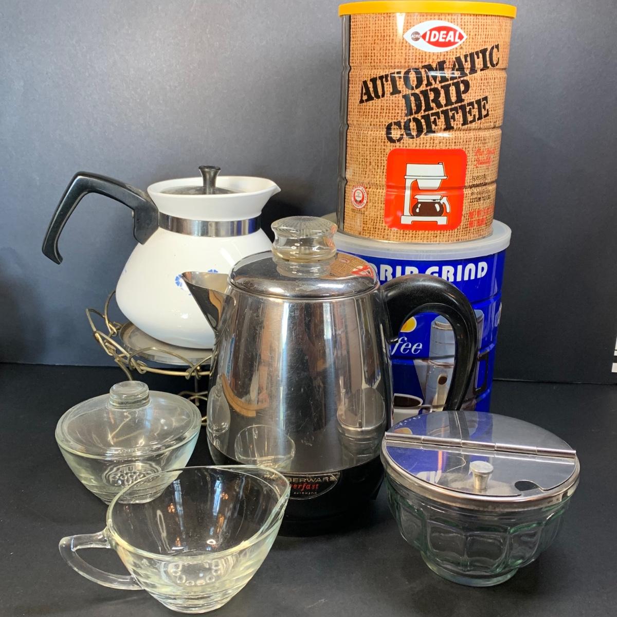 LOT 57R: Corning Cornflower Blue 6 Cup Tea/Coffee Pot, Farberware Automatic Percolator Coffee Pot, Coffee Tins & More