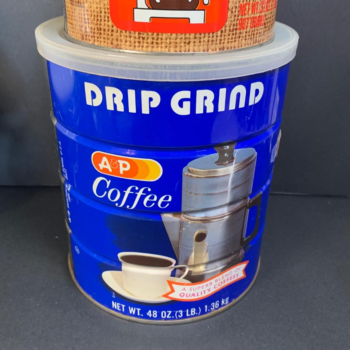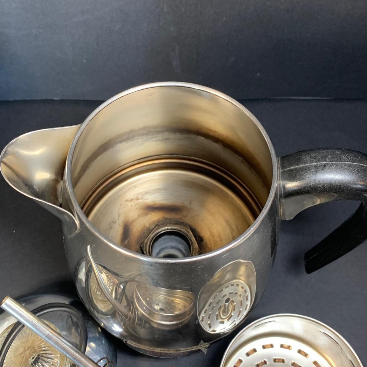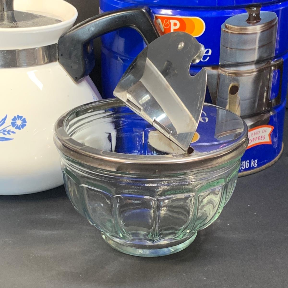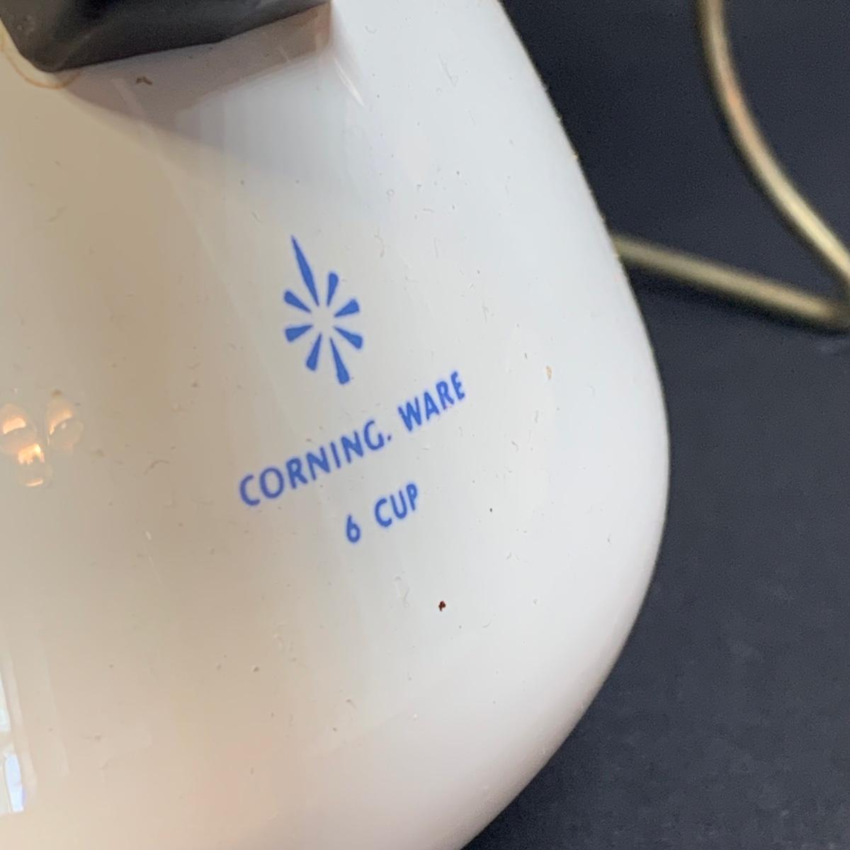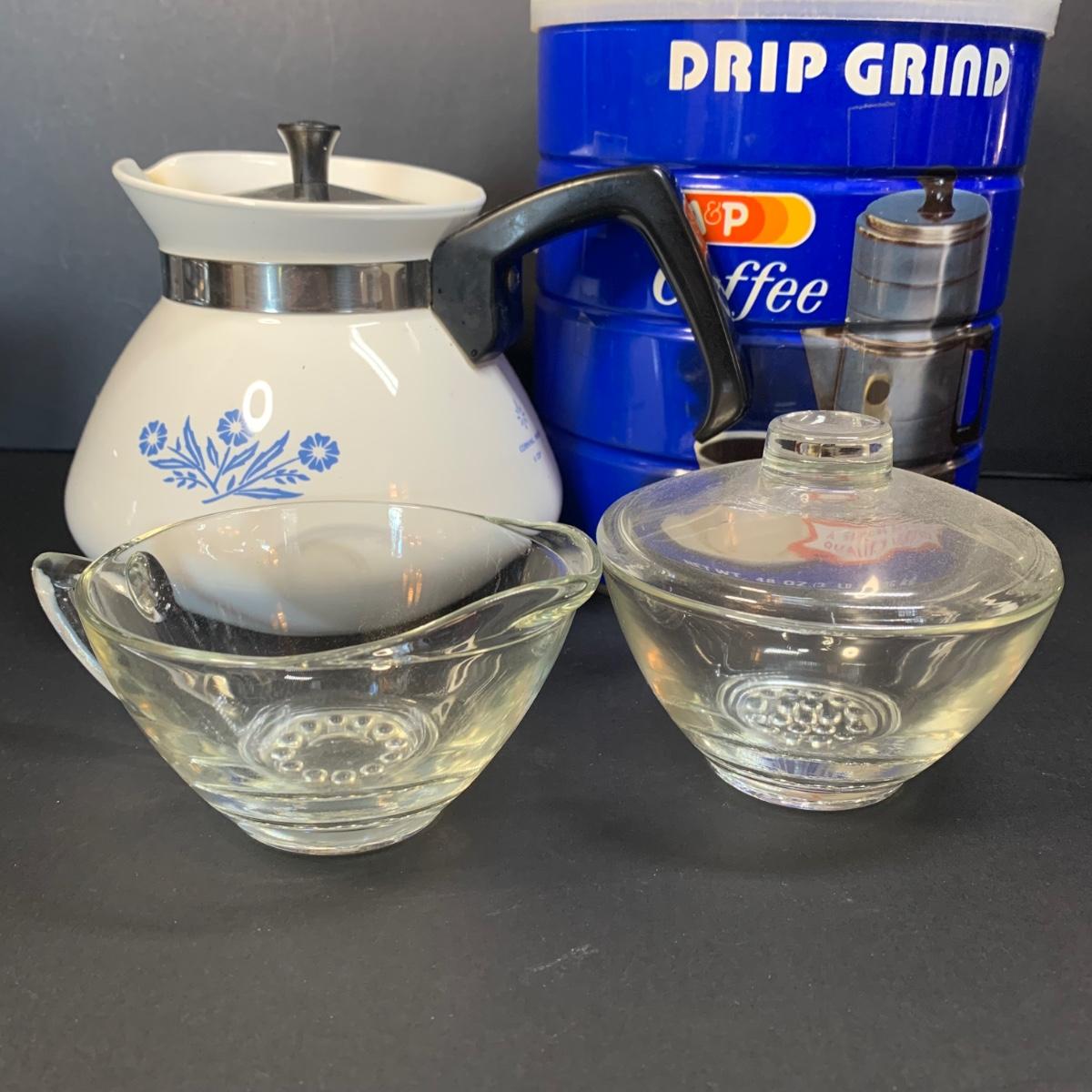 LOT 57R: Corning Cornflower Blue 6 Cup Tea/Coffee Pot, Farberware Automatic Percolator Coffee Pot, Coffee Tins & More