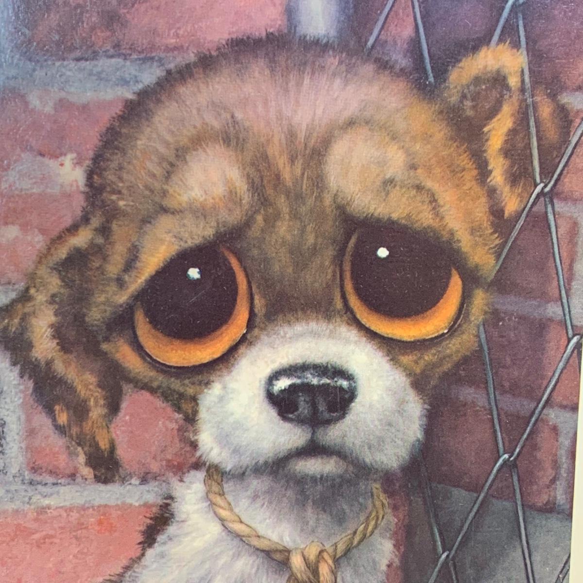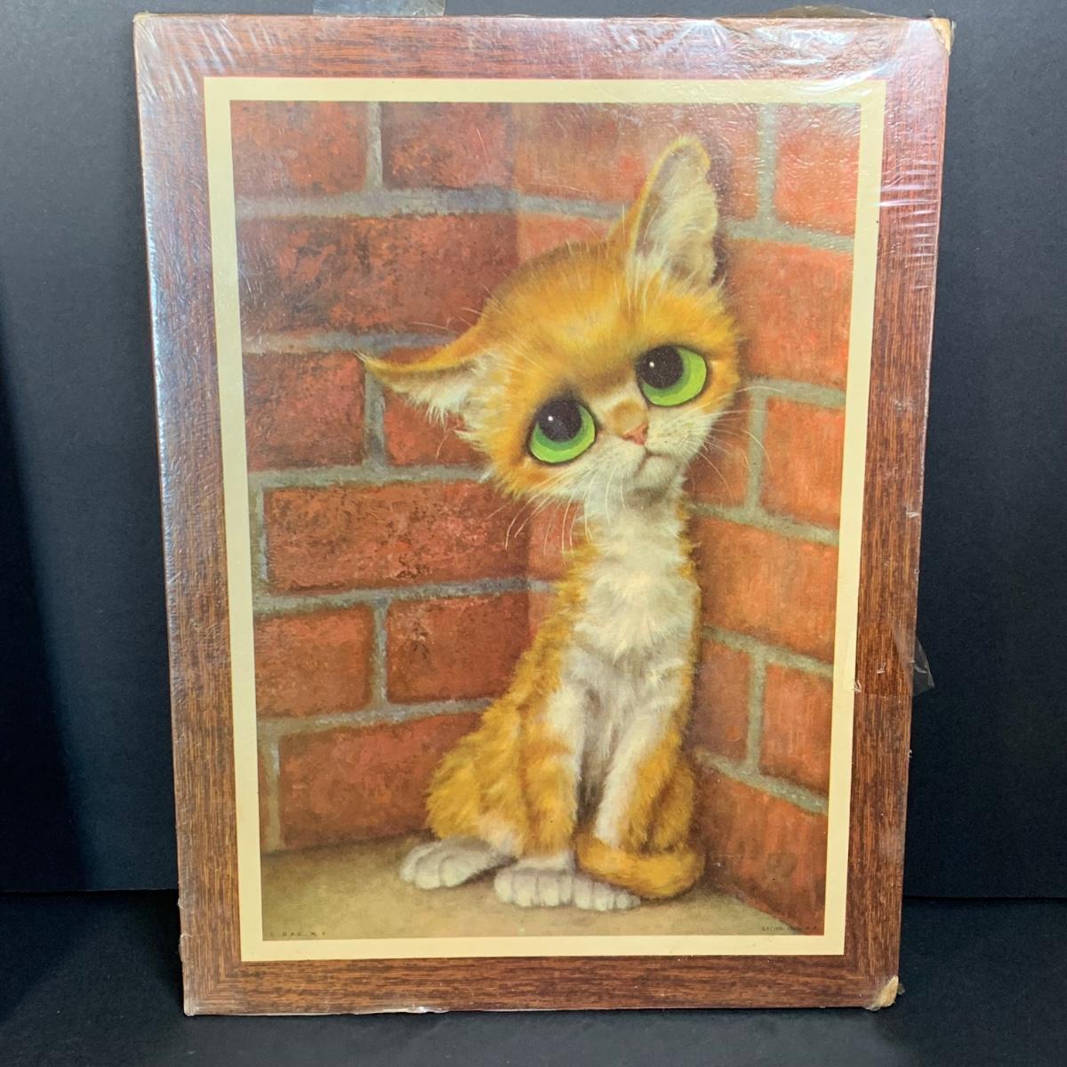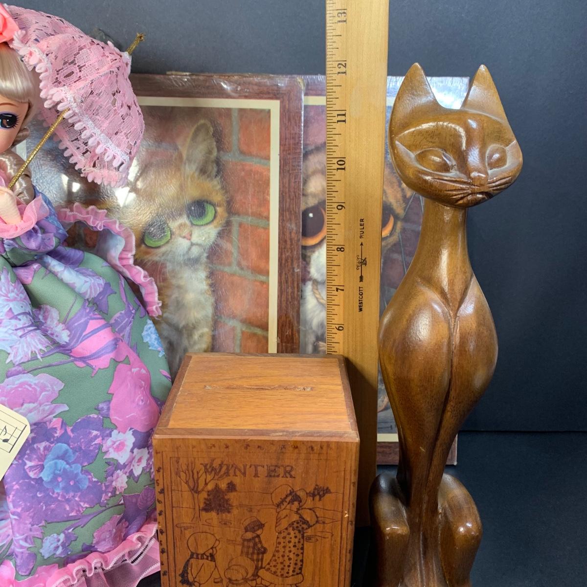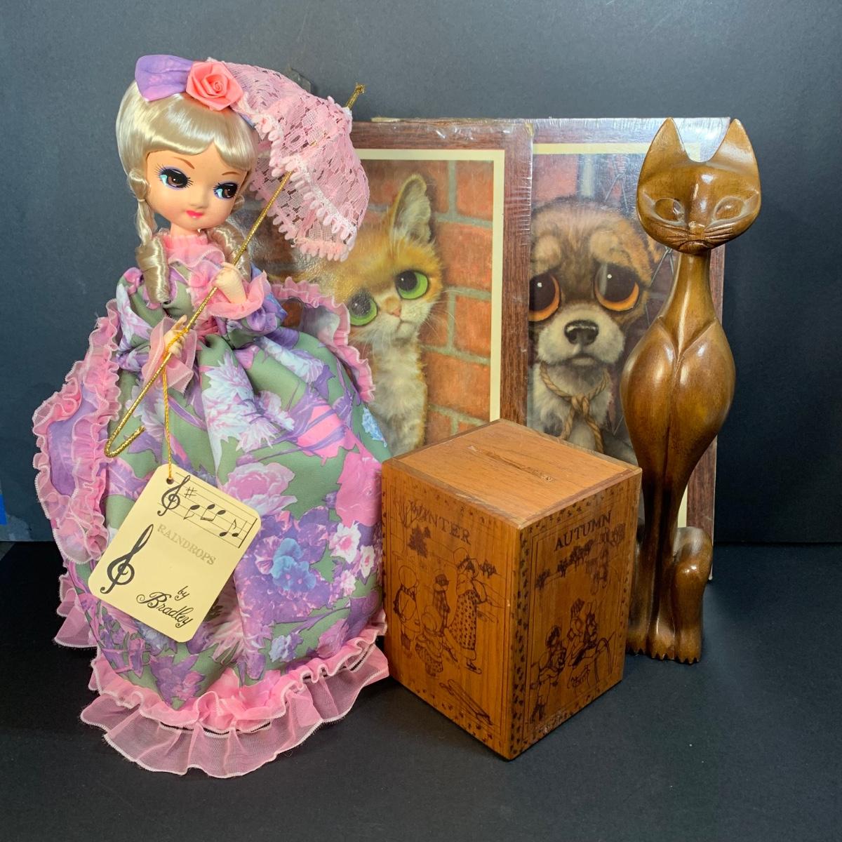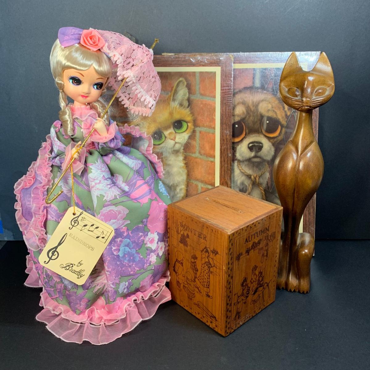 LOT 58R: Vintage Sad "Big Eyes" Cat & Dog Wall Lithograph Plaques 11"x9.25", MCM Siamese Cat Sculpture 12”, Big Eyed Musical Doll Playing Raindrops & Wooden 4-Seasons Bank