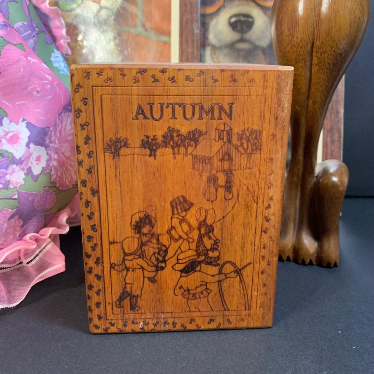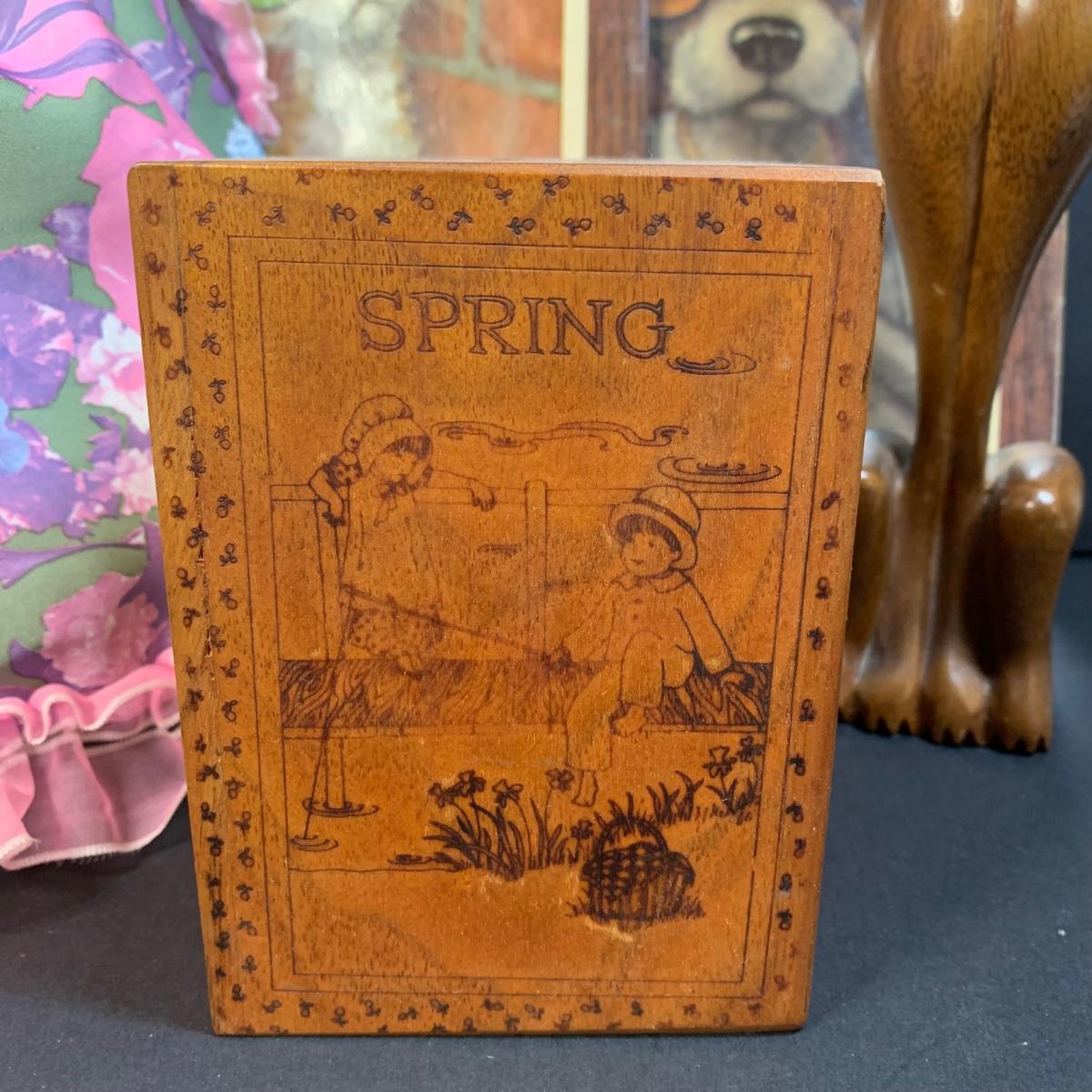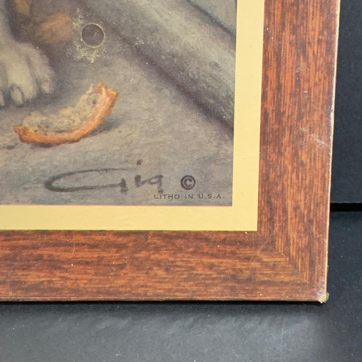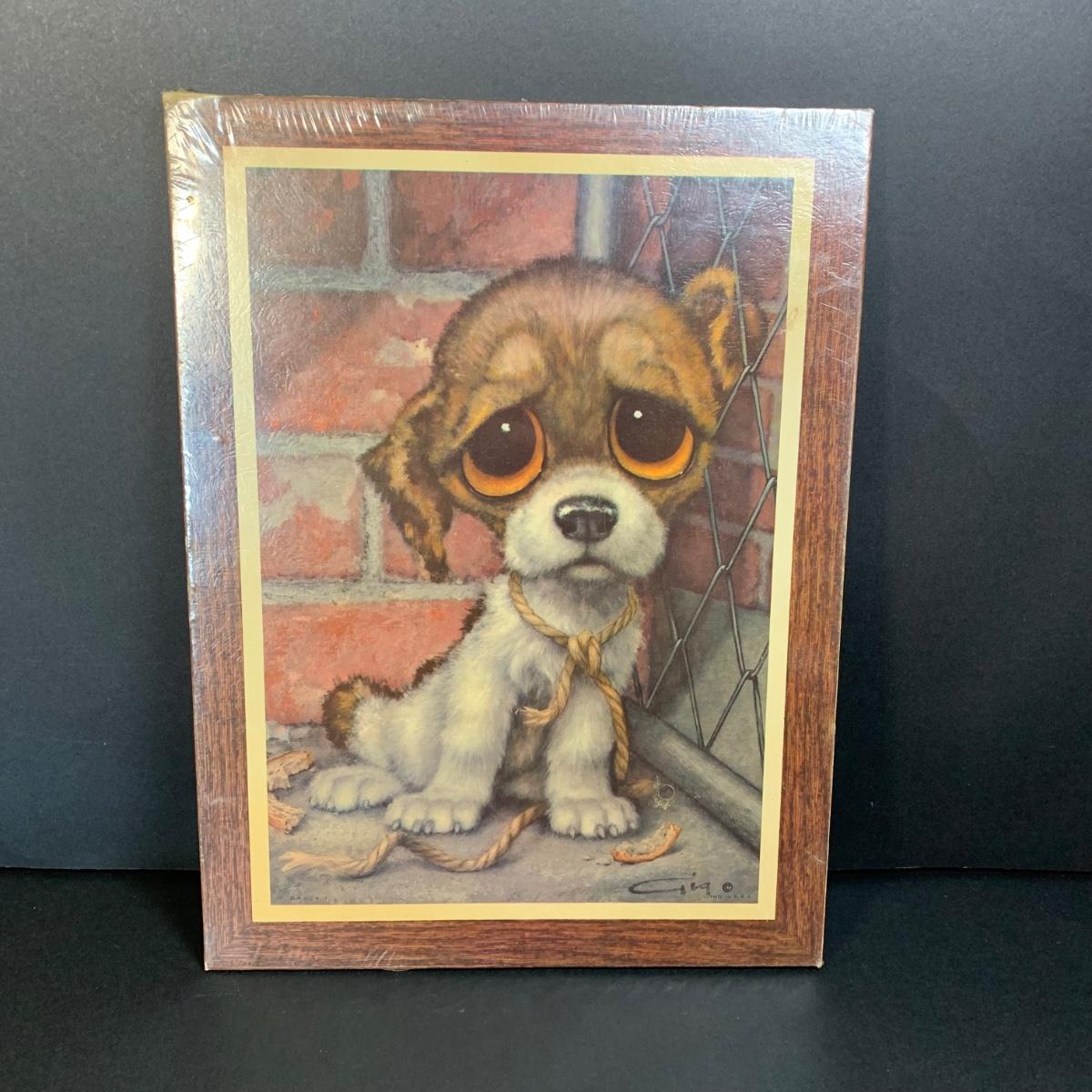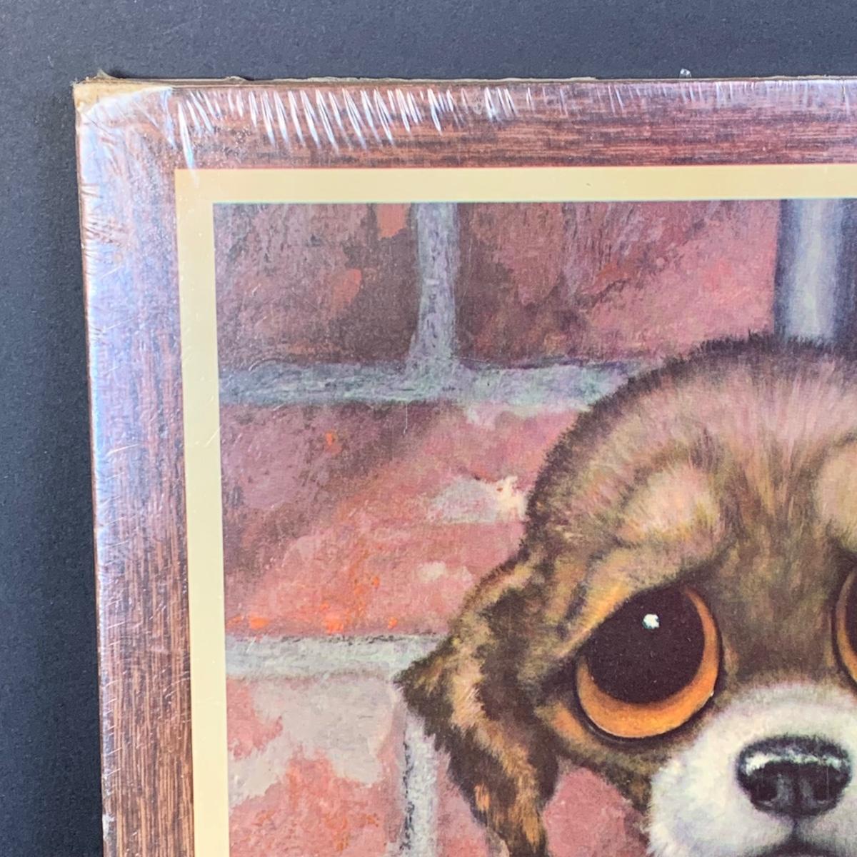LOT 58R: Vintage Sad "Big Eyes" Cat & Dog Wall Lithograph Plaques 11"x9.25", MCM Siamese Cat Sculpture 12”, Big Eyed Musical Doll Playing Raindrops & Wooden 4-Seasons Bank
